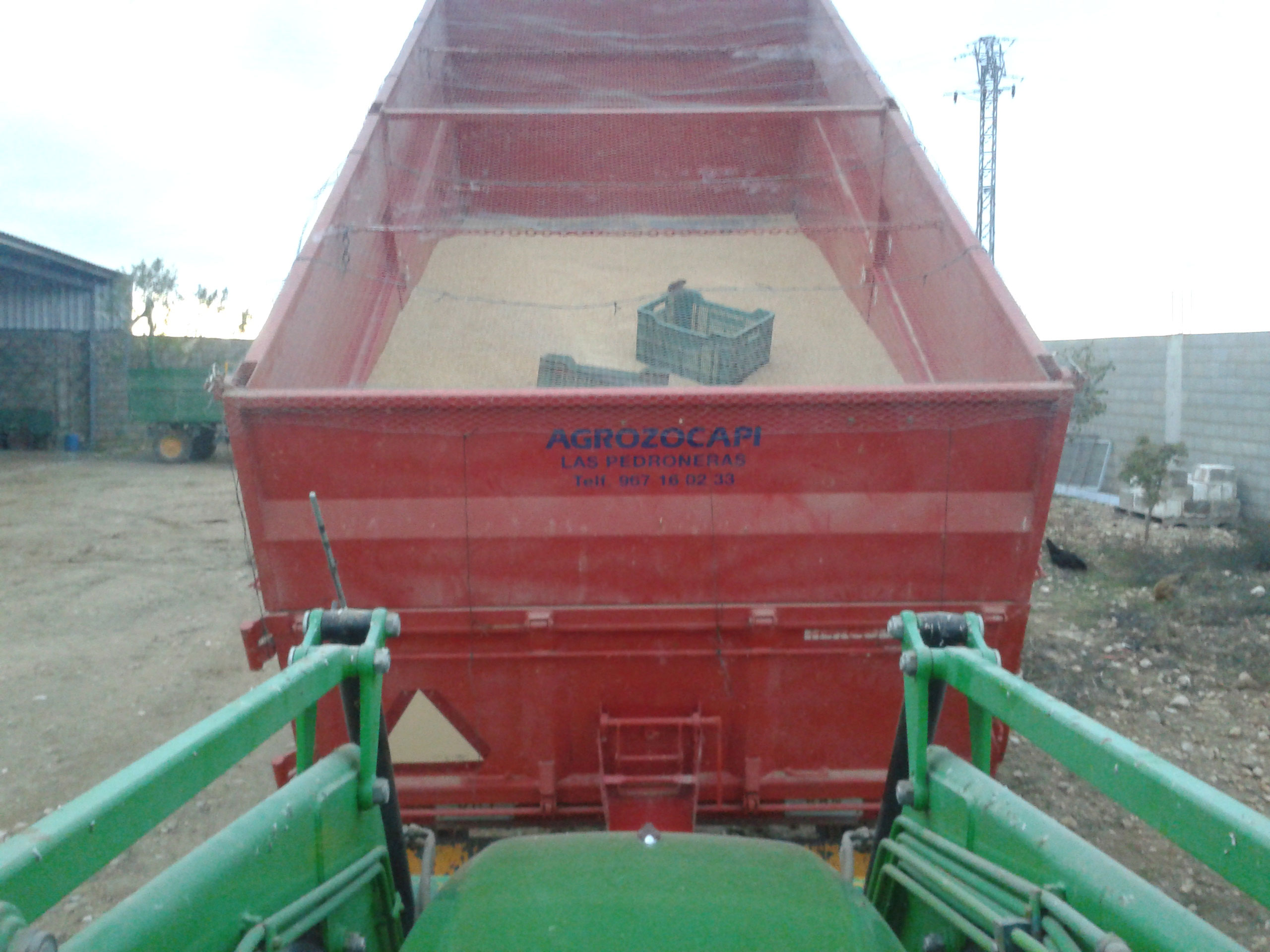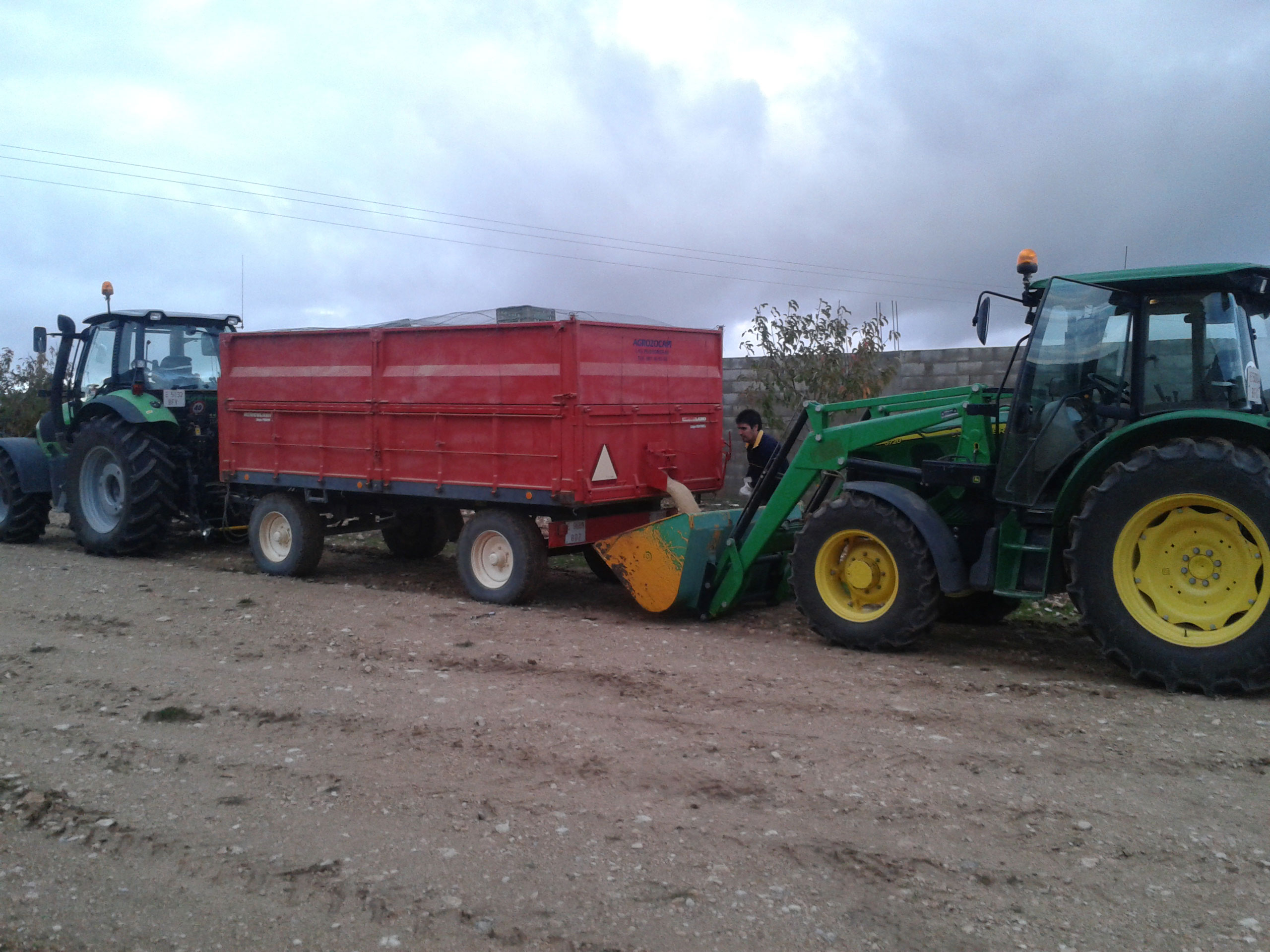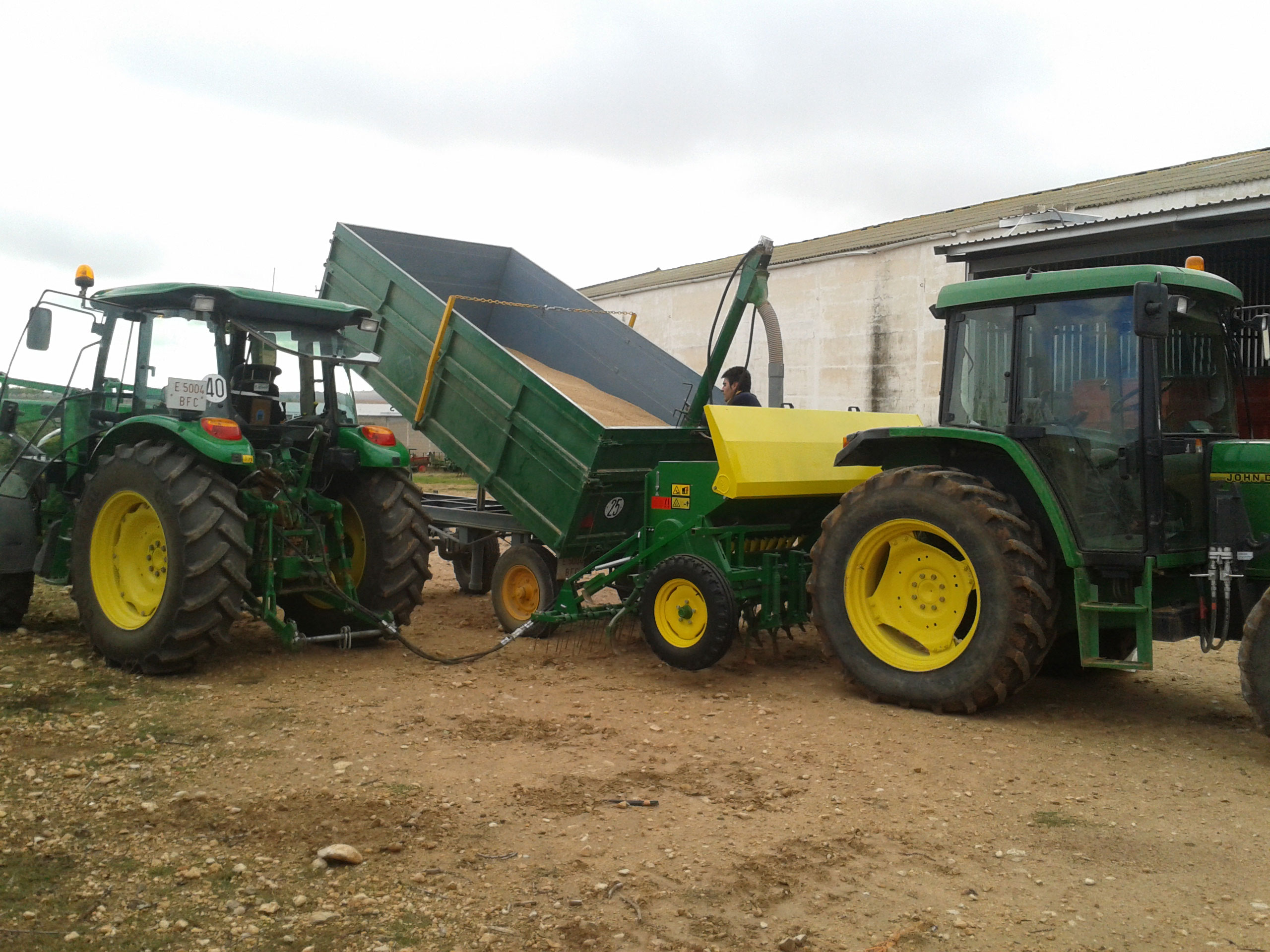 Después de esto, hemos cambiado la cebada de remolque, ya que el que tiene instalado el sinfín de descarga es el MSM verde. Para ello utilizamos la trampilla del Herculano. La tarea fue rápida gracias a la pala del tractor. Incluso tuvimos una visita inesperada… un pequeño ratón que estaba dentro del remolque (lo podéis ver en alguna fotografía). El remolque que utilizamos para sembrar y que está lleno de grano le ponemos una lona, ya que suele ser muy normal el que llueva cuando estamos sembrando, por lo que podría dañar la simiente que aún esté en el remolque.