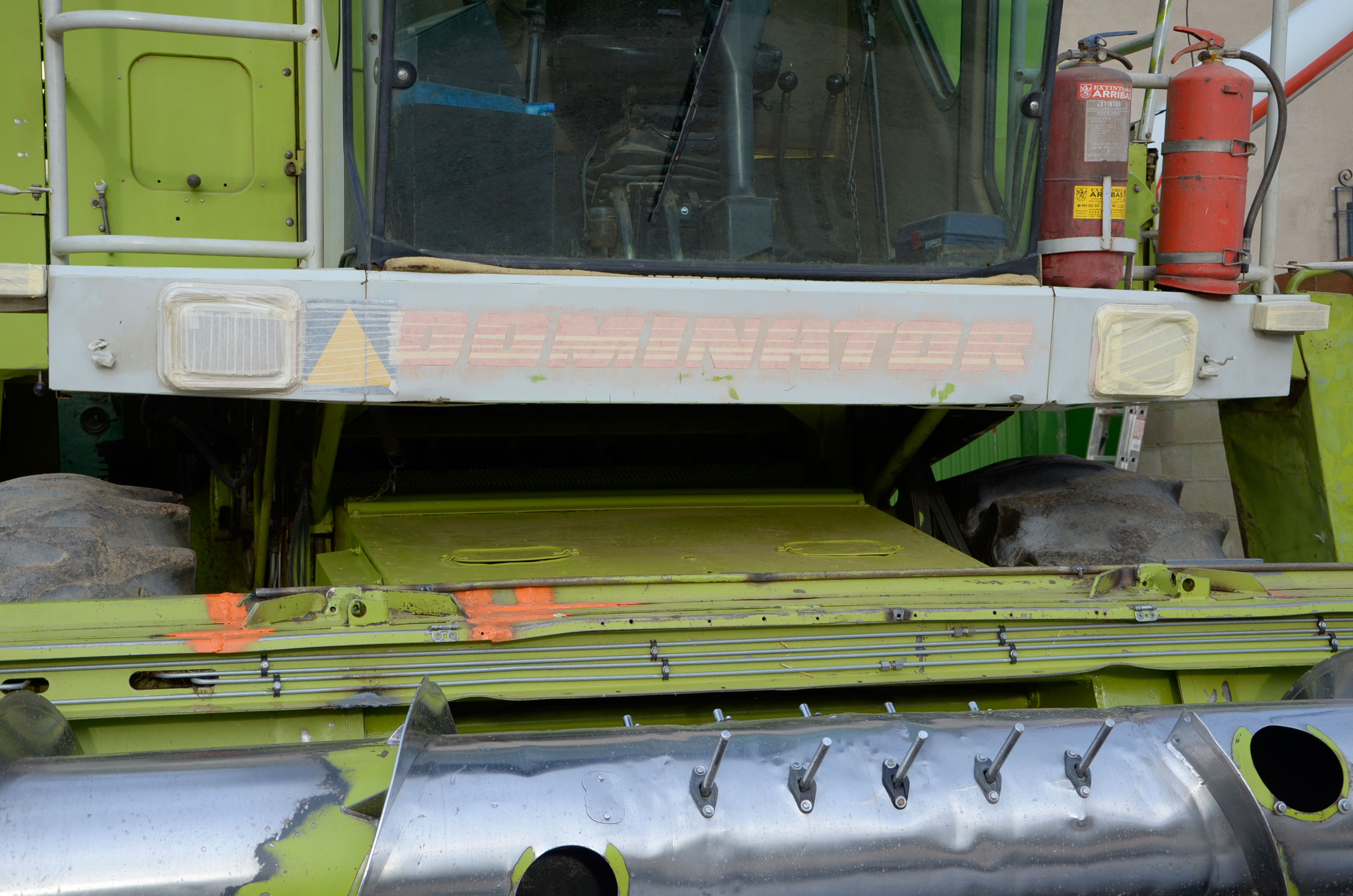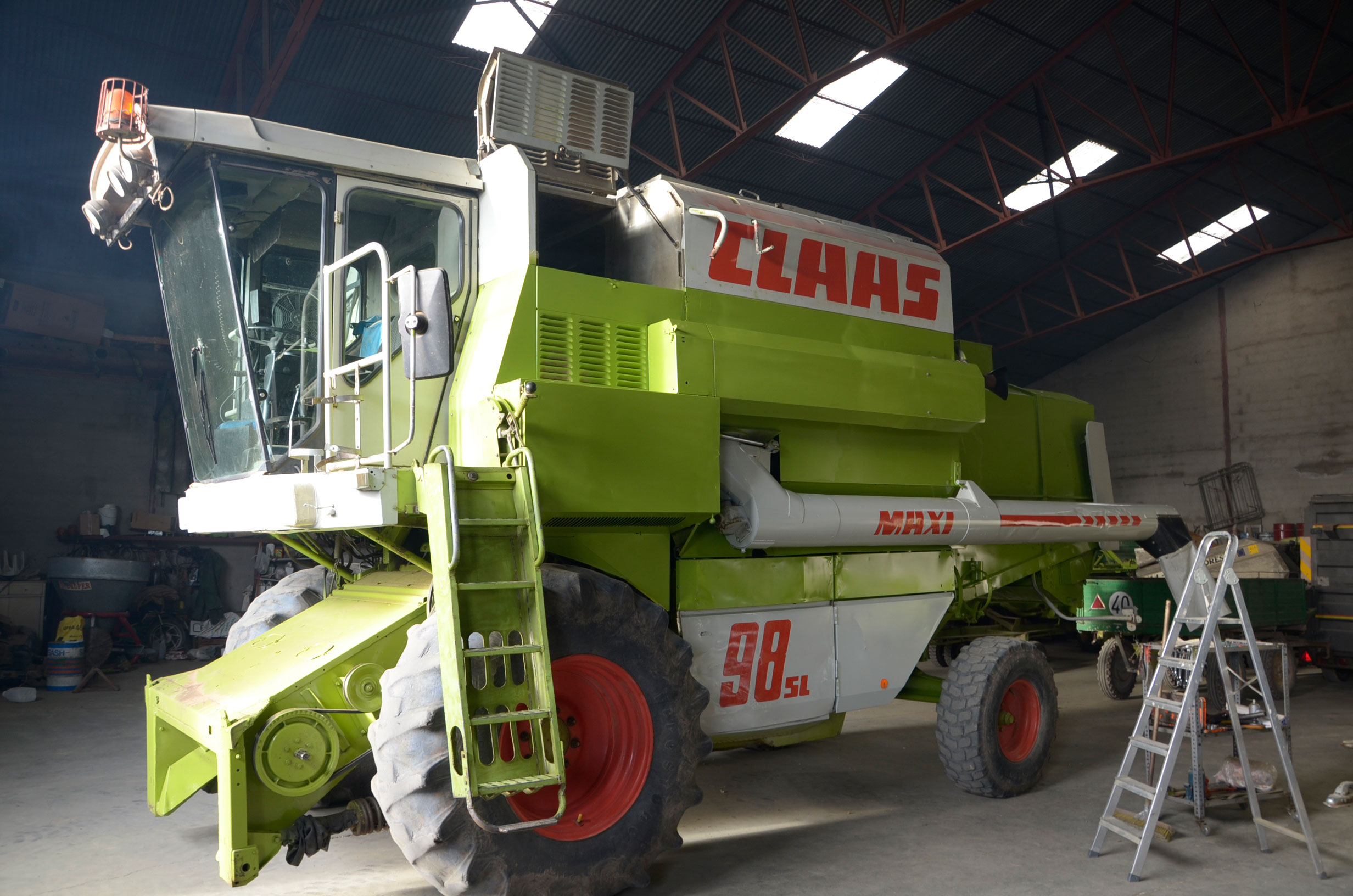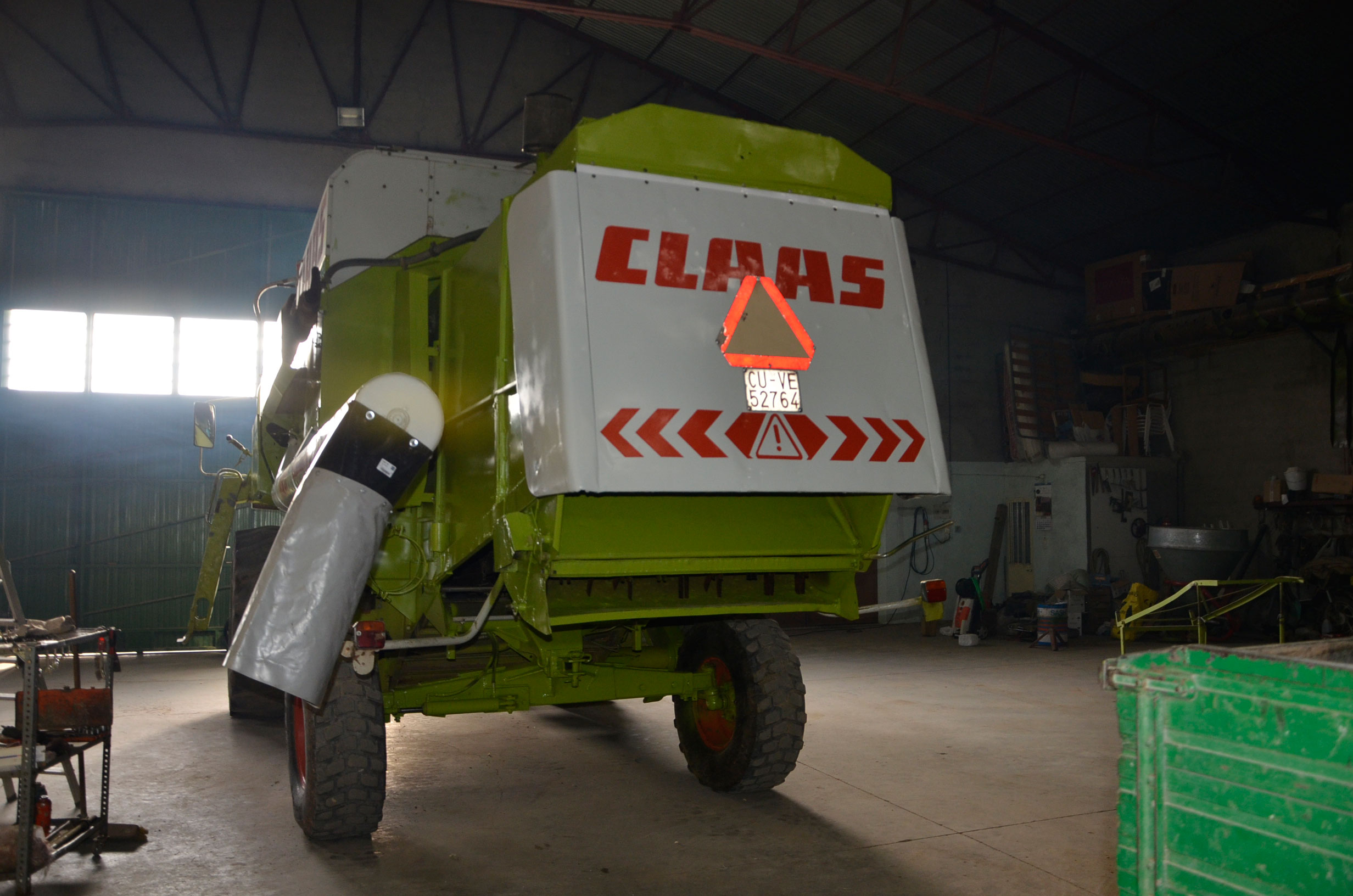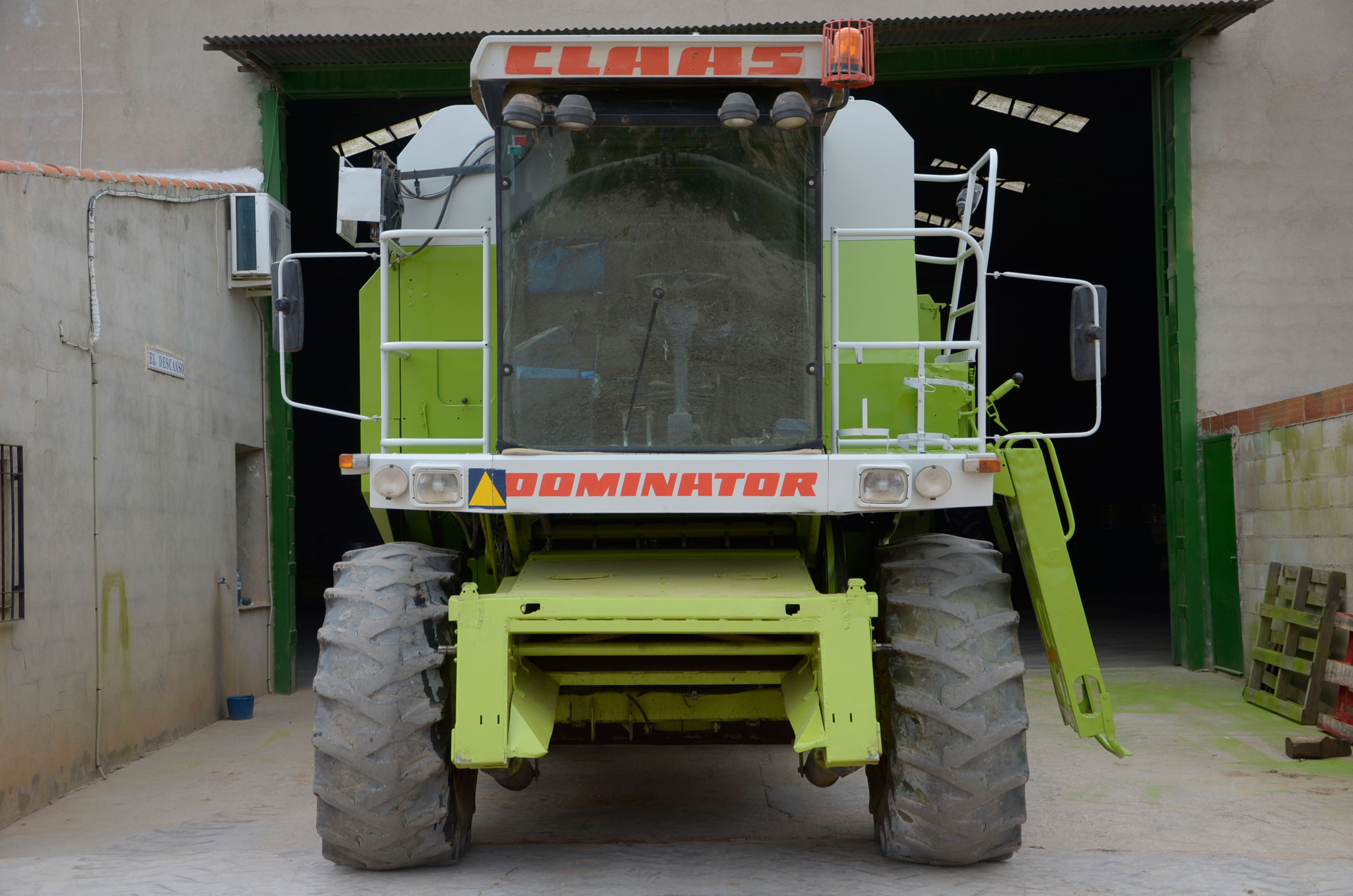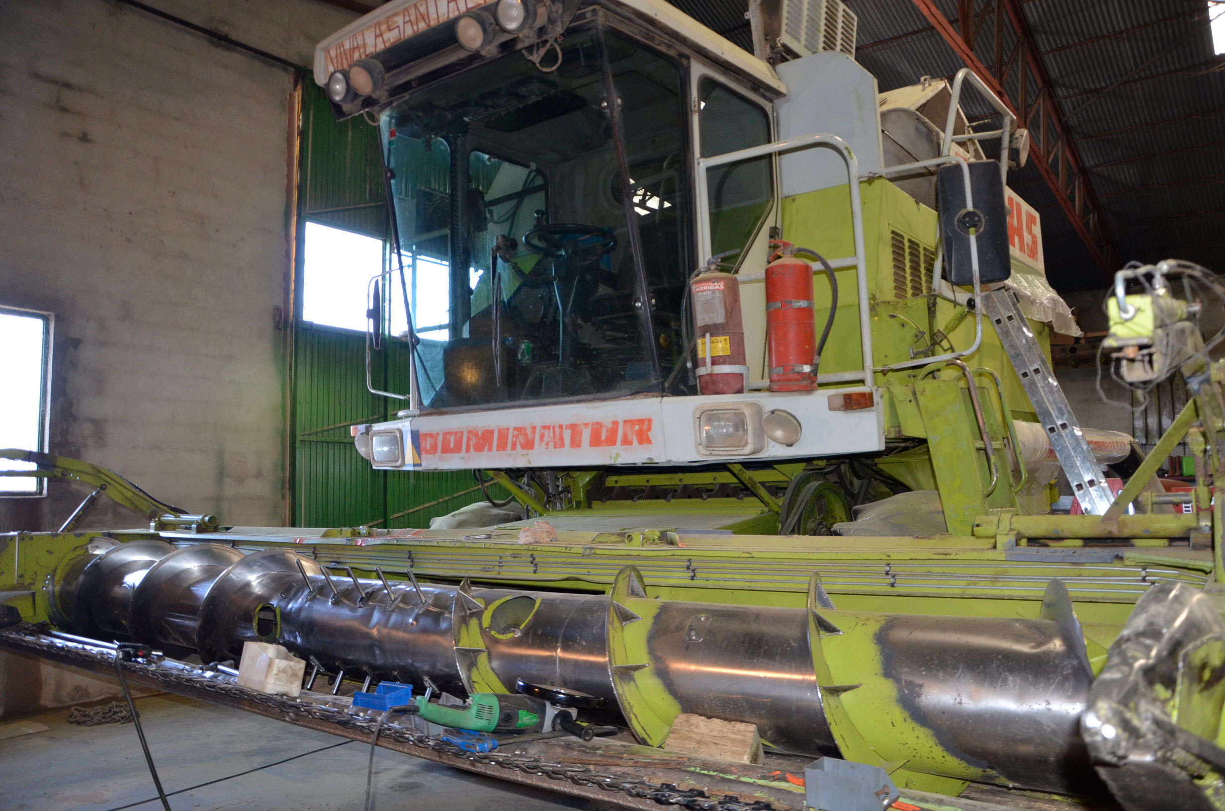 Durante estos días pintaron su antigua Claas Dominator 98 SL Maxi. Según nos comenta, la compró en 1988 y tiene cerca de 27.000 horas de trabajo. Su rendimiento sigue siendo inmejorable ya que cualquier pieza gastada es cambiada por una nueva, por lo que la cosechadora está completamente activa durante la campaña. Con ella comienza a cosechar alfalfa en Badajoz en los próximos días. En verano la utiliza principalmente para cosechar legumbres (pero también ayuda a las otras dos cosechadoras con el cereal) en nuestro pueblo y en pueblos cercanos, terminando en otoño con la cosecha del girasol.