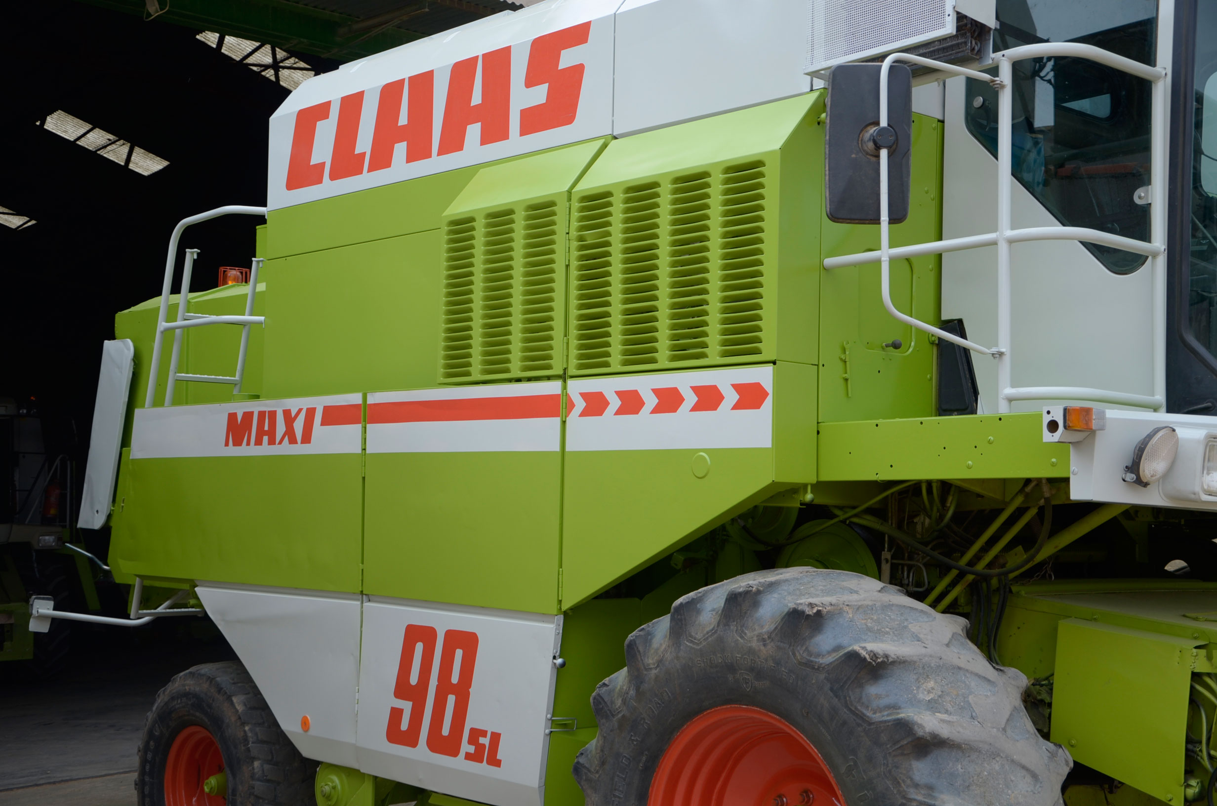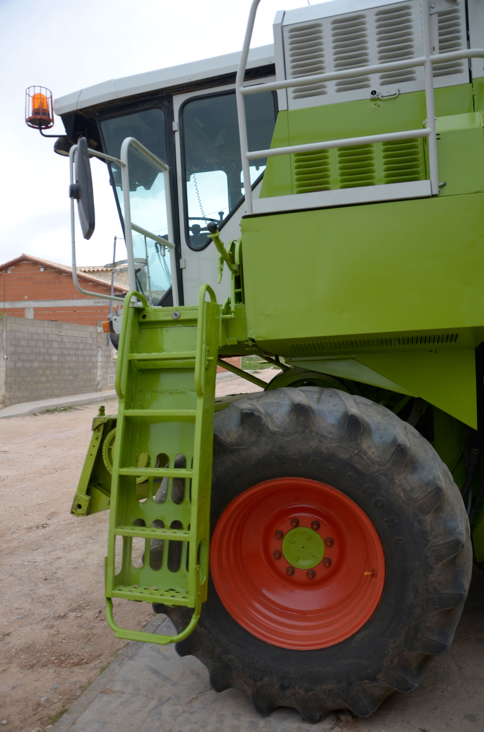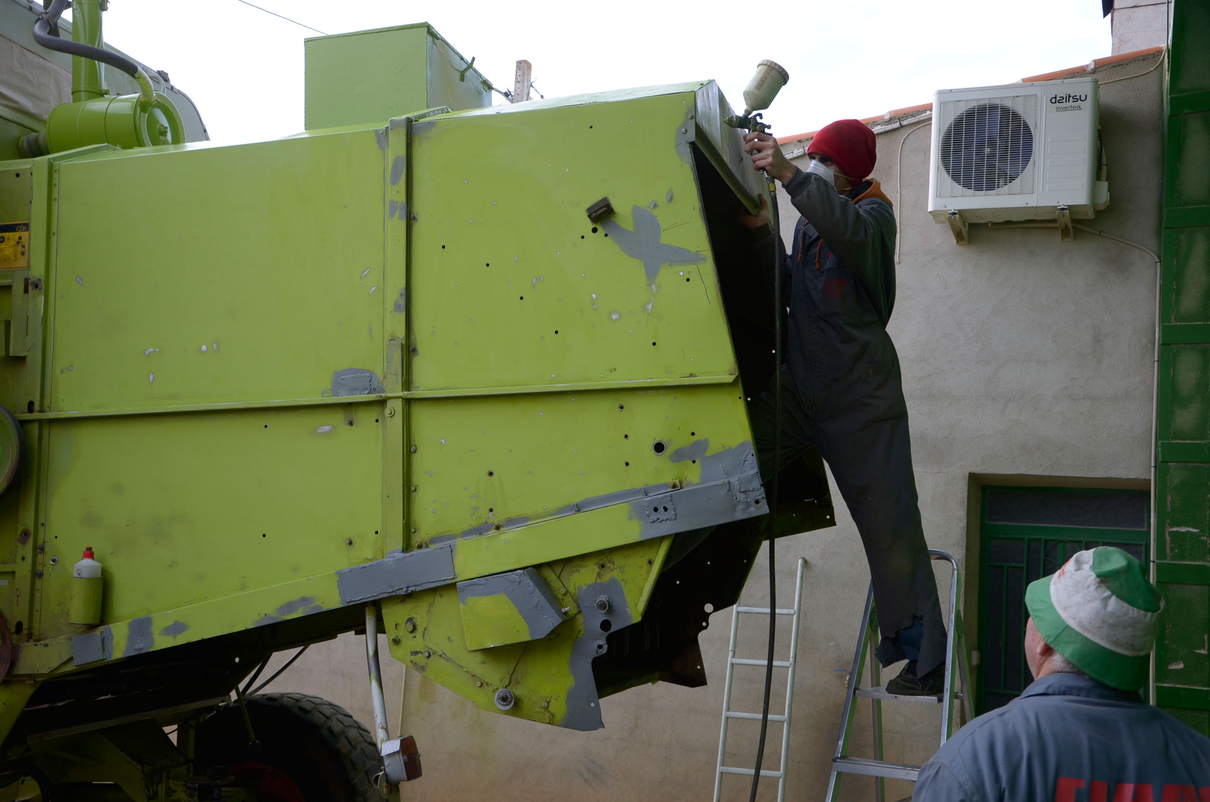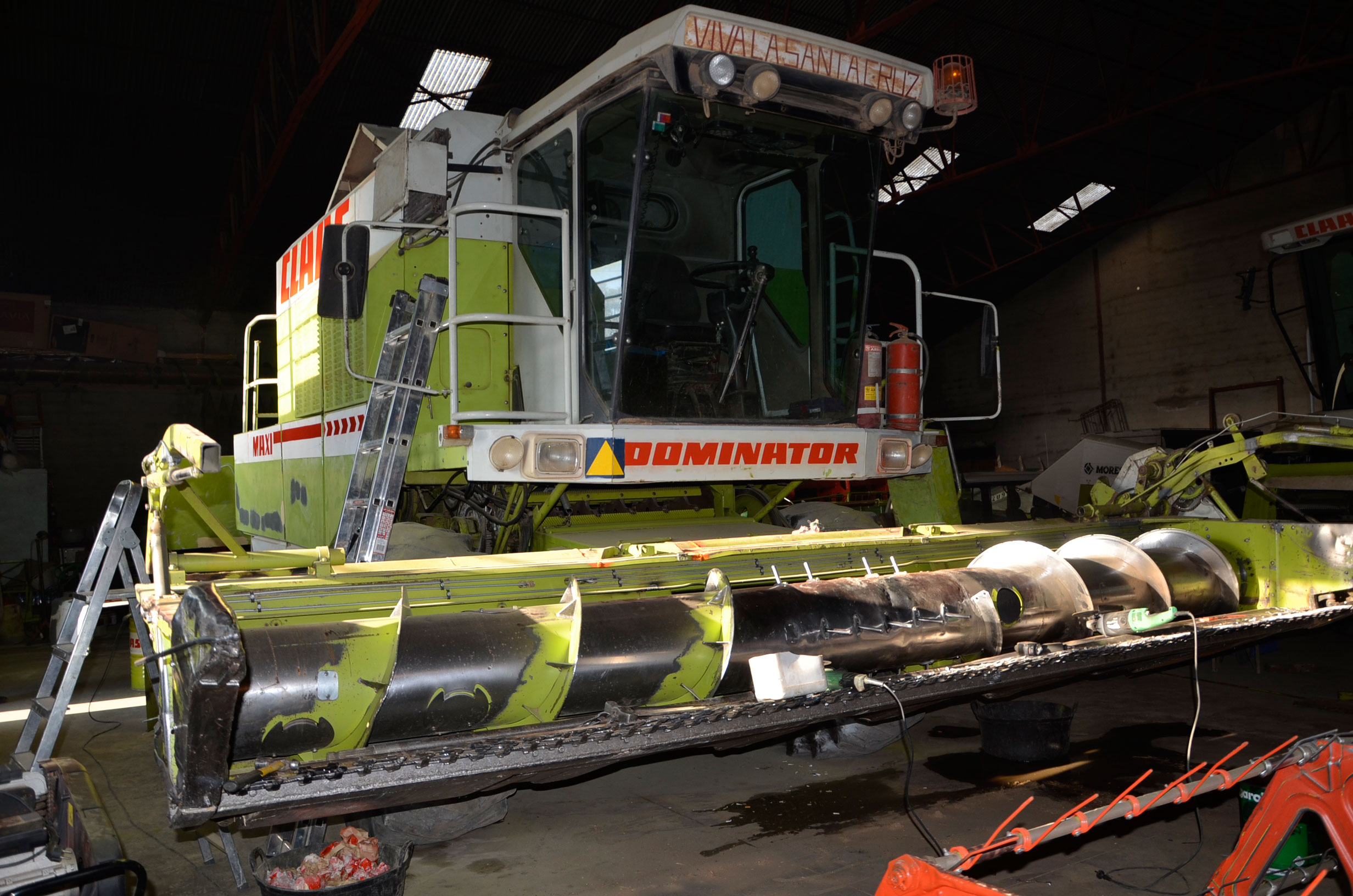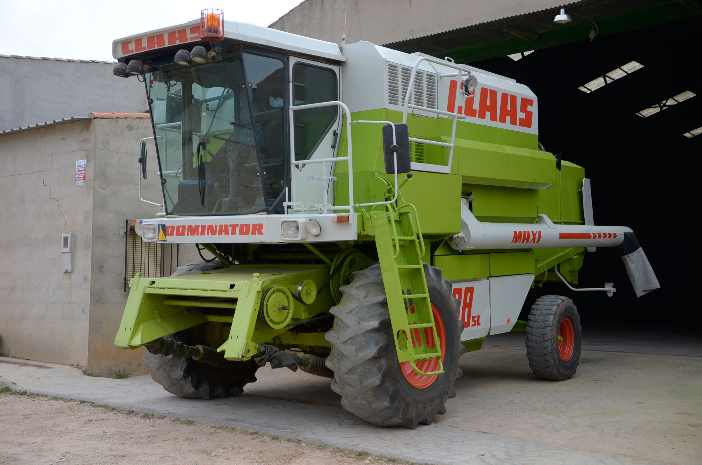 Durante estos días pintaron su antigua Claas Dominator 98 SL Maxi. Según nos comenta, la compró en 1988 y tiene cerca de 27.000 horas de trabajo. Su rendimiento sigue siendo inmejorable ya que cualquier pieza gastada es cambiada por una nueva, por lo que la cosechadora está completamente activa durante la campaña. Con ella comienza a cosechar alfalfa en Badajoz en los próximos días. En verano la utiliza principalmente para cosechar legumbres (pero también ayuda a las otras dos cosechadoras con el cereal) en nuestro pueblo y en pueblos cercanos, terminando en otoño con la cosecha del girasol.