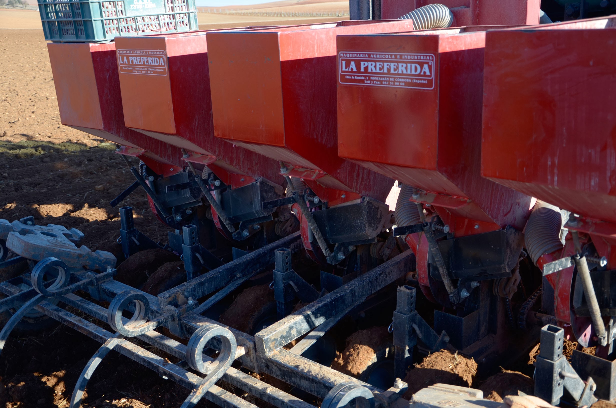 La sembradora es de la marca «La Preferida» (la fábrica está Montalbán de Córdoba) y realmente está muy bien fabricada: cada cuerpo de siembra va independiente, el chasis es muy robusto, los arados traseros también van independientes, las tolvas son bastante grandes,… creo que el único punto negativo es el ruido. La precisión de sembrado es mayor que con una sembradora mecánica por lo que te permite trabajar a mayor velocidad.