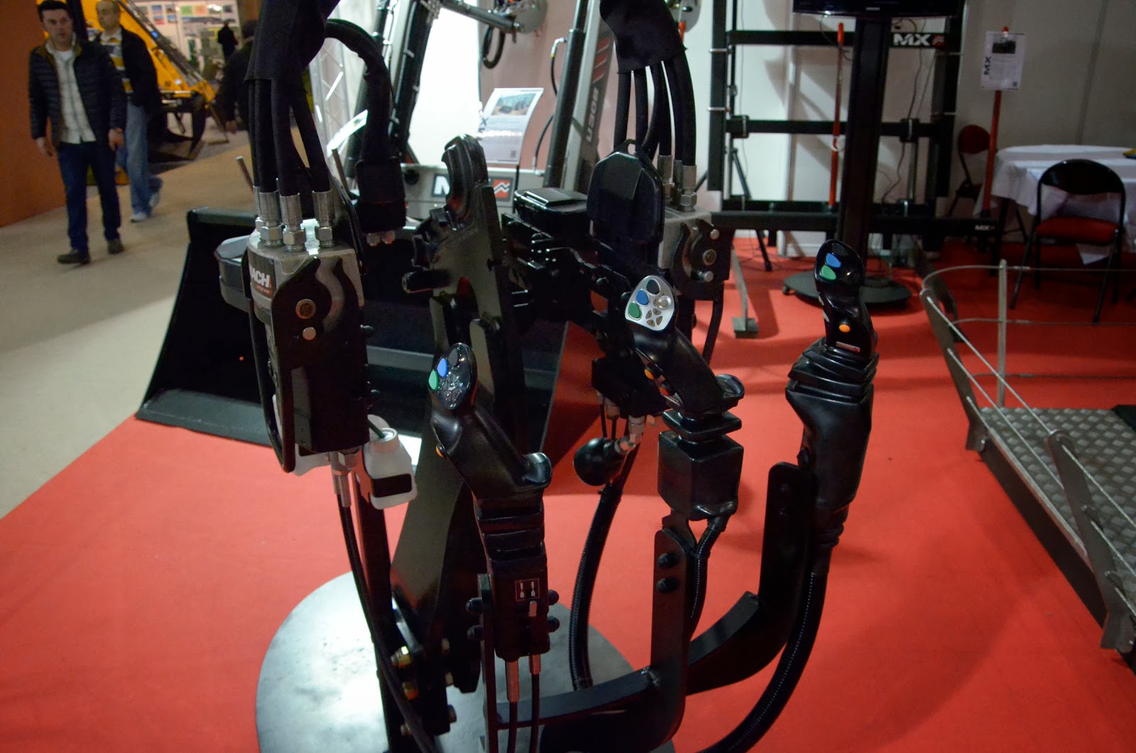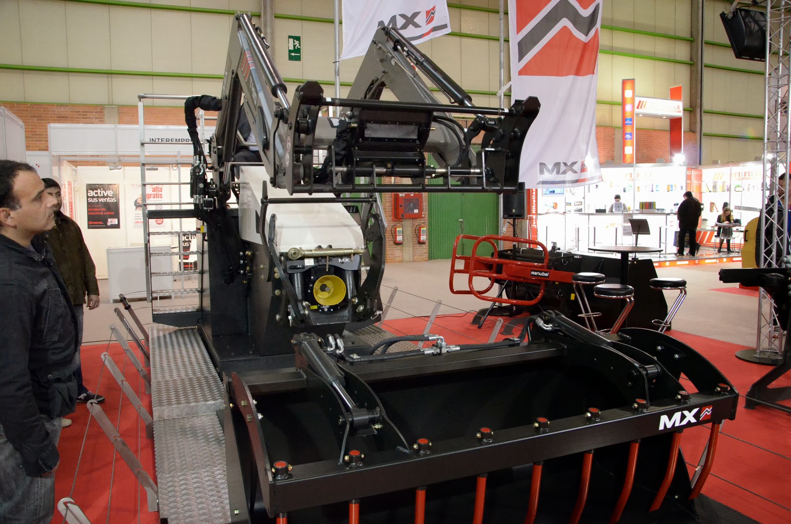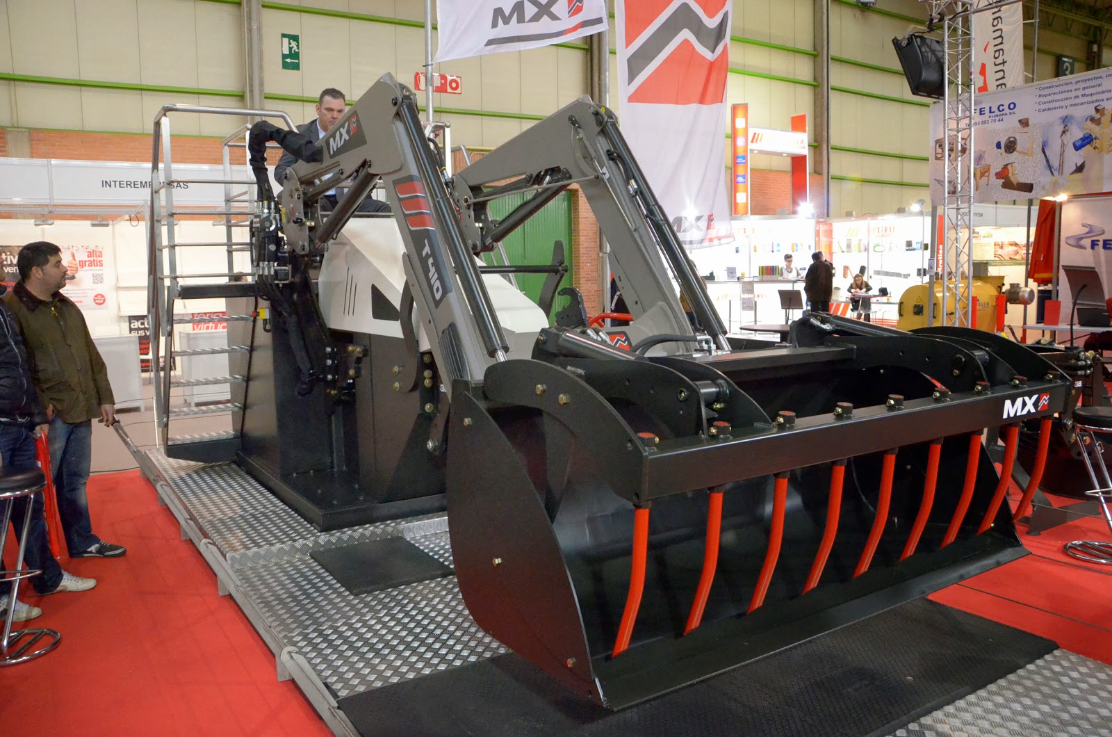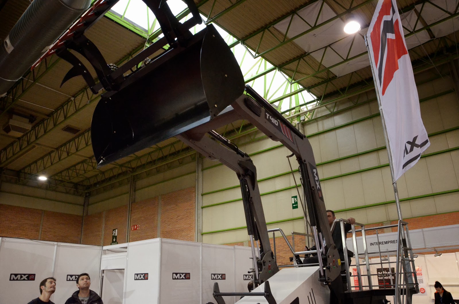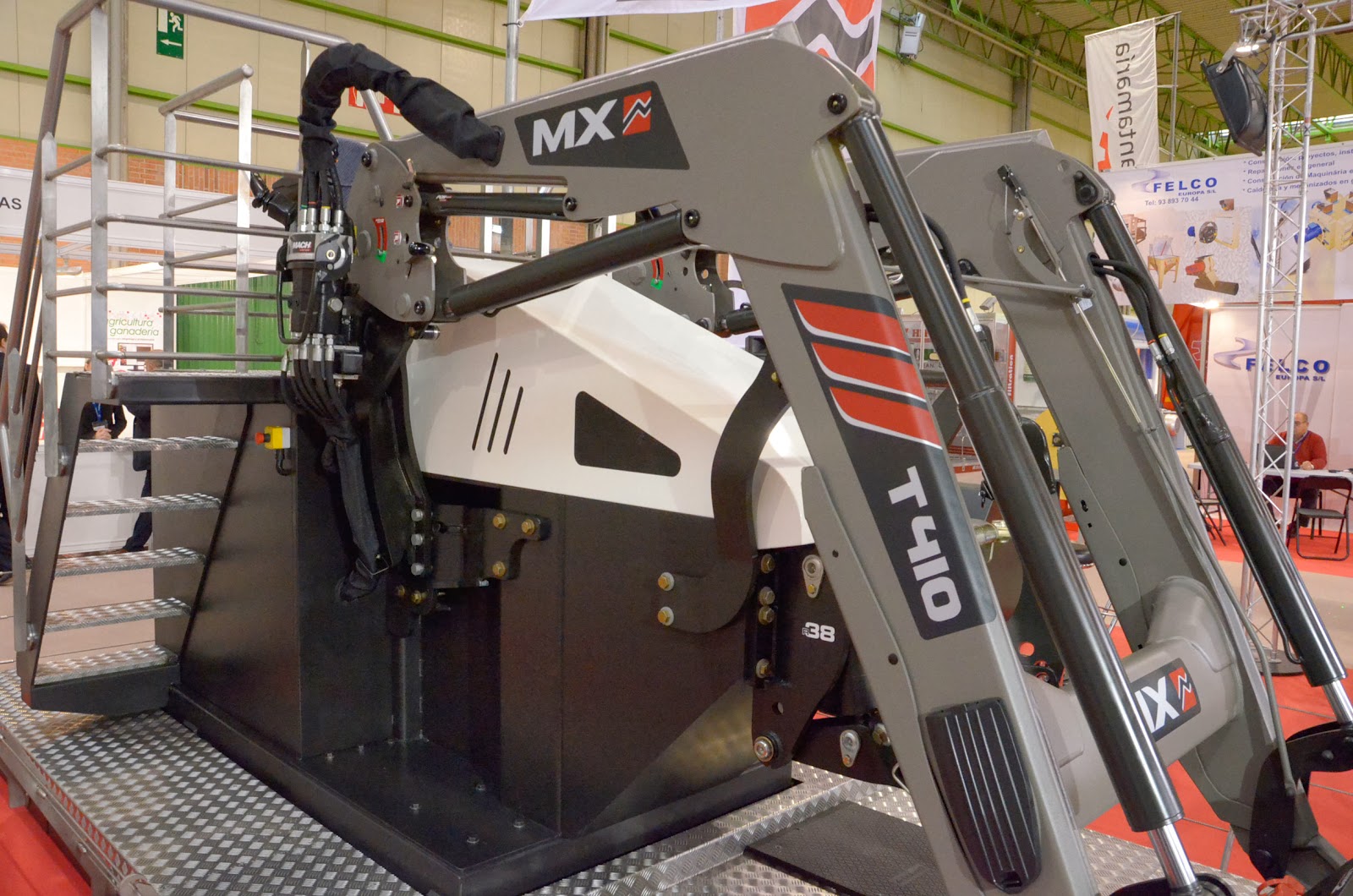 Respecto a su estancia en FIMA, la empresa de palas cargadoras MX tenía un stand muy interesante. Disponían de un simulador (que ya lo vimos en la última edición de Agritechnica) con su fantástica pala T410. Con el simulador podías probar todos los movimientos que la pala ofrece, así como probar los diferentes Joysticks que el agricultor pude montar en su tractor… extraordinaria integración de las funciones del cazo y la tercera función así como el acople y desacople del mismo de forma automática.