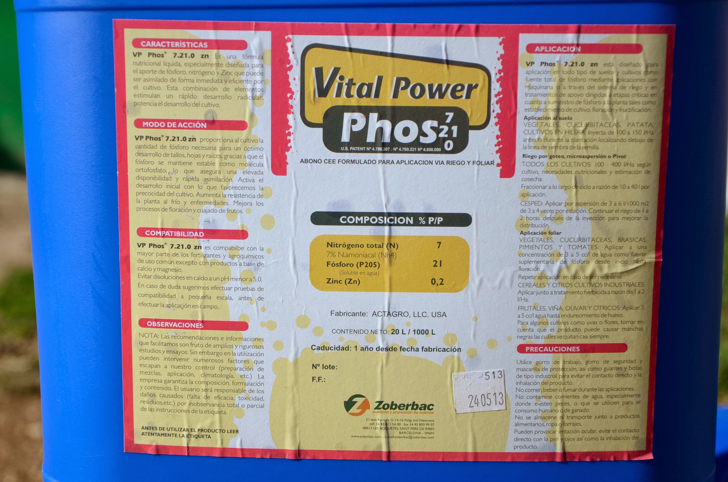 En nuestro caso, se ha hecho una aplicación del VITAL POWER PHOS (7-21-0 +0,2%Zn +7,4% Ácidos Orgánicos) que es un fertilizante complejo a base de ortofosfato orgánico enriquecido con Zinc, esta asegura el aporte de Fósforo de manera inmediata y alta disponibilidad. VITAL POWER PHOS está químicamente complejado con ácidos orgánicos (Ácidos Húmicos, Fúlvicos, Huminas y Carbohidratos) que protegen la molécula de Fósforo, haciéndolo 4 veces más eficaz que el resto de Fósforos. Es la única molécula de Fósforo existente en forma de orto-fosfato complejada con ácidos orgánicos con patente de EEUU.