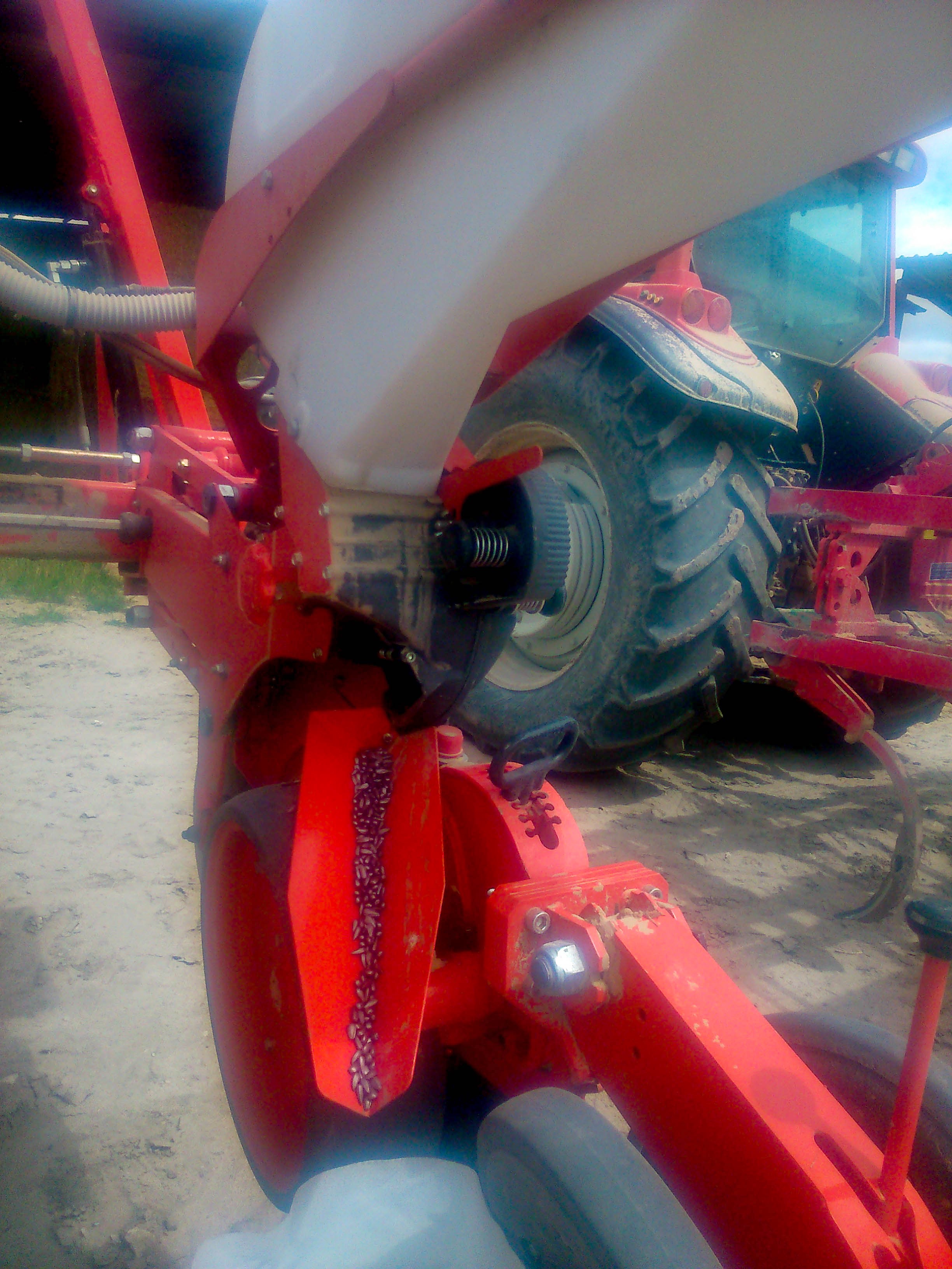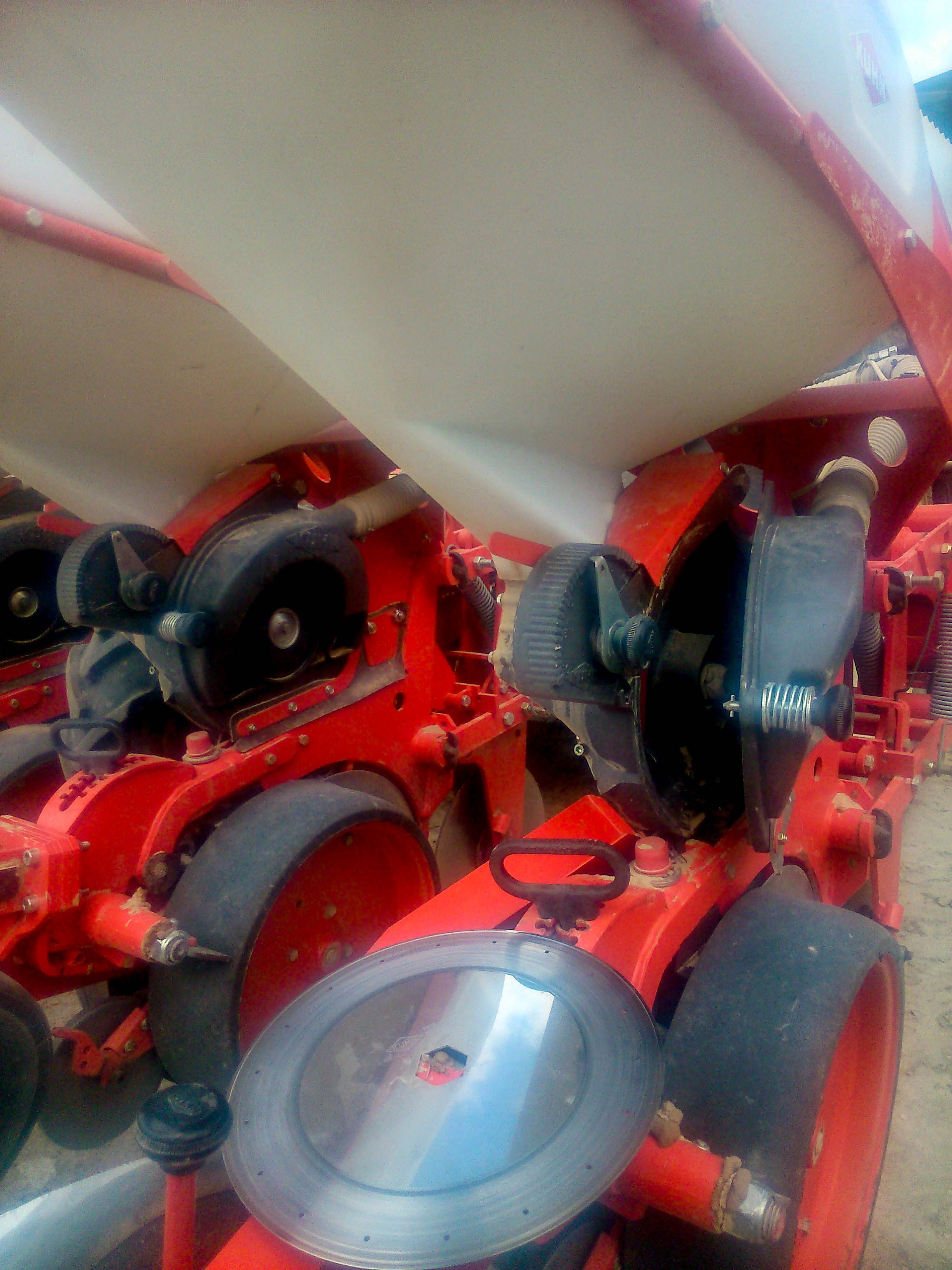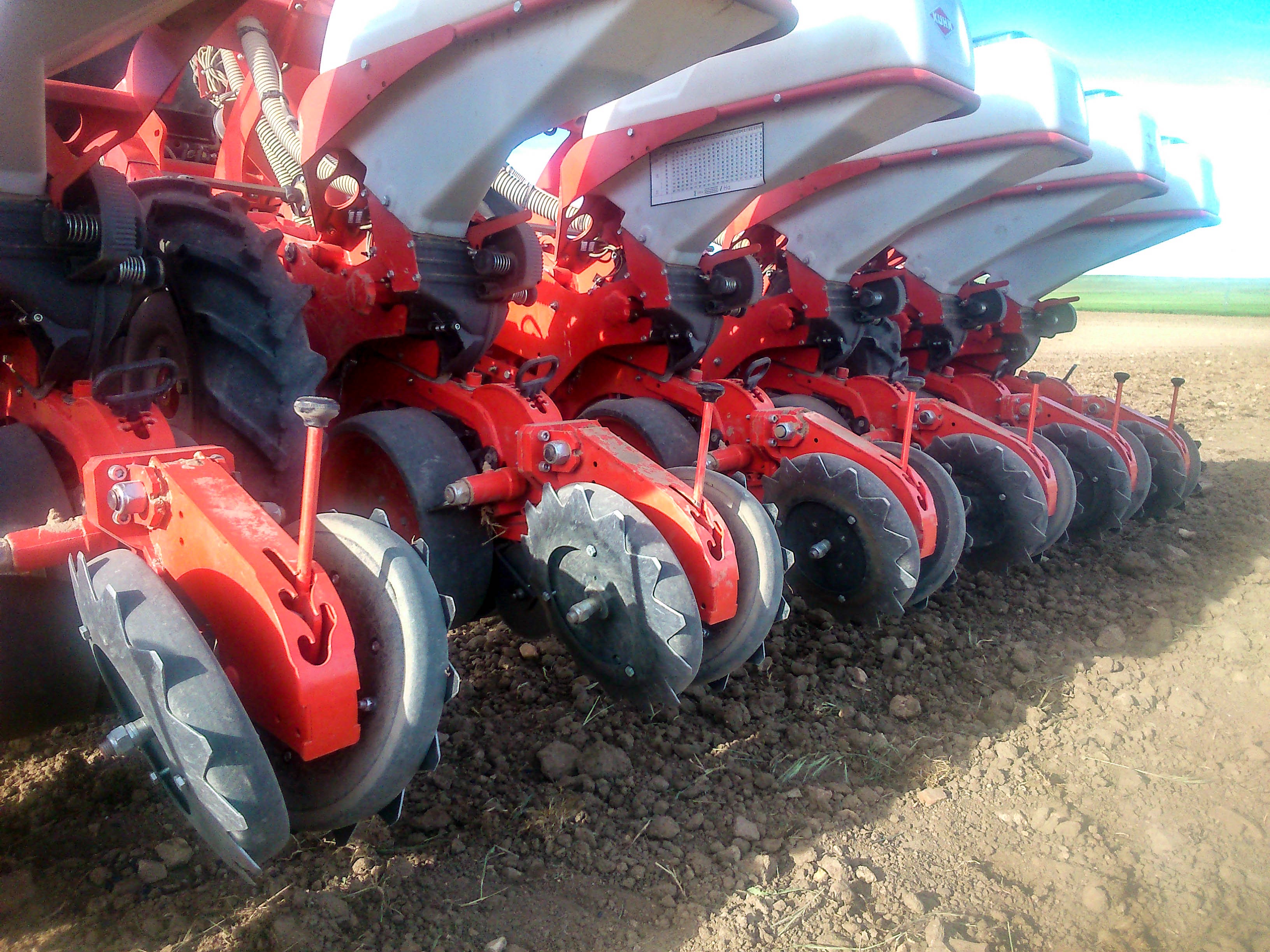 Hablando ayer por teléfono con él nos comentaba que está muy contento con esta sembradora ya que esta es la tercera campaña y no ha tenido ningún problema. El ordenador de abordo le avisa cuando algún bote no echa semilla, y eso solo le ha pasado una sola vez. Por cierto, la velocidad de trabajo nos comentaba que depende del terreno, pero normalmente es de 6,5km/h. Ha sufrido un único problema, que es el desgaste de las ruedas traseras que van inclinadas. Lo cuál ha solucionado con unos platos dentados que ha comprado en Argentina.