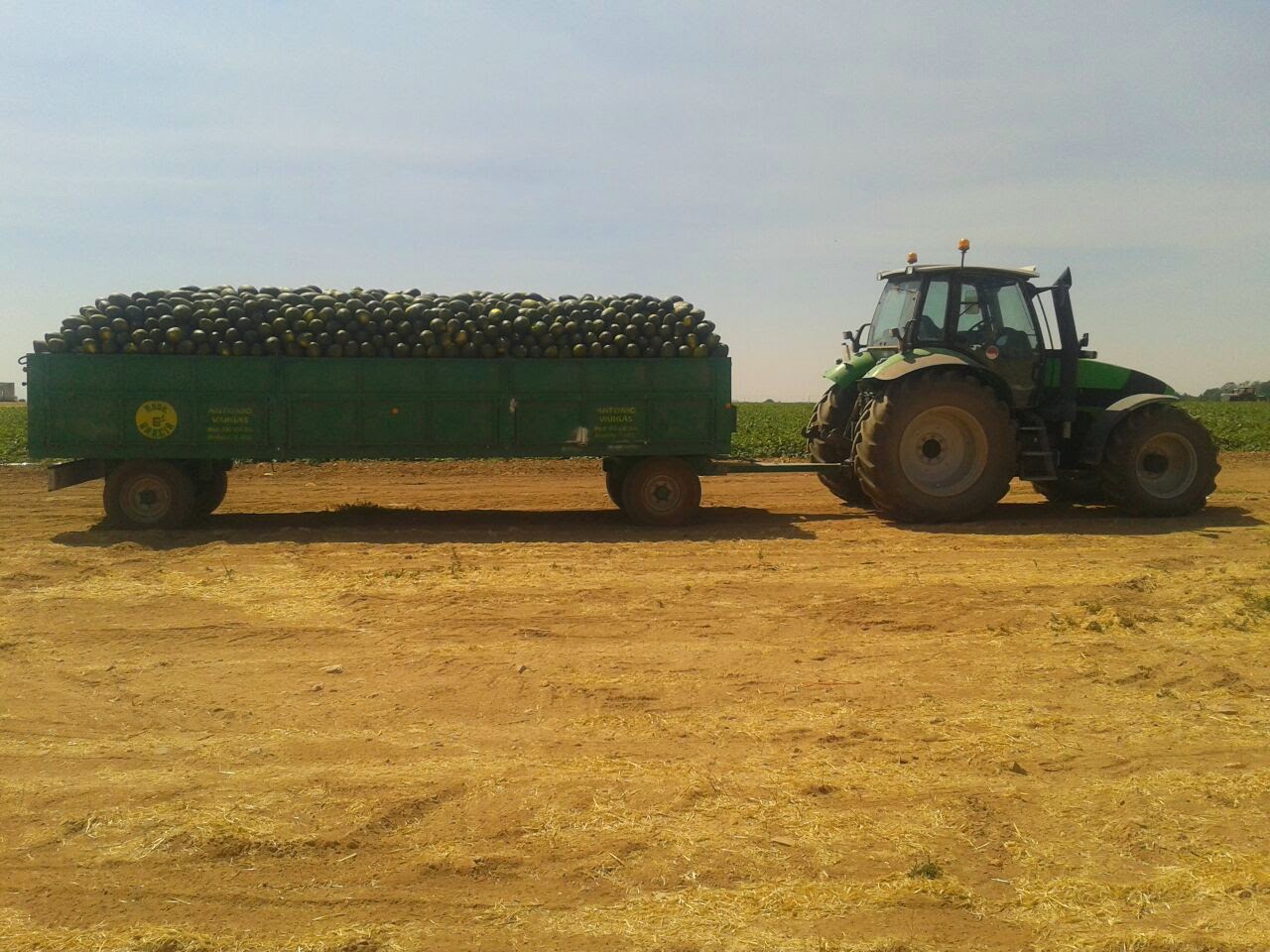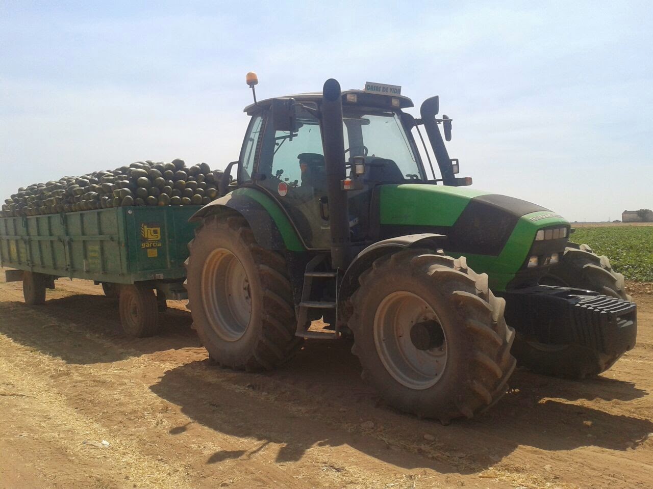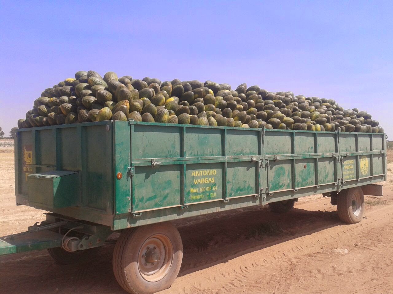 Según nos indica, una hectárea de melones puede producir unos 30.000kg en total después de recoger 4 veces los melones de cada planta. Este año el precio es bueno (en torno a 0,20€/kg) por lo que tendrán una muy buena cosecha. Nos han gustado mucho las fotos del remolque cargado completamente de melones. Según nos indica, tardan unas 2 horas en cargar los 14.000kg que transporta.