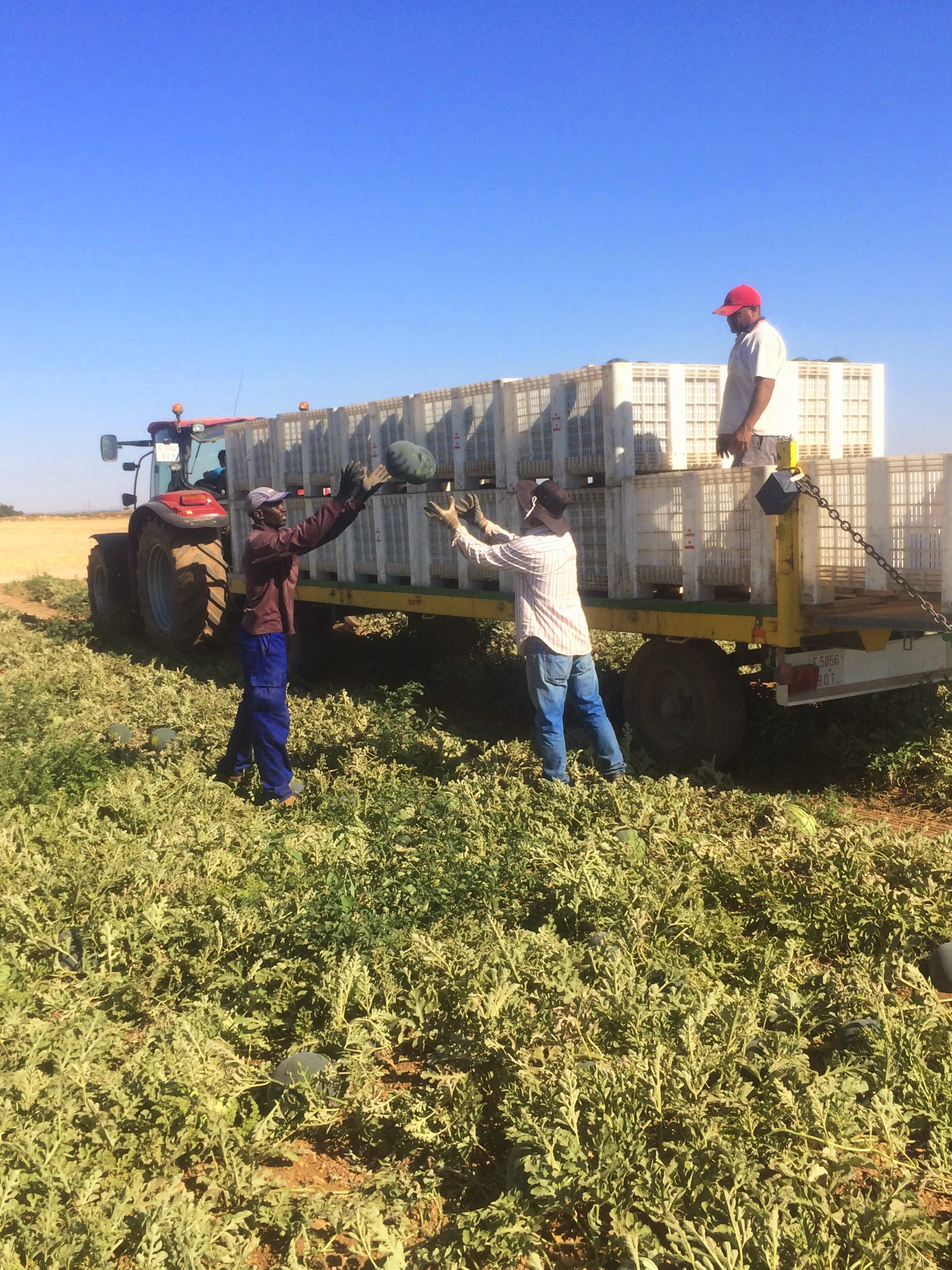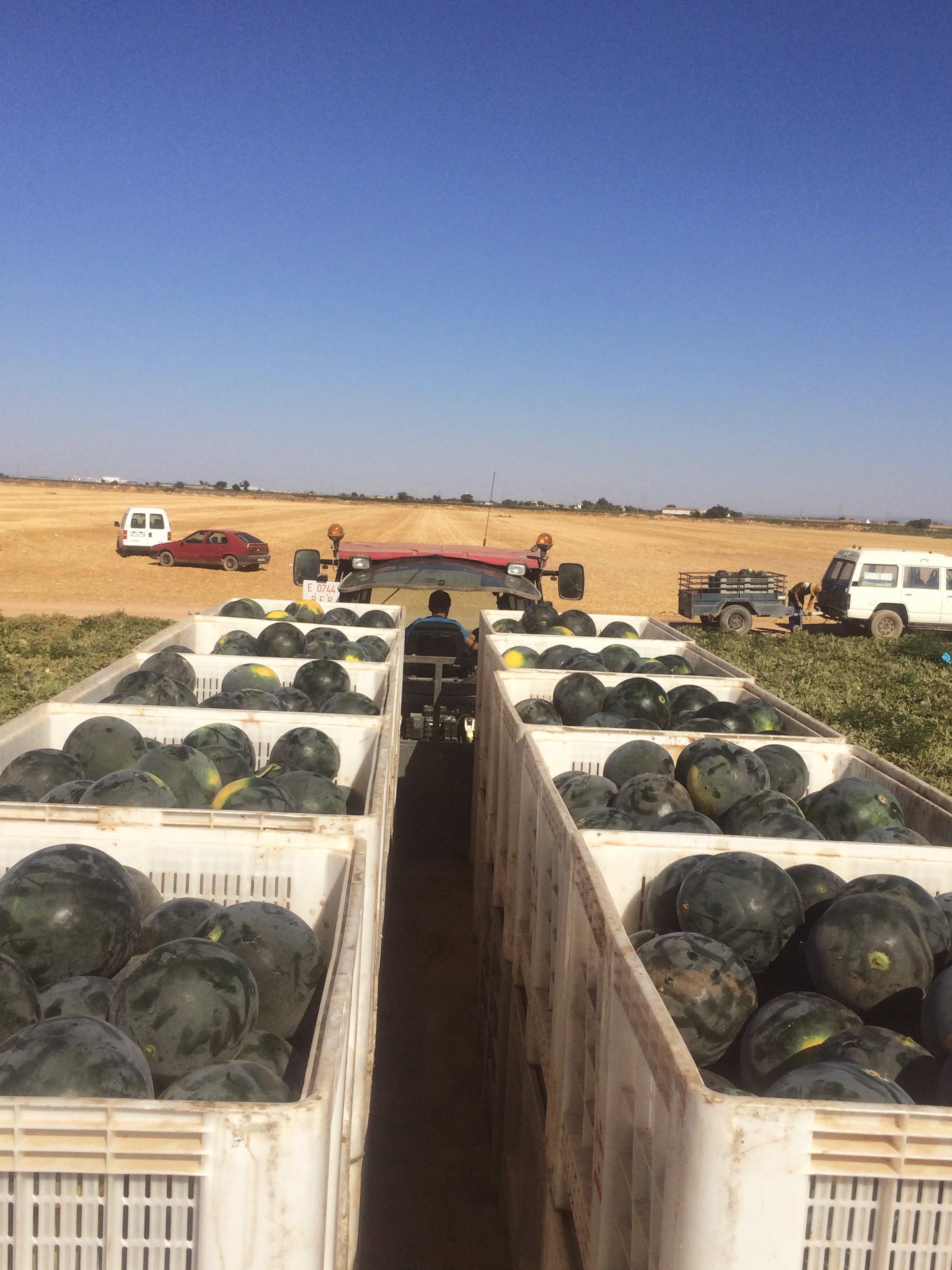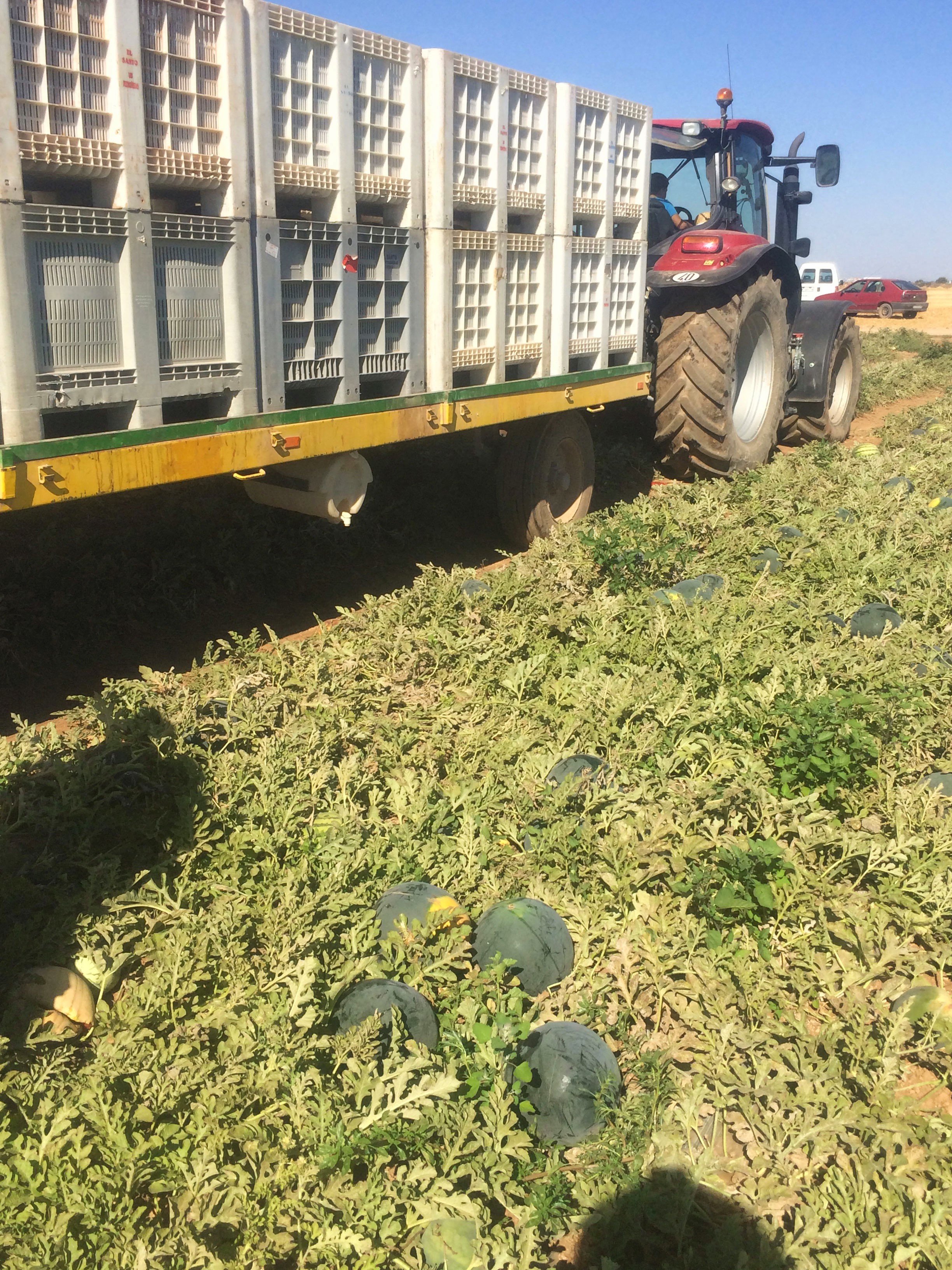 Respecto a las sandías, estas van en palots para que no sufran ningún daño… son más frágiles. Las sandías producen entorno a 50.000kg/ha y se recogen dos veces normalmente. Las tareas de recogida son totalmente manuales y además es importante tener mucho cuidado al manipularlos para que estos no sufran golpes, roturas,…