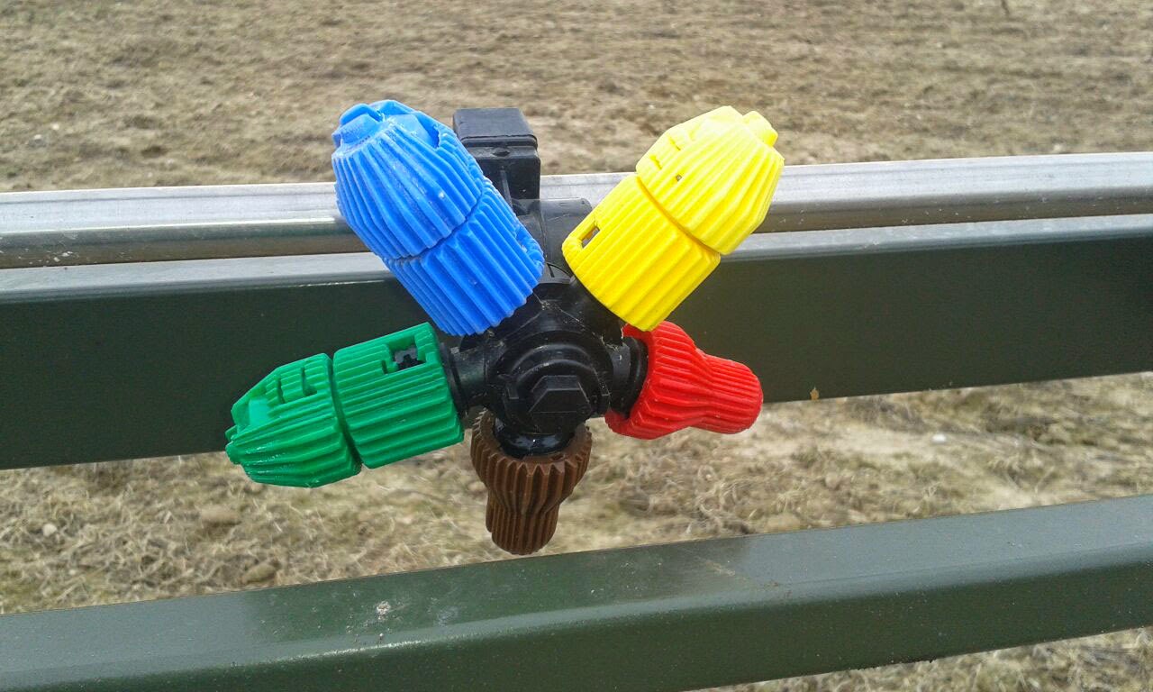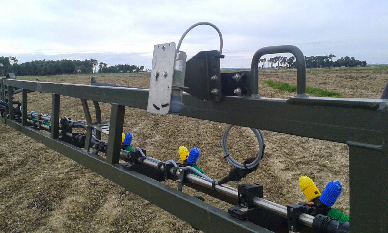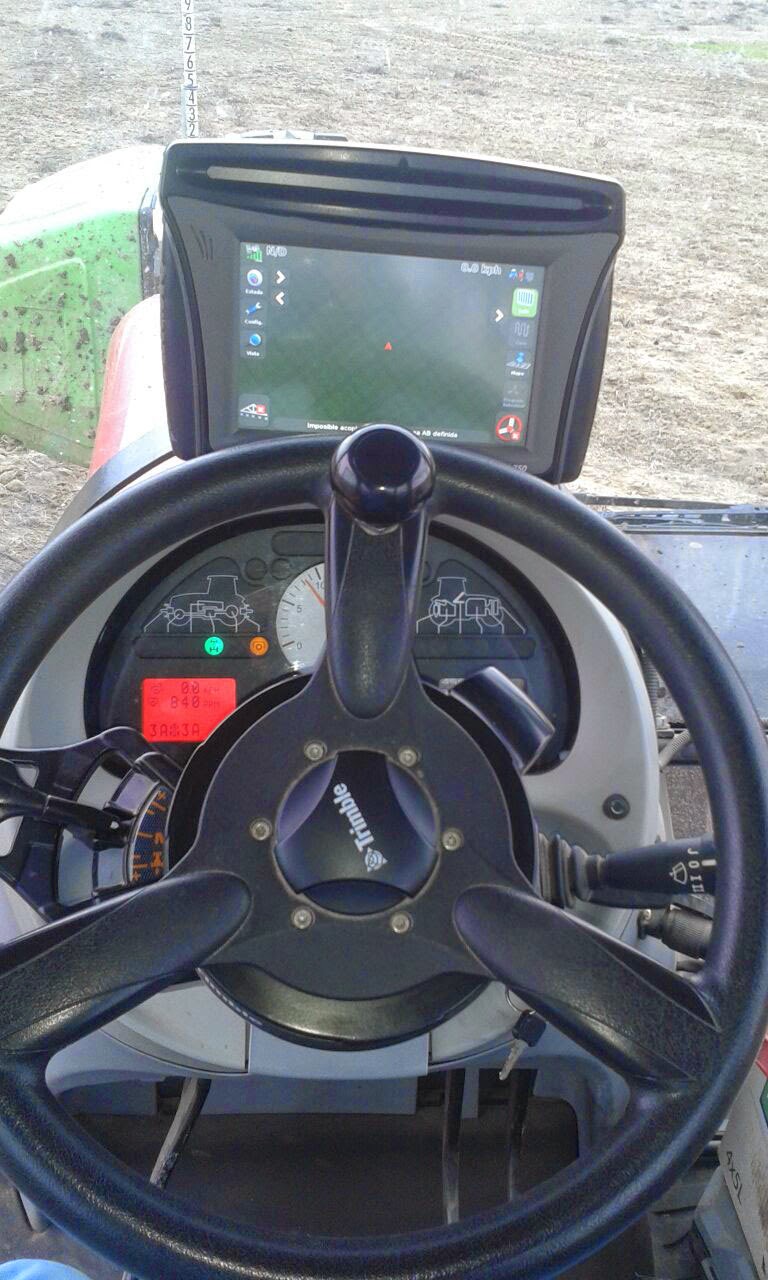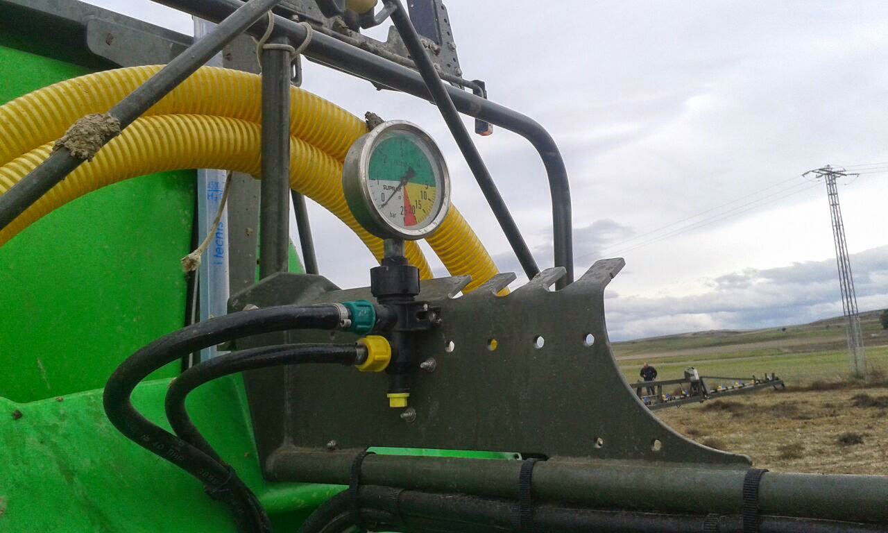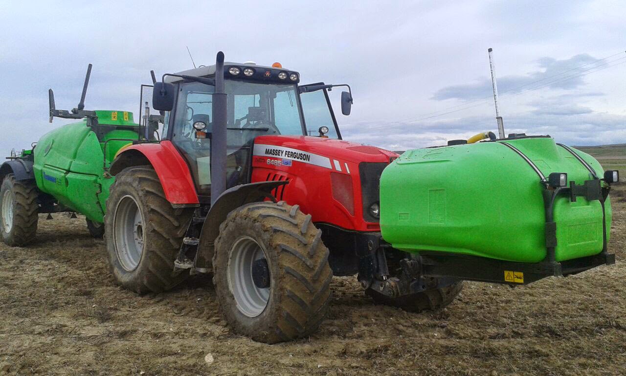Como podéis ver en las fotos, disponen de un depósito frontal de 1.500 litros que les da aún más autonomía (6.000 litros en total), por lo que pueden hacer largas jornadas de trabajo sin tener que parar para recargar líquido. Cuando trabajan con abono LAC 6-10-4, la dosis es de 258 litros/ha (300kg) con una autonomía de 23ha. Cuando echan herbicida a 200 litros/ha, la autonomía es de 30ha. Por otro lado, el pulverizador lleva su propio sistema de control de tramos mediante GPS, pero aún no lo tienen integrado con el sistema de autoguiado que lleva su Massey Ferguson 6485 (podéis ver en las fotos que tienen dos receptores de GPS)… es un punto que tienen aún pendiente por configurar.