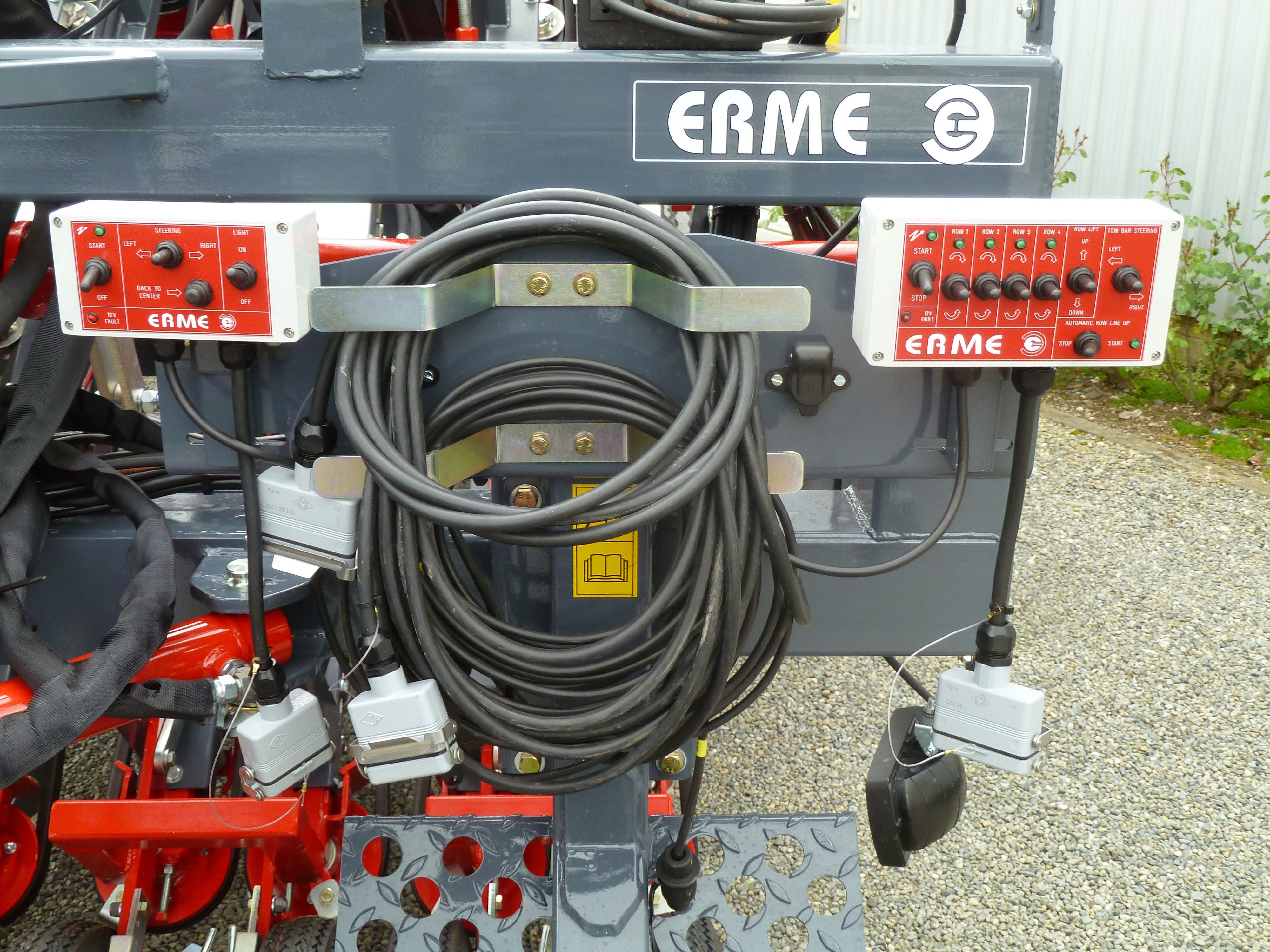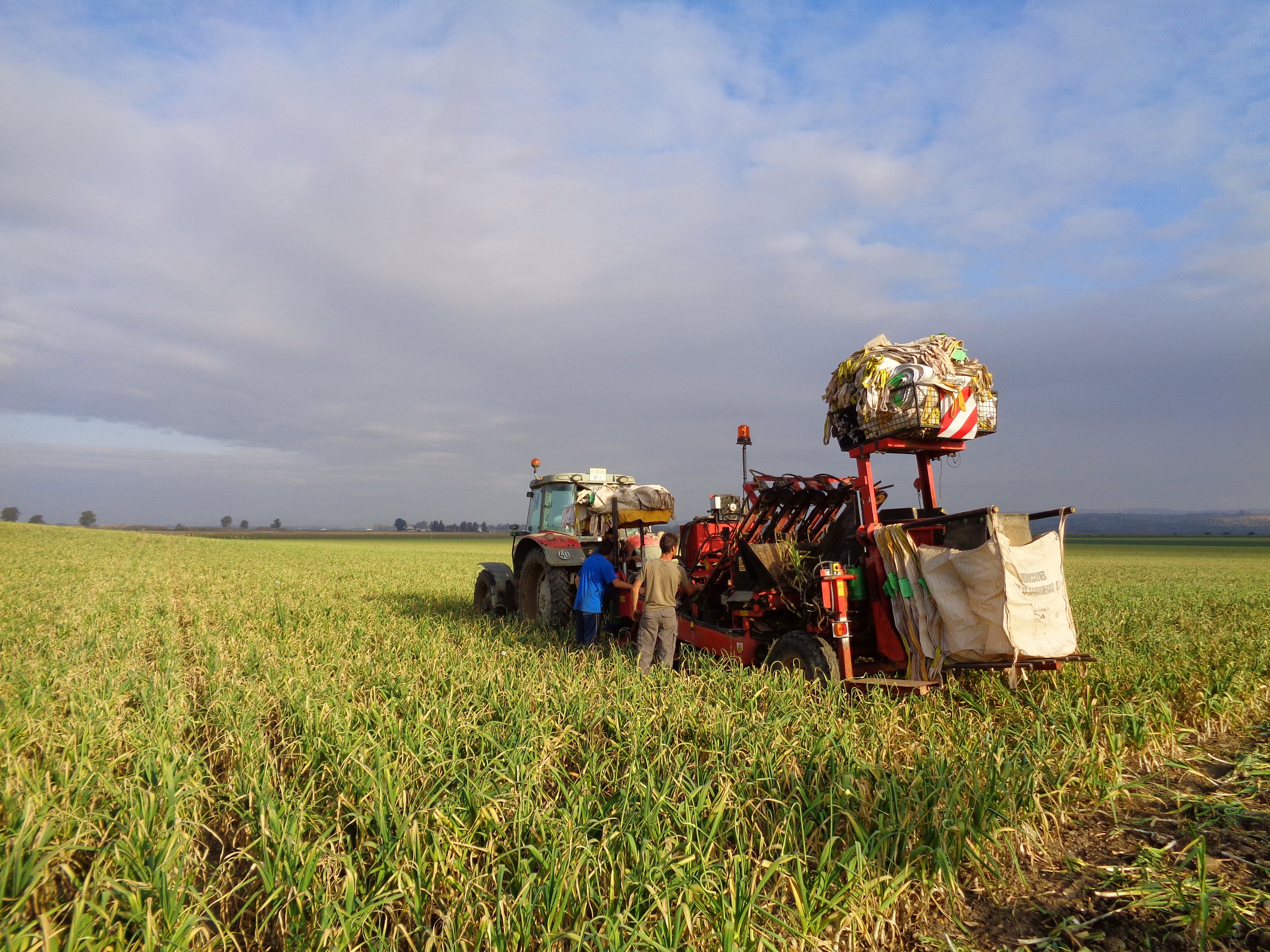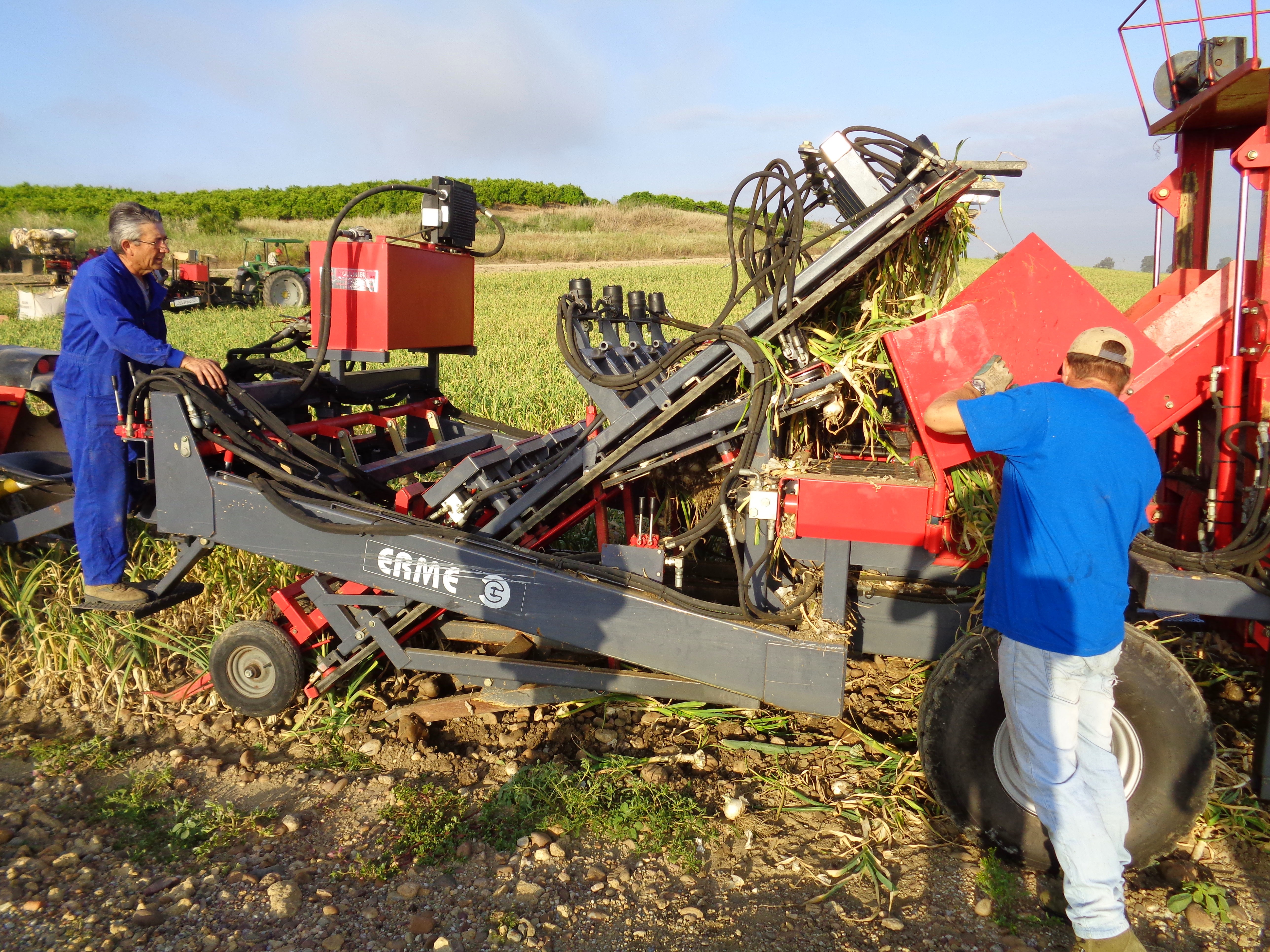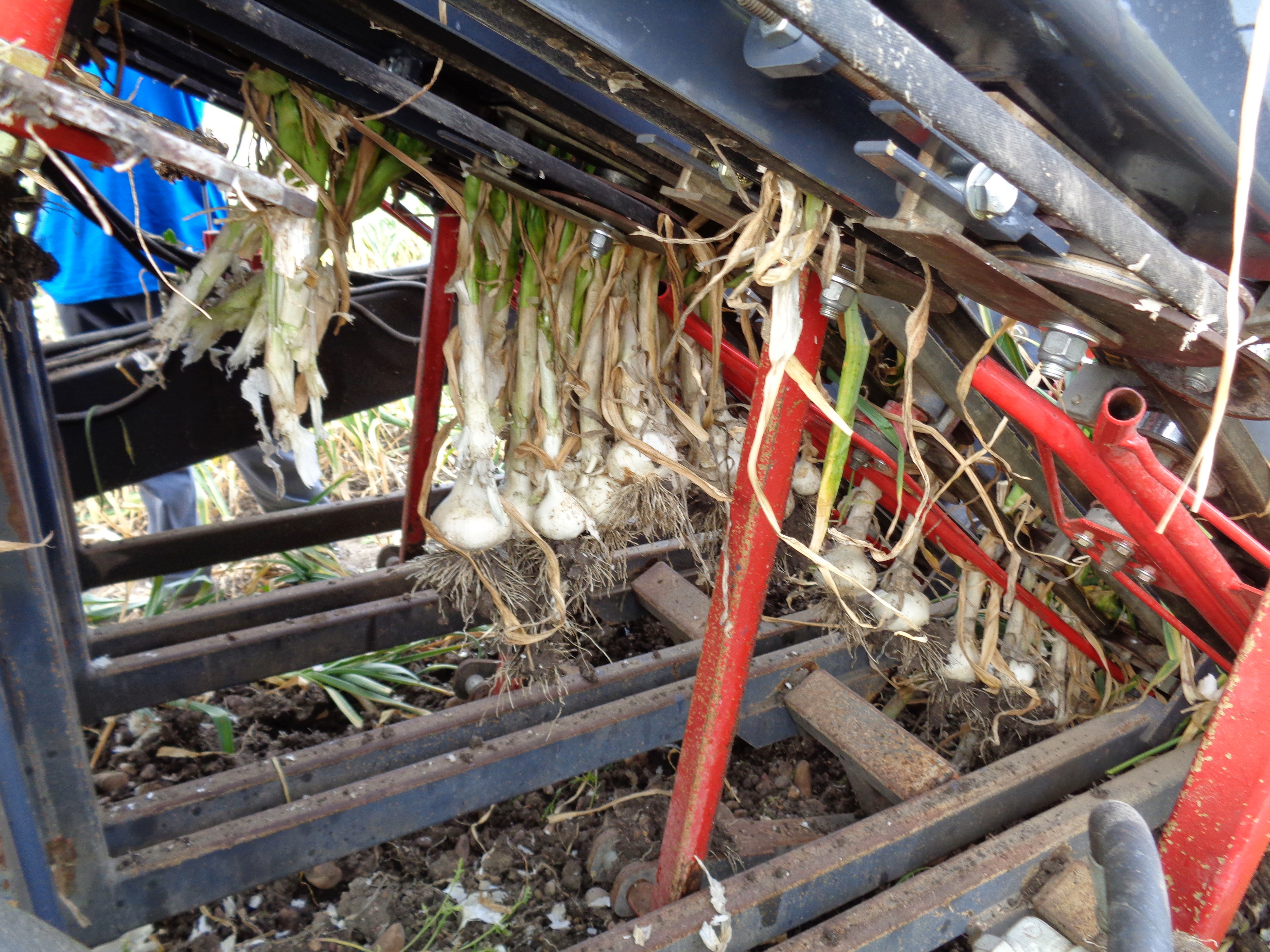 En este caso, las máquinas son muy antiguas (de los años 90… han evolucionado mucho desde entonces las que fabrican ahora), pero aún continúan trabajando sin ningún problema… ¡¡ERME fabrica muy buenas máquinas ajeras!! Estas máquinas destacan por tener cintas con barrotes de goma, mandos electro hidráulicos y el llenado directo de sacas o palots. Nosotros tenemos también una máquina arrancadora ERME de dos surcos, pero la nuestra agrupa los ajos en pequeños manojos en vez de cortarlos, tal y como podéis ver en nuestro vídeo. Por nuestra zona las arrancadoras-cortadoras no se utilizan aún mucho. Nos gusta secar el ajo con su tallo y después cortar las raíces y el tallo manualmente… nuestro proceso de manipulación y comercialización es diferente.