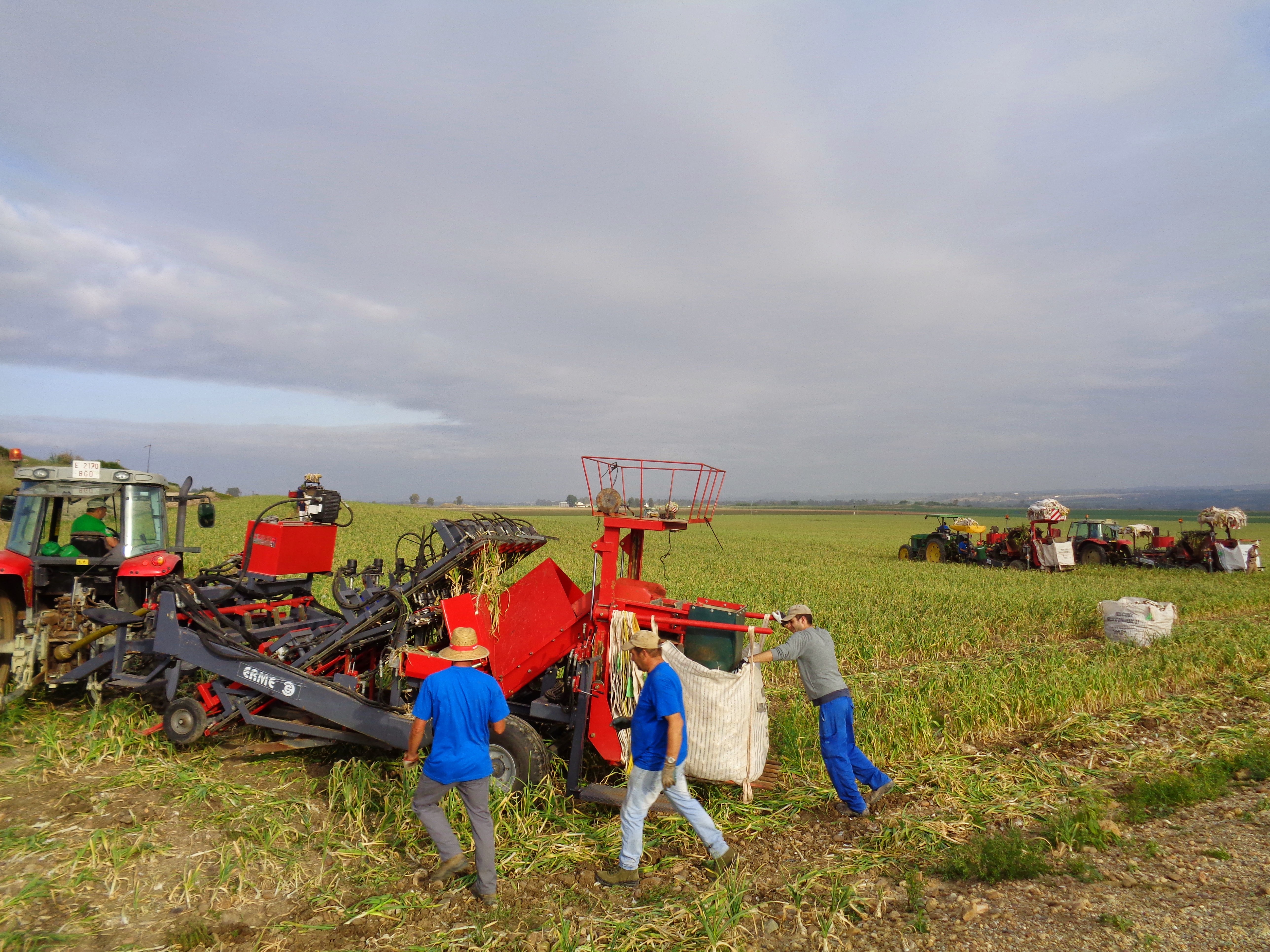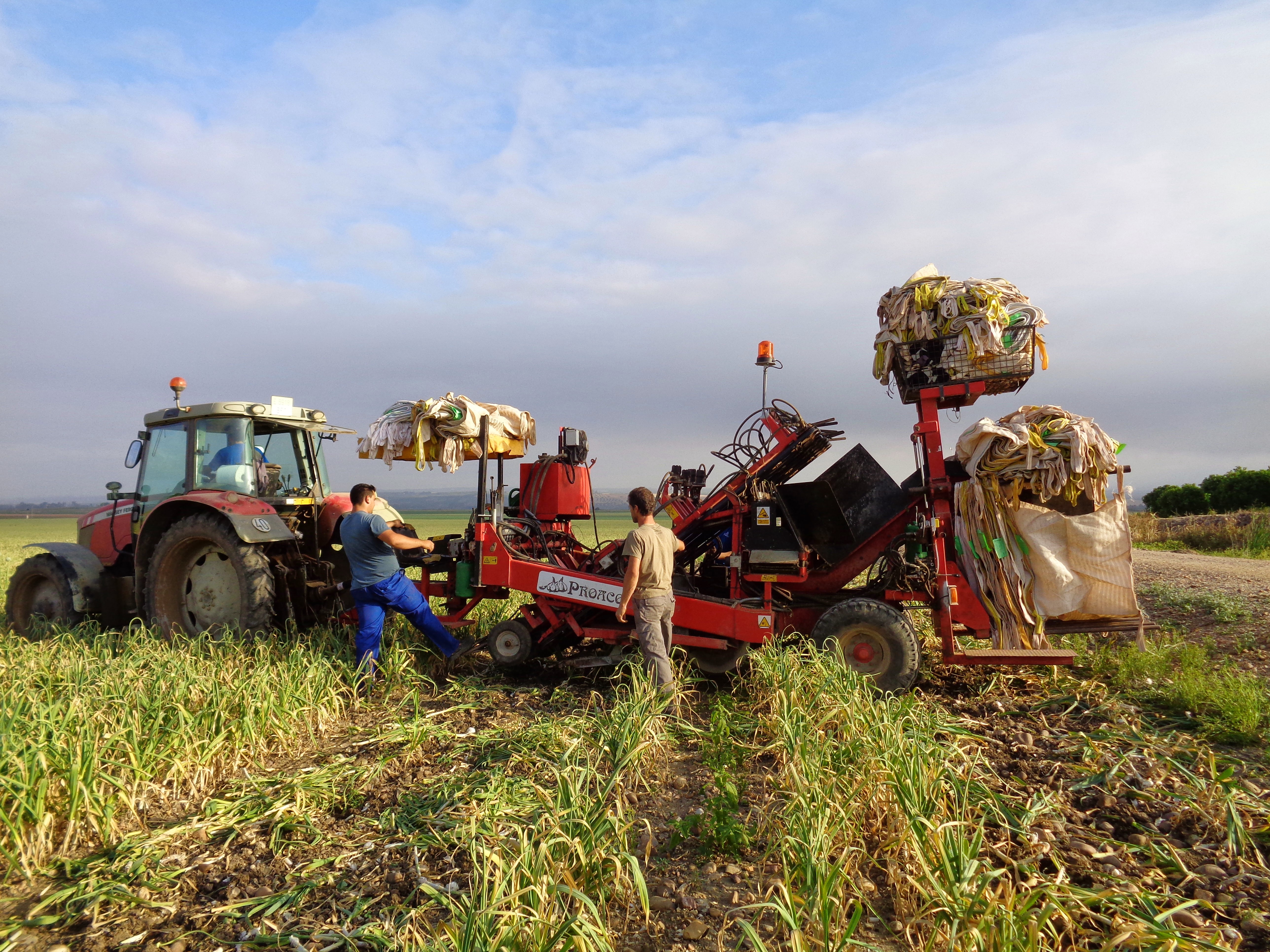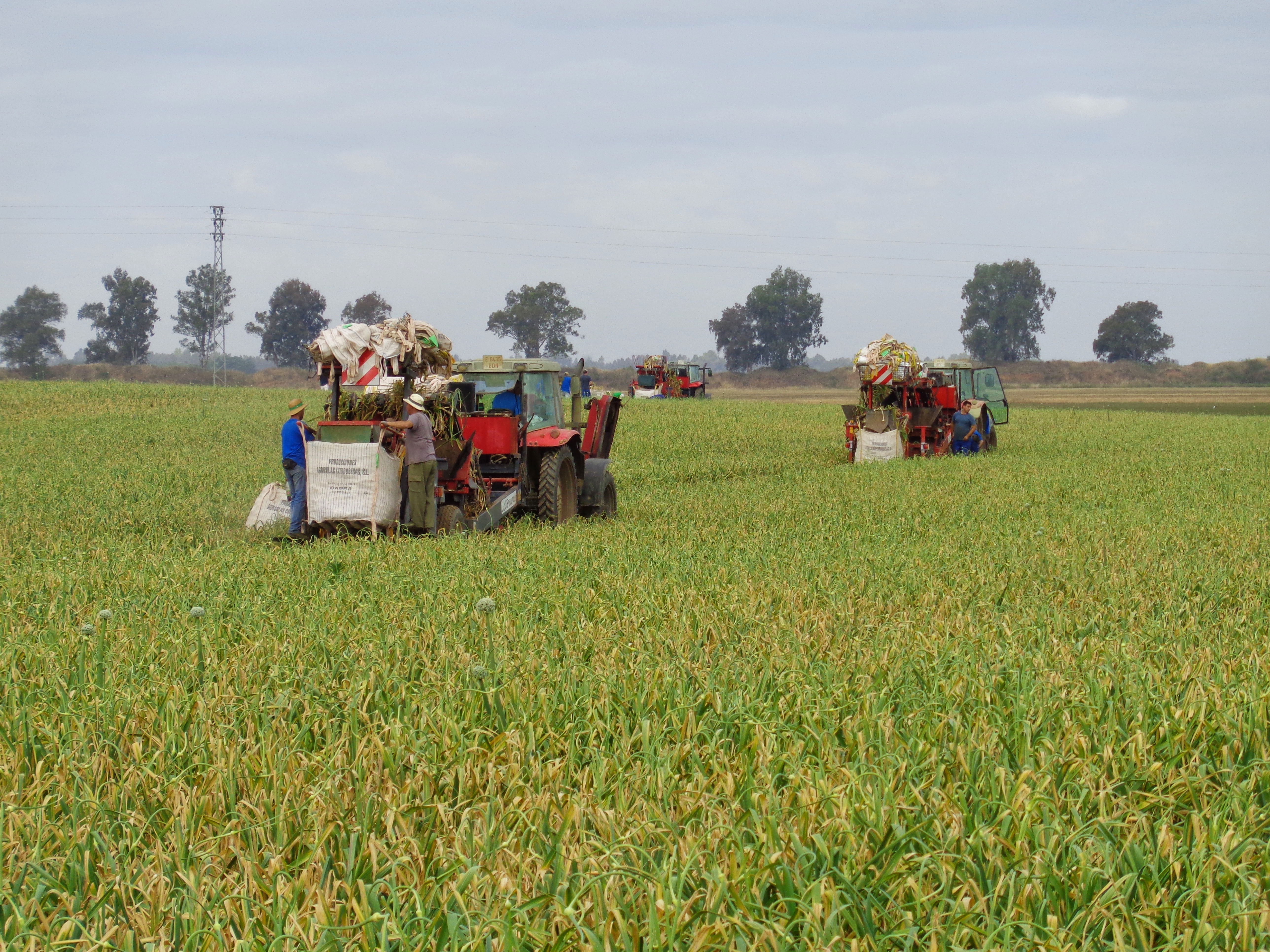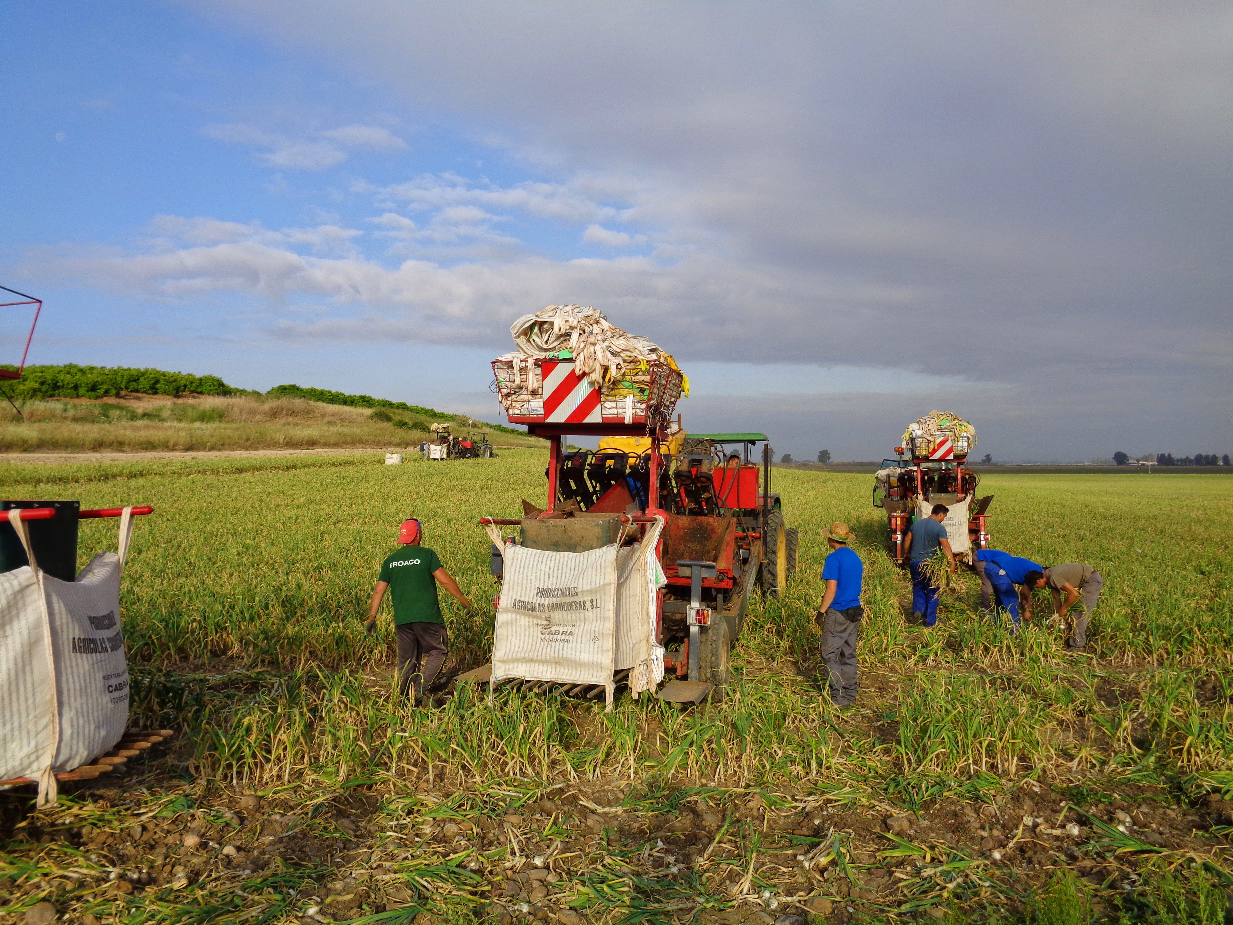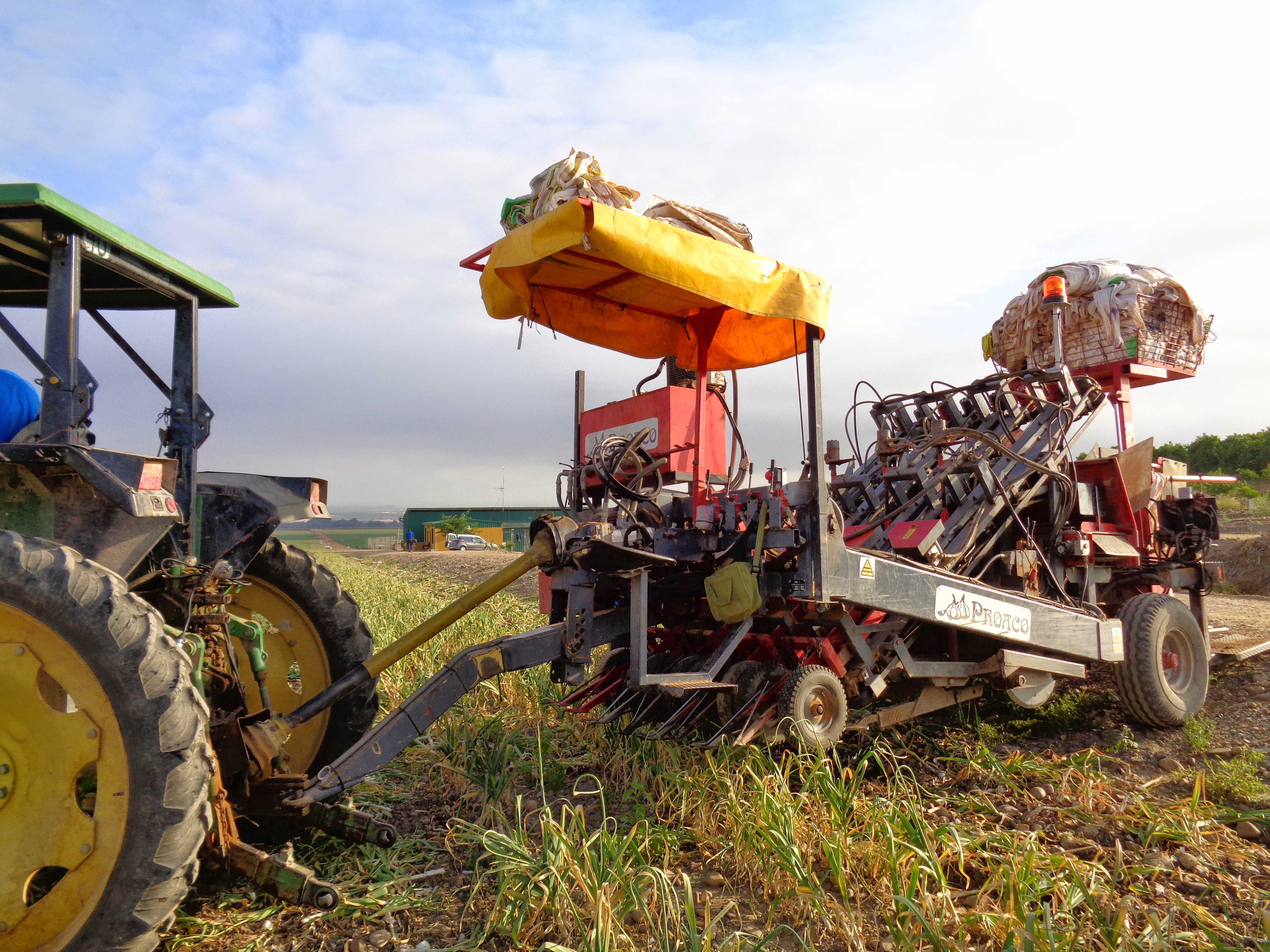 La recogida del ajo de primavera ha comenzado por la zona de Sevilla y Córdoba (una de las zonas más importantes en producción del ajo junto con la nuestra). La empresa Proaco ha puesto en funcionamiento sus máquinas ERME de recolección del ajo (arrancadoras-cortadoras). Como podéis ver en las fotos, trabajan con varias máquinas arrancadoras-cortadoras de cuatro surcos… el rendimiento de estas máquinas es fantástico, permitiéndoles trabajar muchas hectáreas al día. El problema de estas es qué necesitan tener un buen sistema de transporte para mover todas las sacas que se llenan con ajos y secarlos de forma rápida para evitar problemas al estar el ajo tierno.