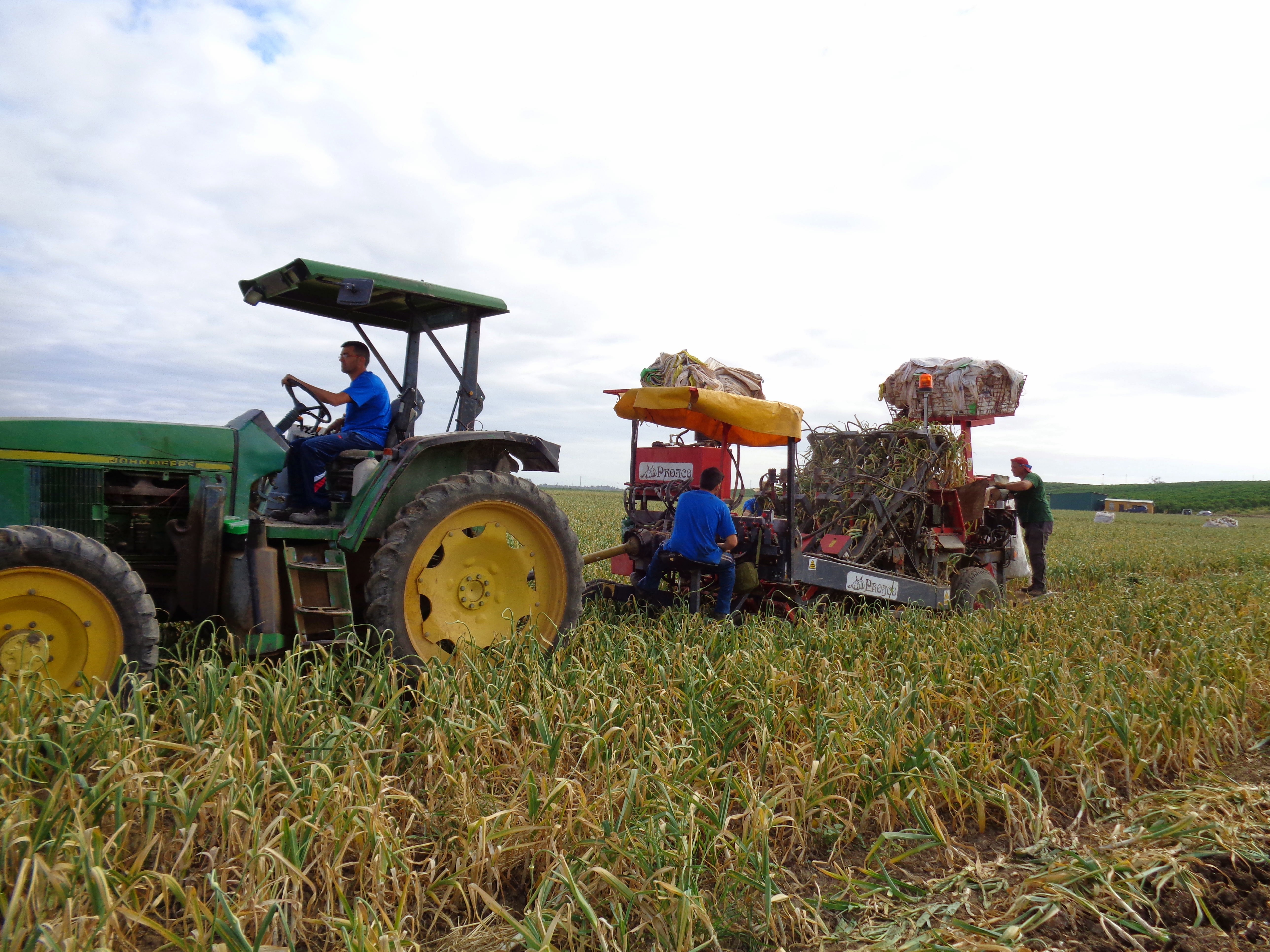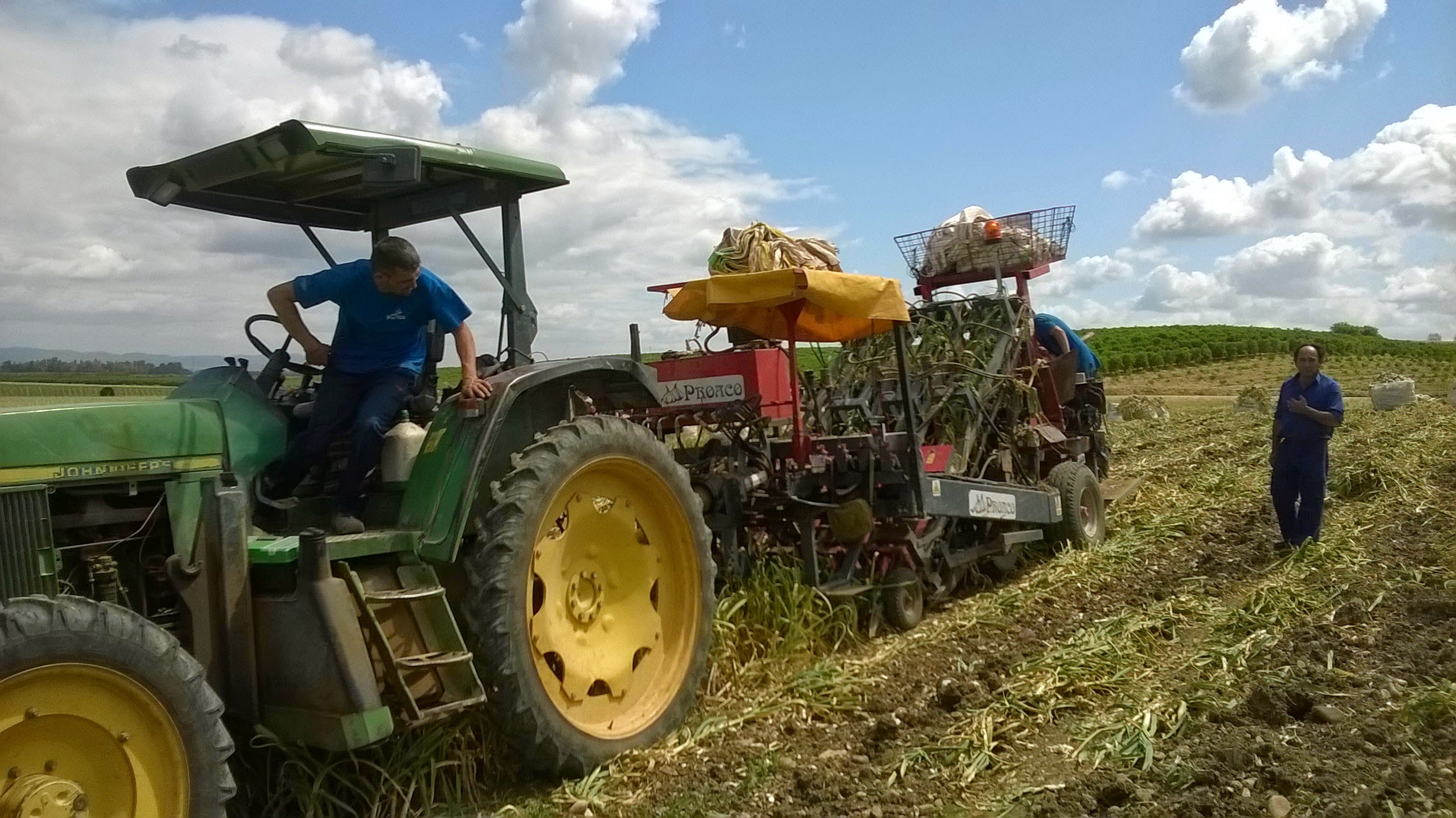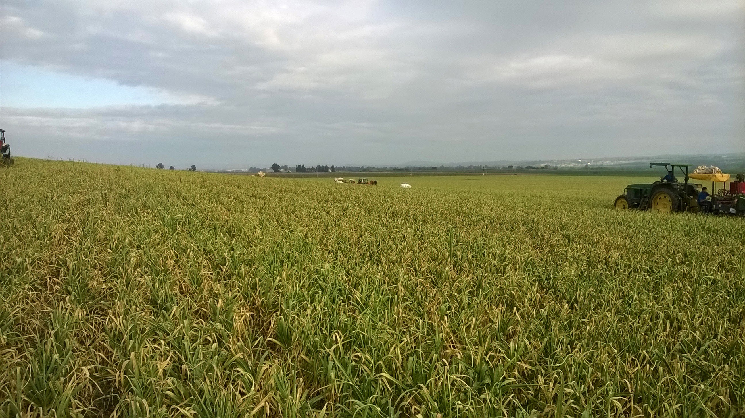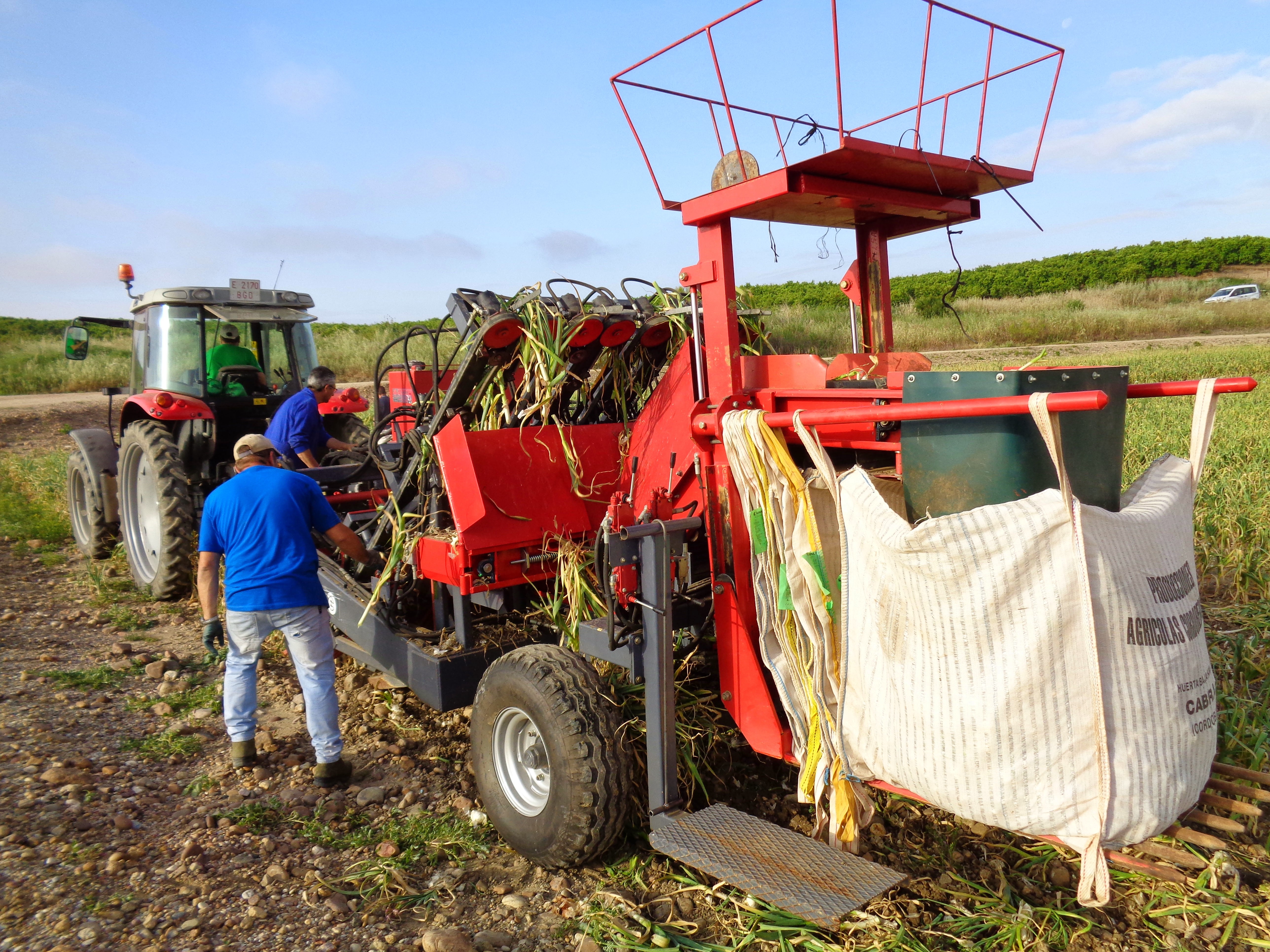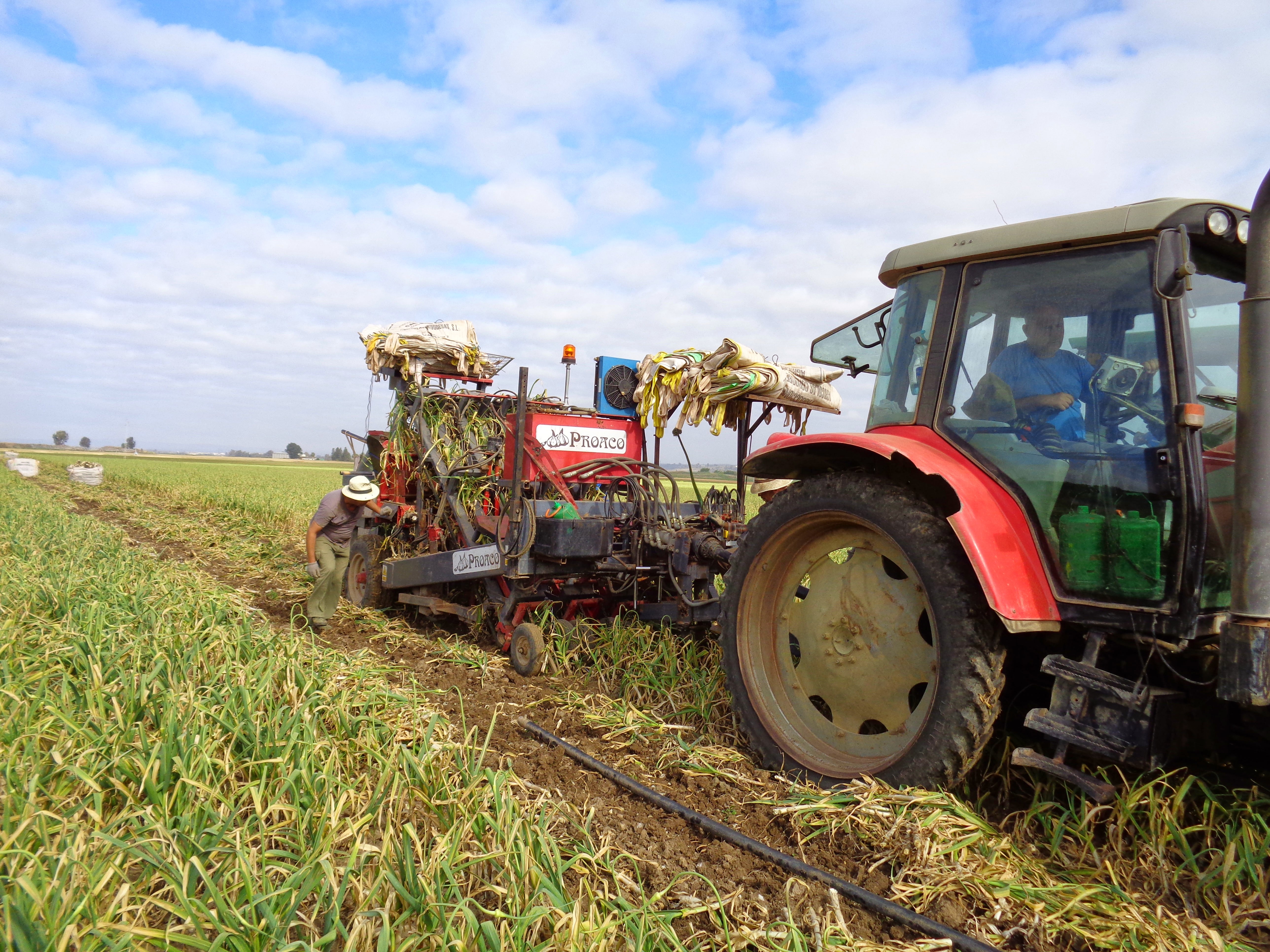 La recogida del ajo de primavera ha comenzado por la zona de Sevilla y Córdoba (una de las zonas más importantes en producción del ajo junto con la nuestra). La empresa Proaco ha puesto en funcionamiento sus máquinas ERME de recolección del ajo (arrancadoras-cortadoras). Como podéis ver en las fotos, trabajan con varias máquinas arrancadoras-cortadoras de cuatro surcos… el rendimiento de estas máquinas es fantástico, permitiéndoles trabajar muchas hectáreas al día. El problema de estas es qué necesitan tener un buen sistema de transporte para mover todas las sacas que se llenan con ajos y secarlos de forma rápida para evitar problemas al estar el ajo tierno.