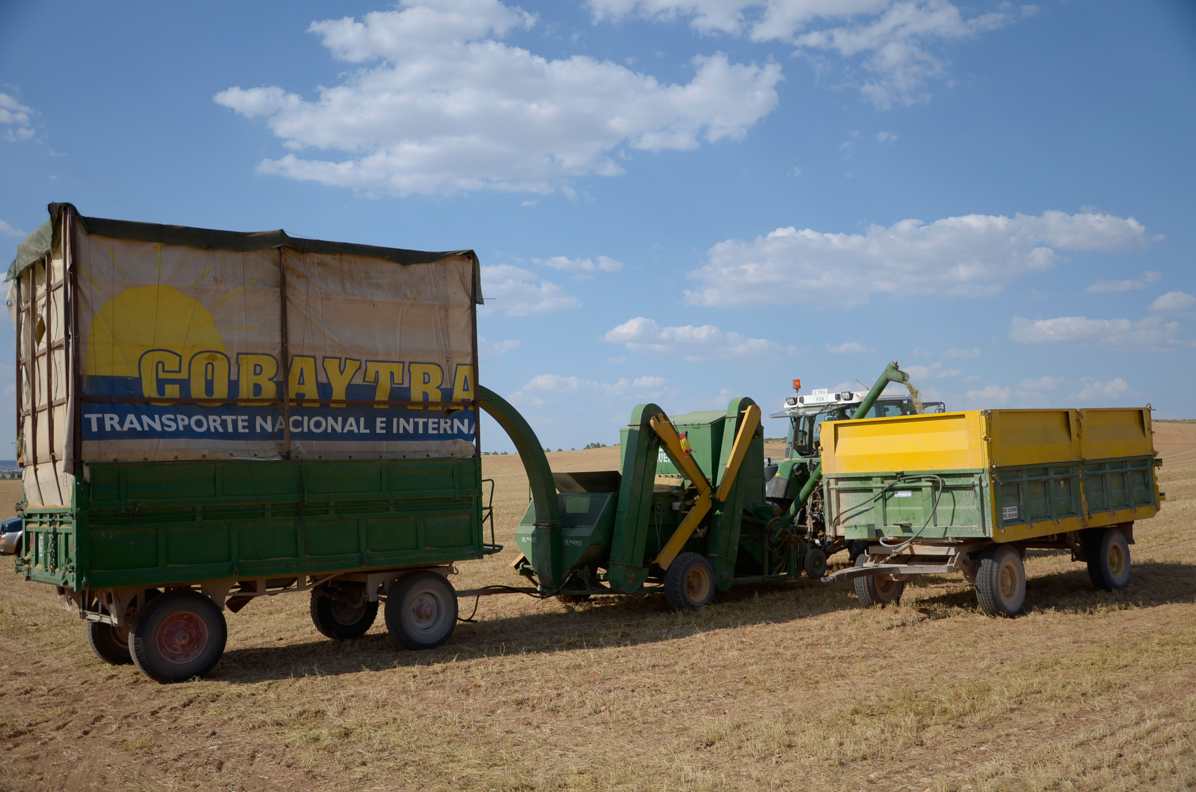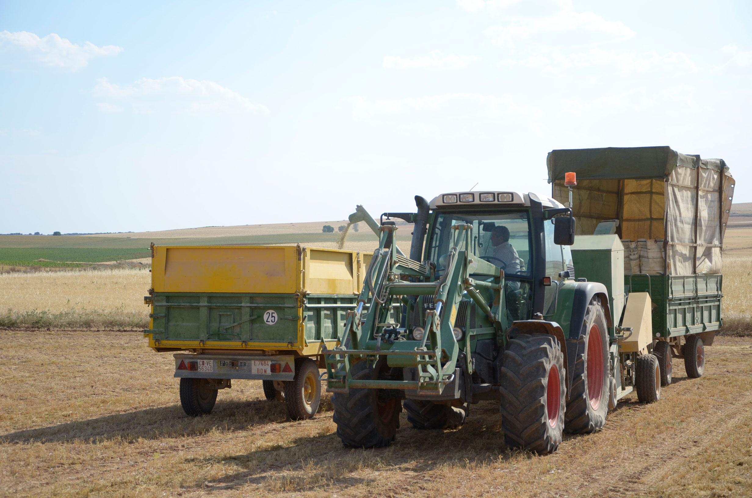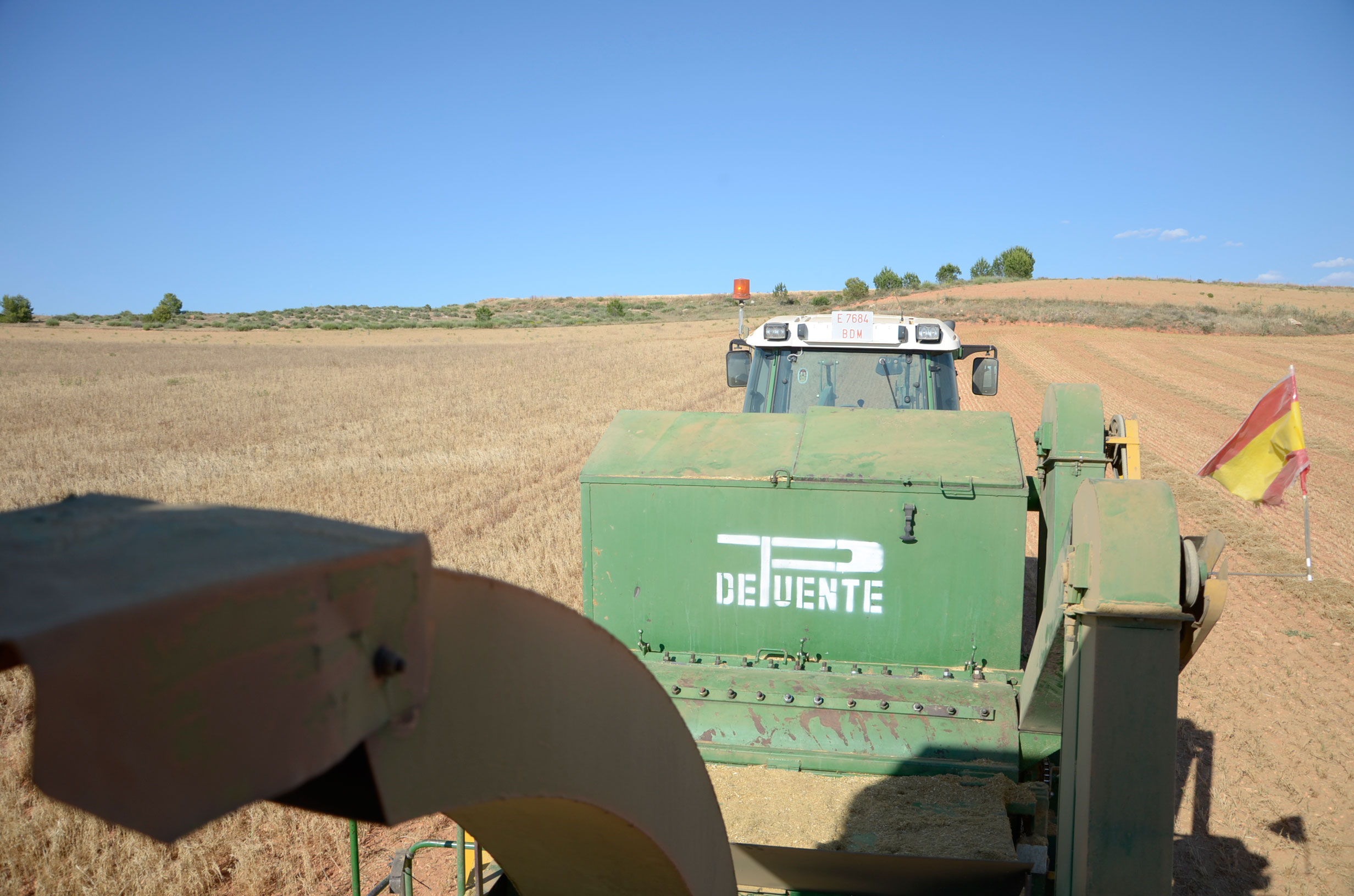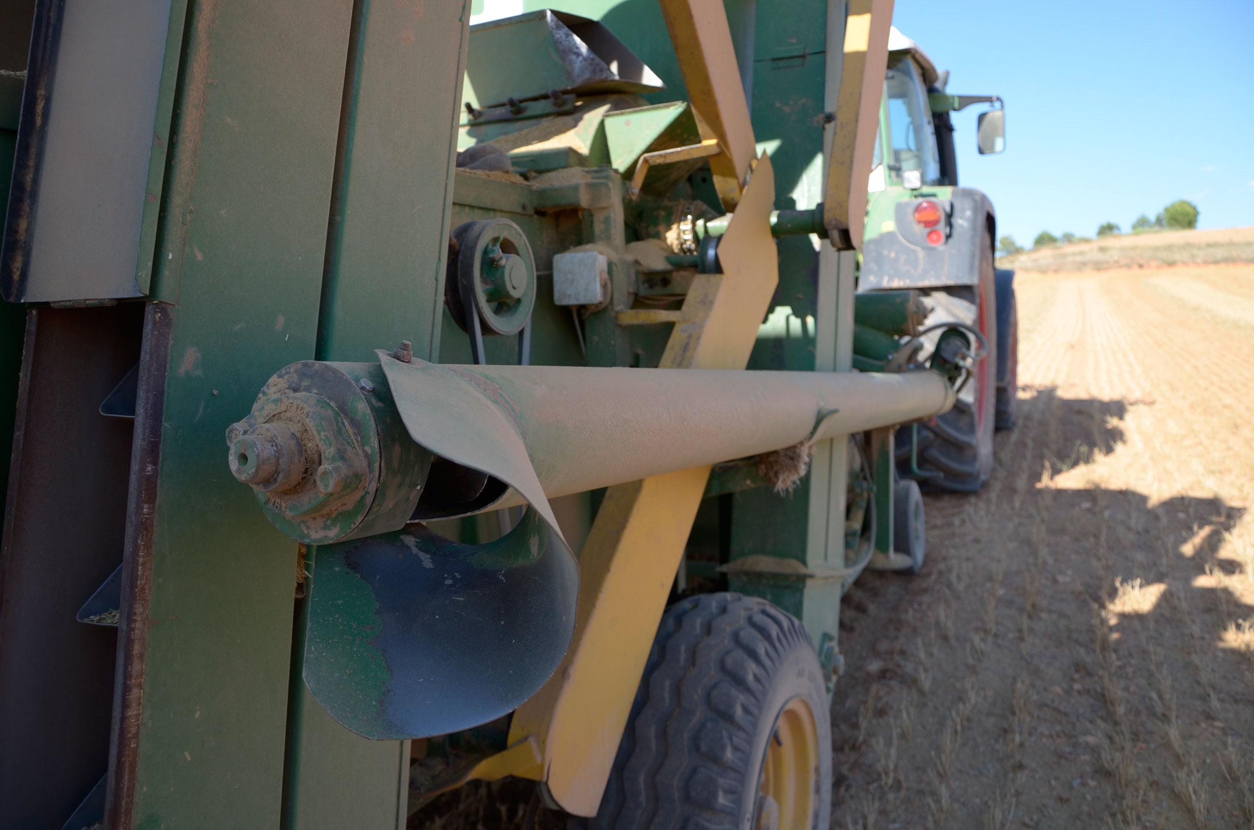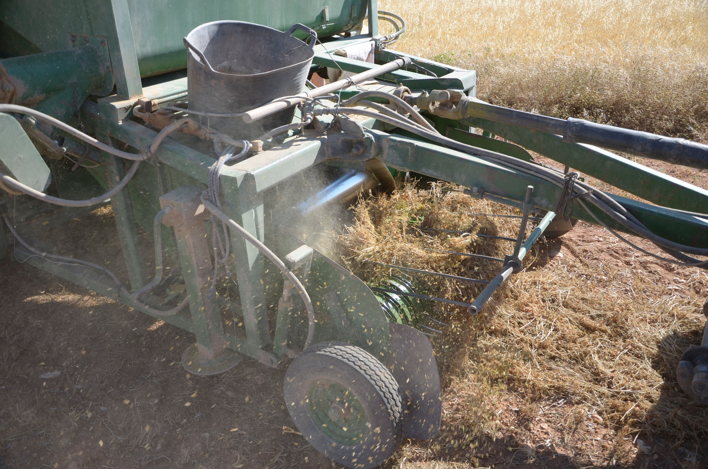 Respecto a la maquinaria que está utilizando, es una antigua trilladora fabricada en Val de San Lorenzo (León). Según nos comenta, funciona muy bien aún. Esta máquina le permite trabajar con comodidad muchas hectáreas al día (depende de la cantidad de horas trabajadas y la velocidad de trabajo que está en torno a 4km/h). Dispone de una tolva de unos 1.000kg y el remolque que acumula la paja lo tiene que vaciar cada dos horas más o menos.