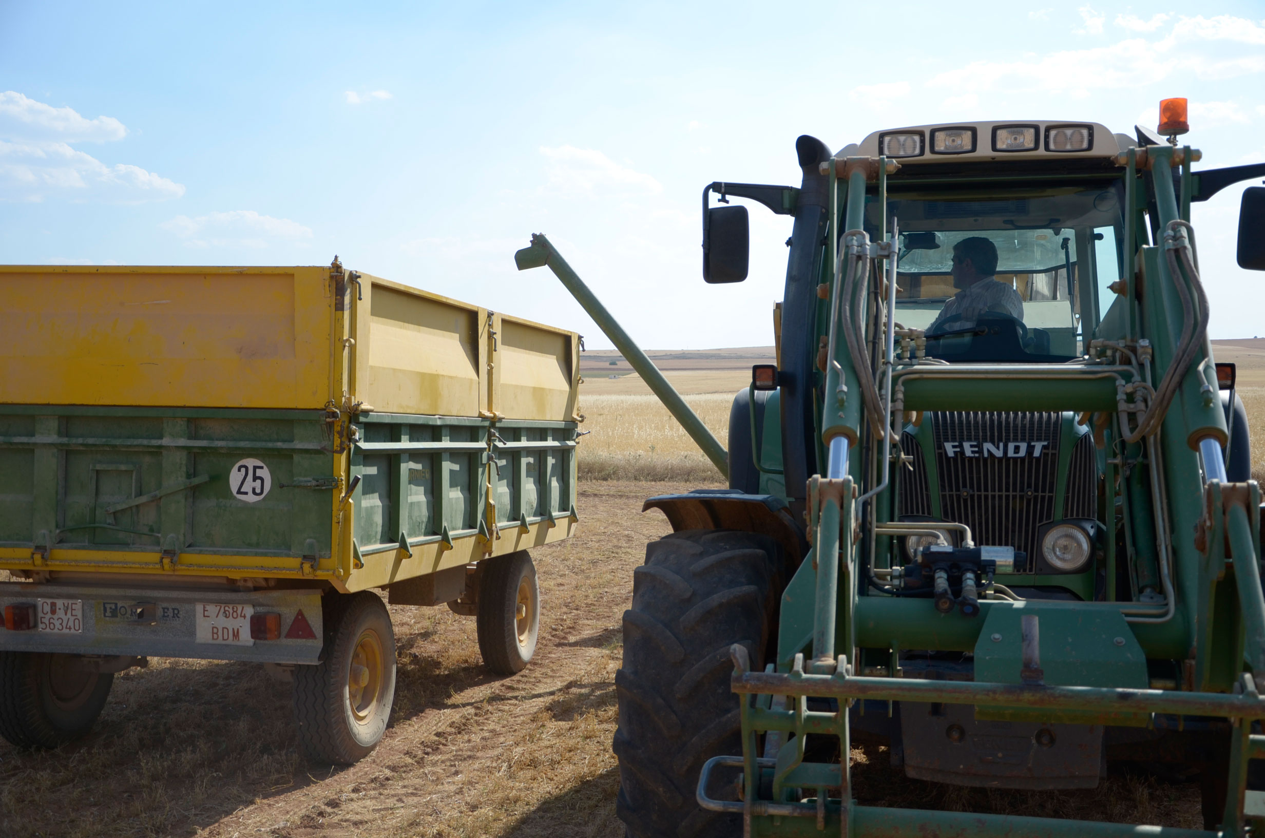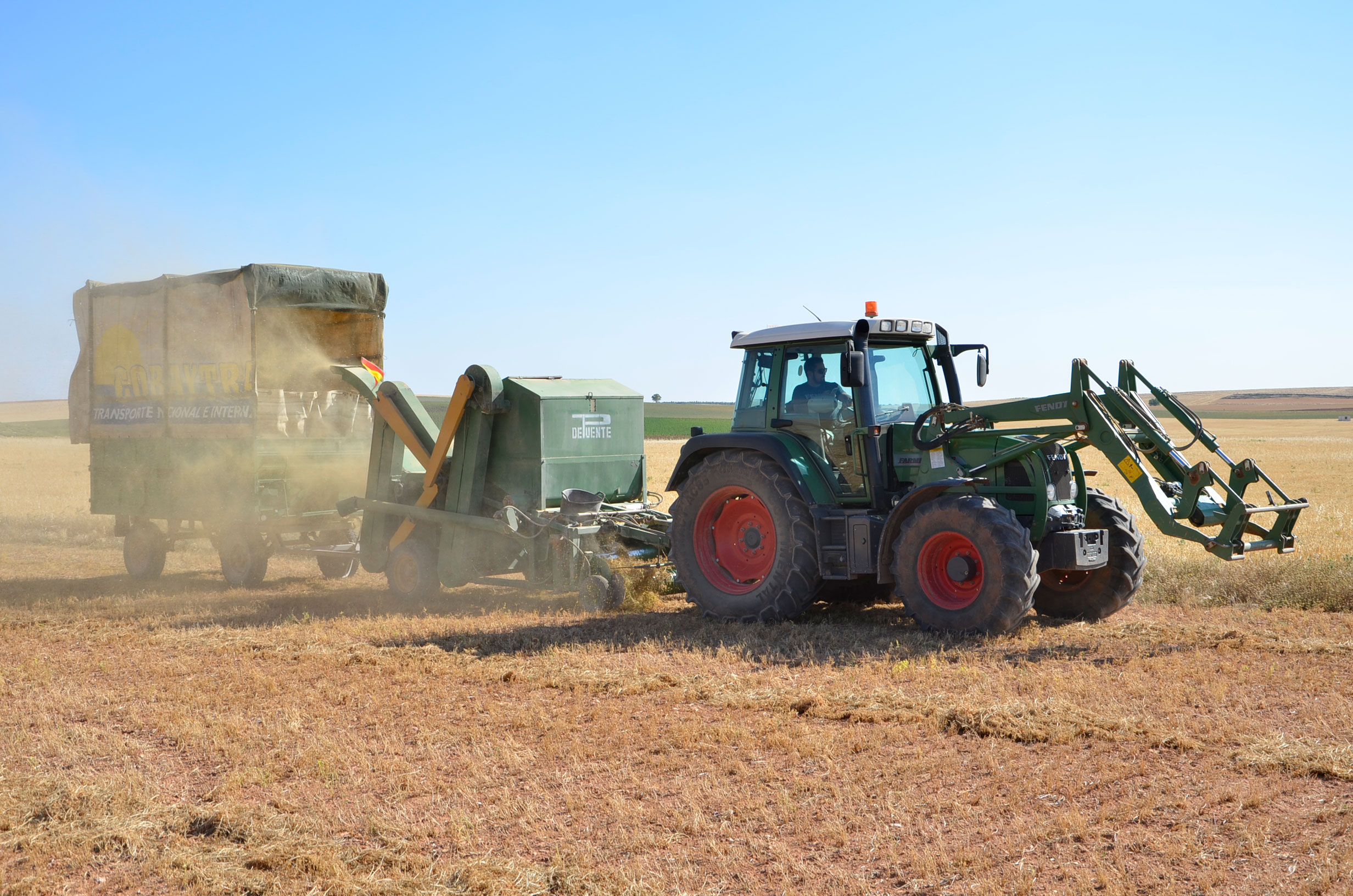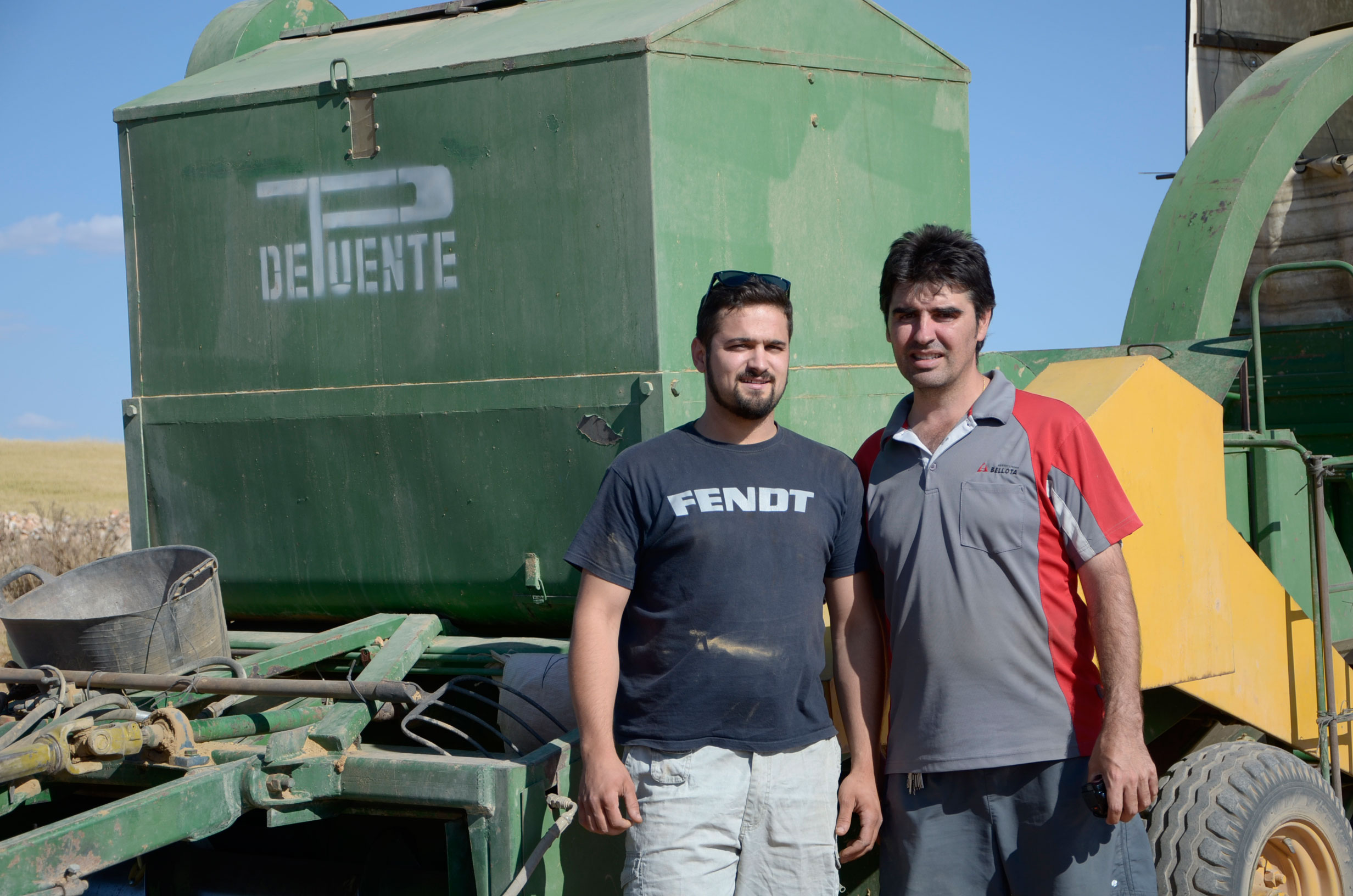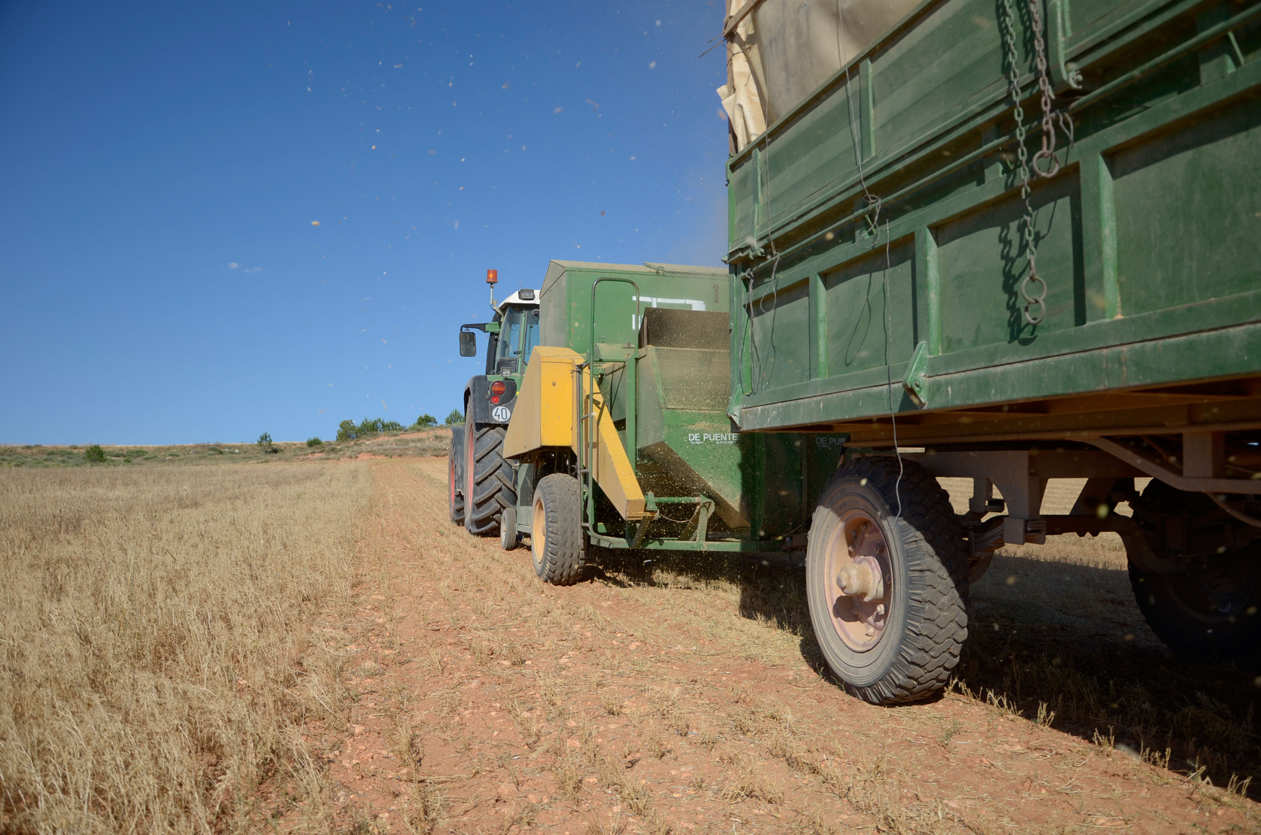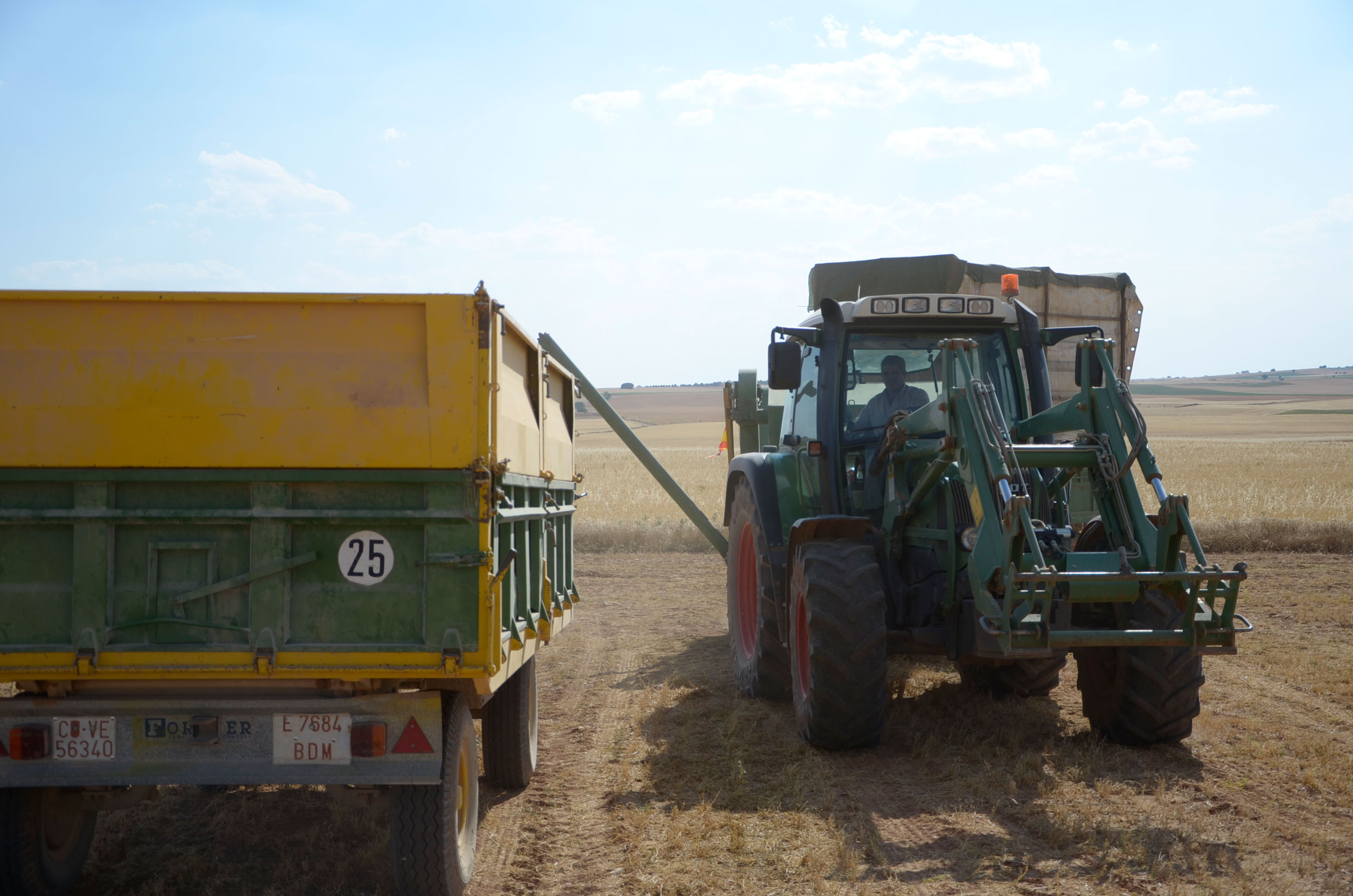 Respecto a la maquinaria que está utilizando, es una antigua trilladora fabricada en Val de San Lorenzo (León). Según nos comenta, funciona muy bien aún. Esta máquina le permite trabajar con comodidad muchas hectáreas al día (depende de la cantidad de horas trabajadas y la velocidad de trabajo que está en torno a 4km/h). Dispone de una tolva de unos 1.000kg y el remolque que acumula la paja lo tiene que vaciar cada dos horas más o menos.