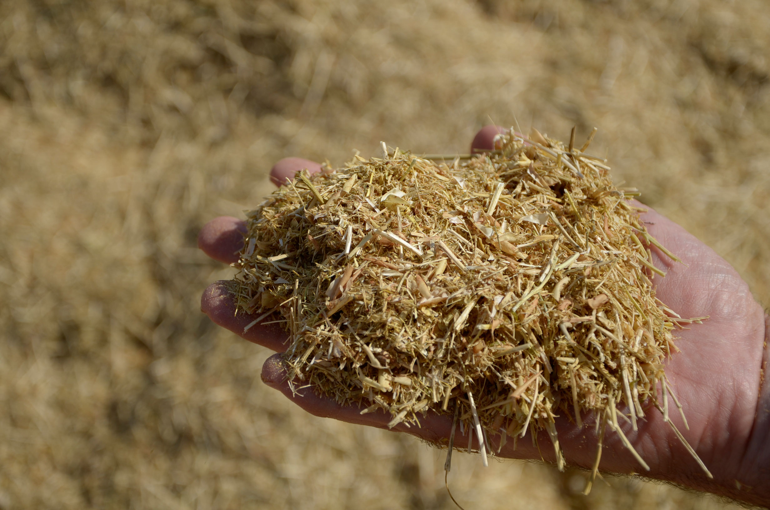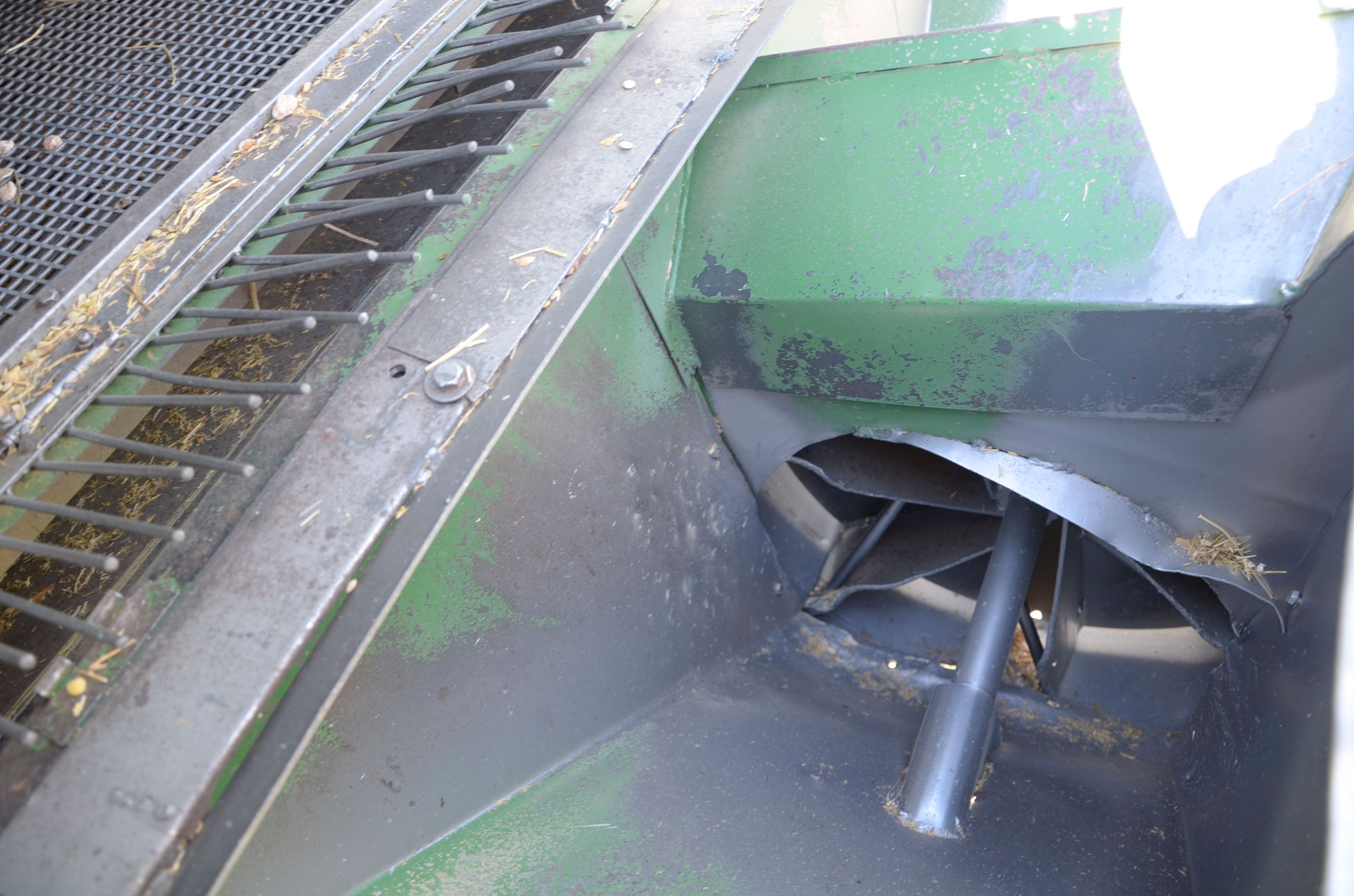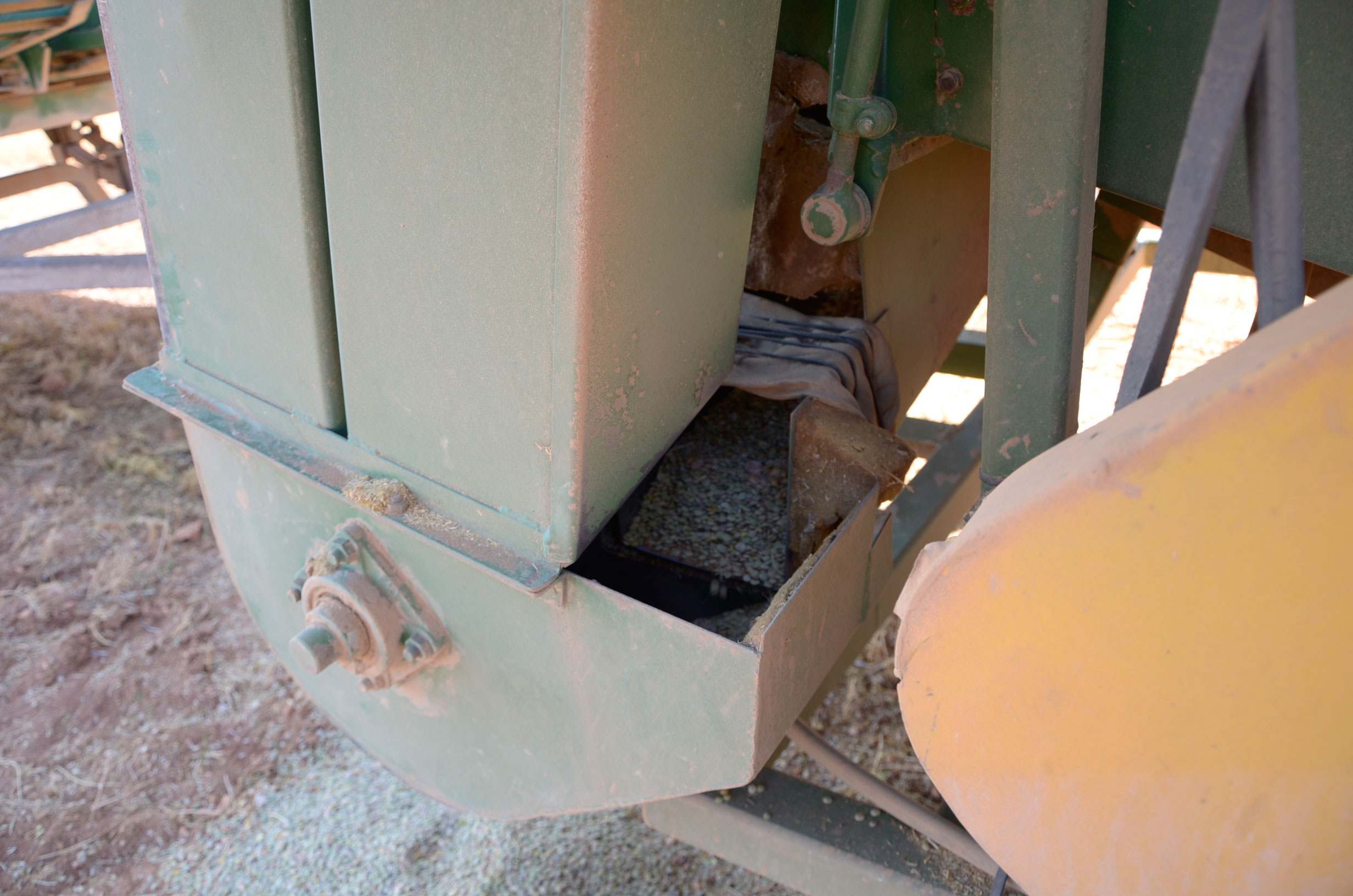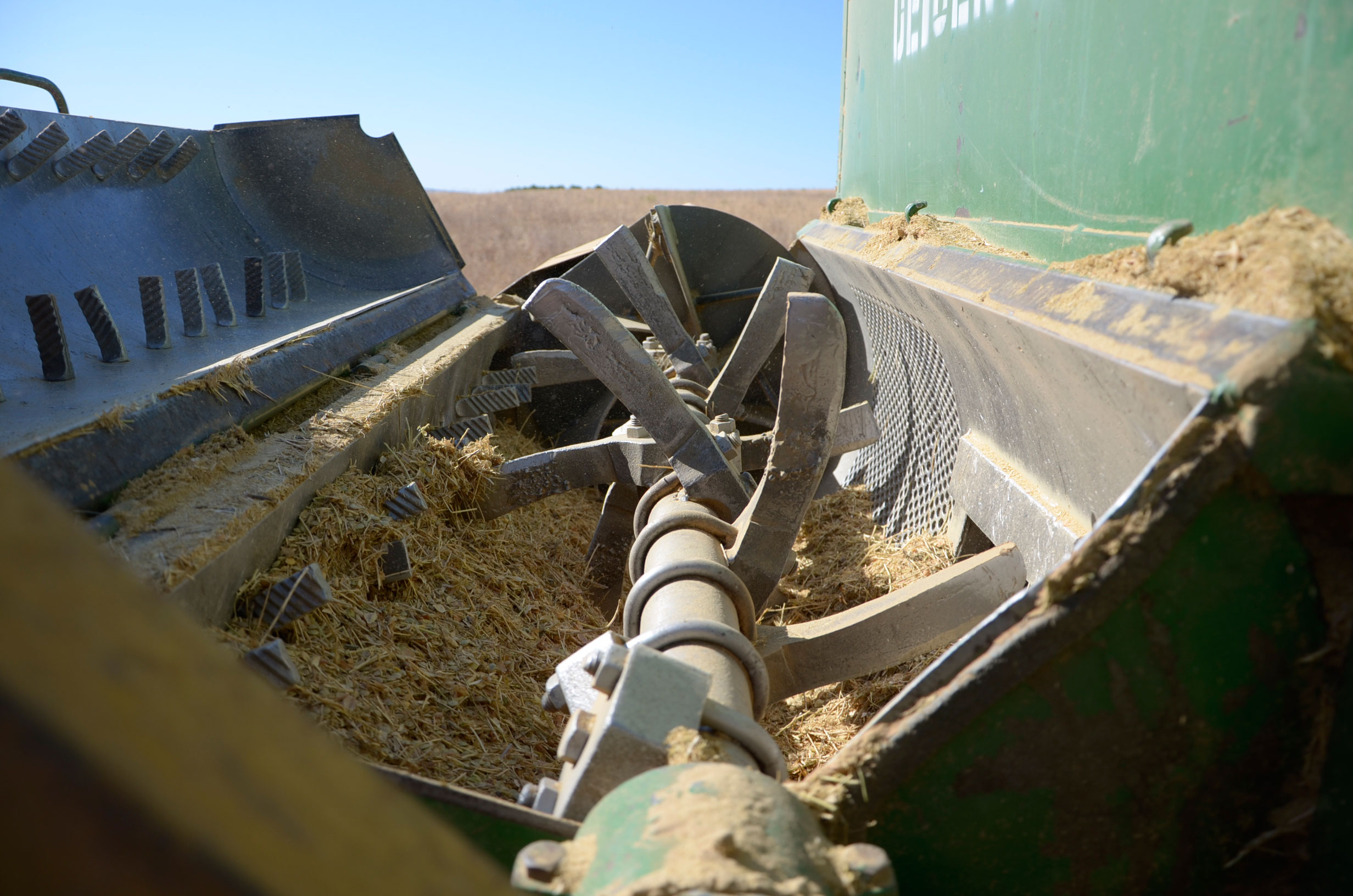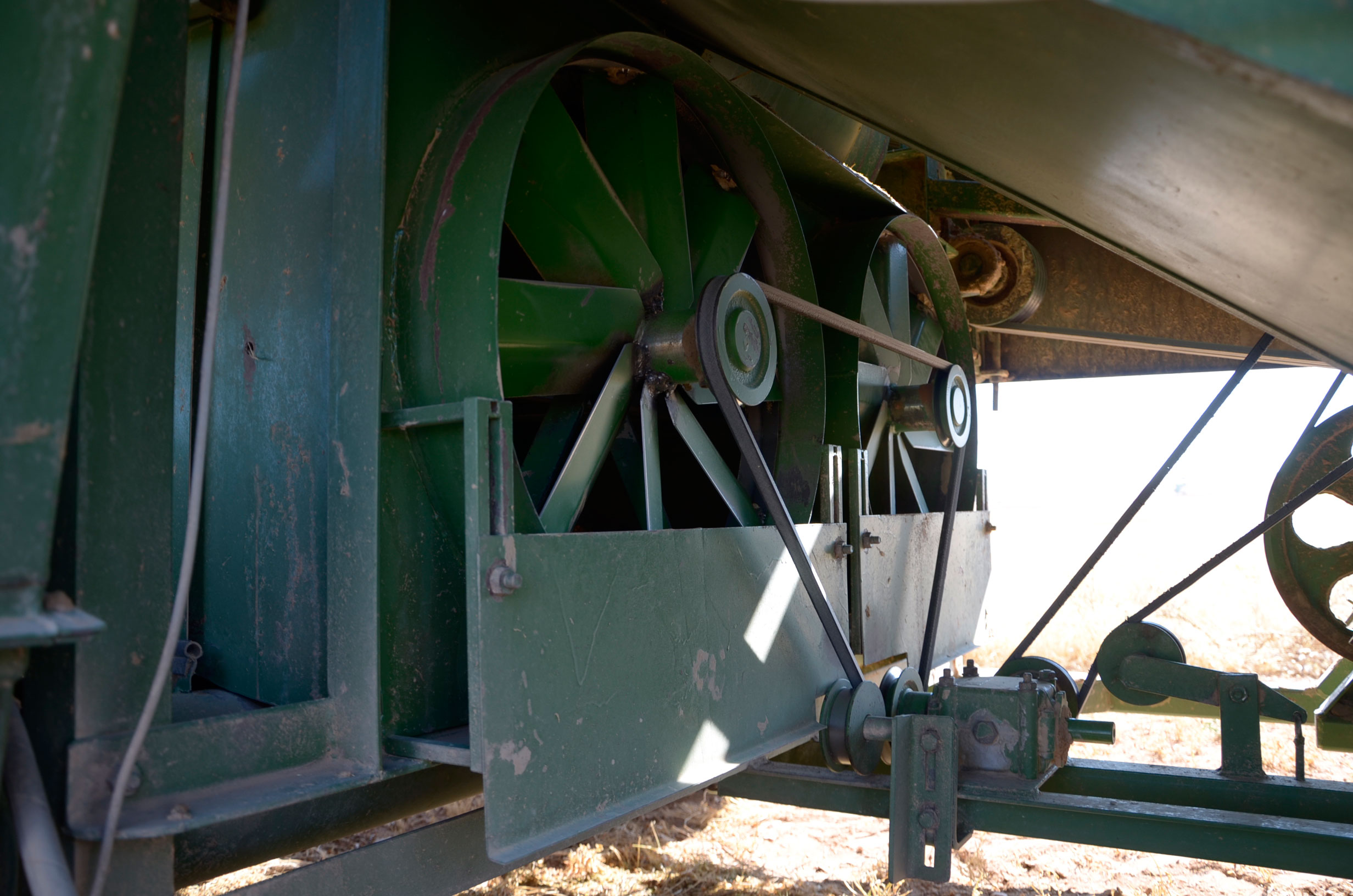 Respecto a la maquinaria que está utilizando, es una antigua trilladora fabricada en Val de San Lorenzo (León). Según nos comenta, funciona muy bien aún. Esta máquina le permite trabajar con comodidad muchas hectáreas al día (depende de la cantidad de horas trabajadas y la velocidad de trabajo que está en torno a 4km/h). Dispone de una tolva de unos 1.000kg y el remolque que acumula la paja lo tiene que vaciar cada dos horas más o menos.