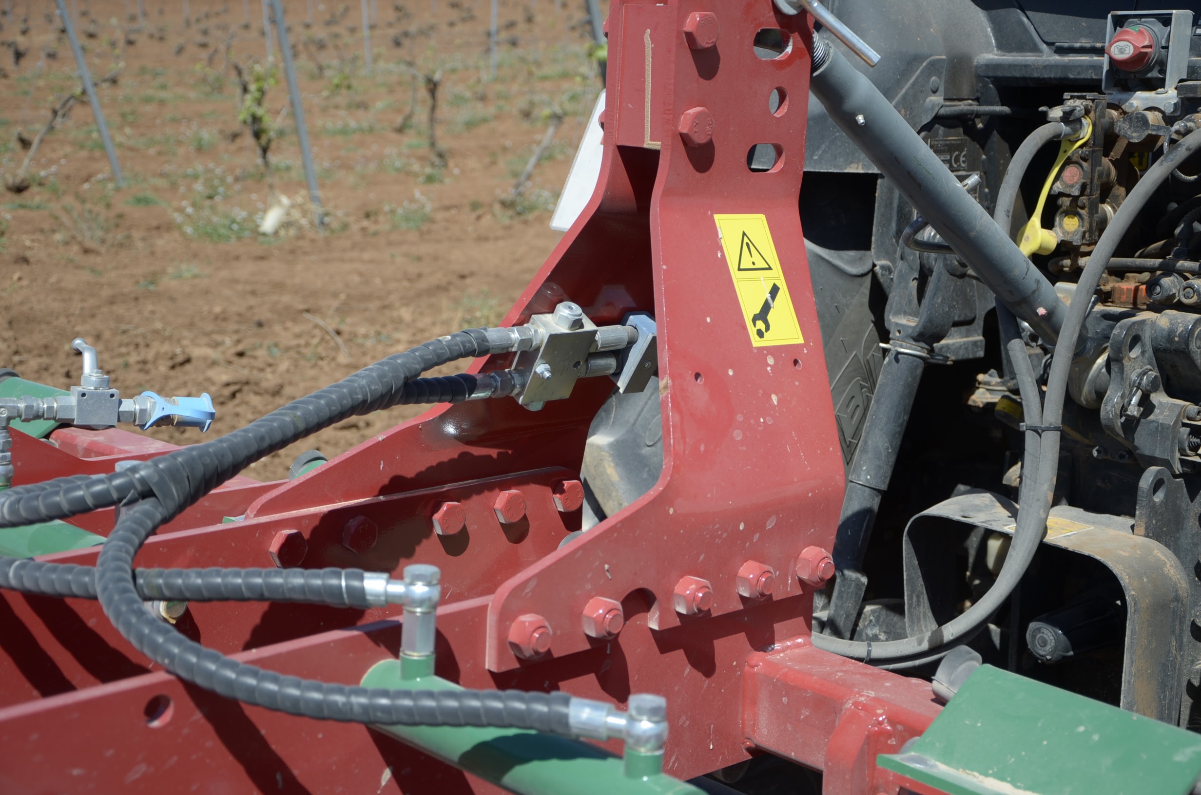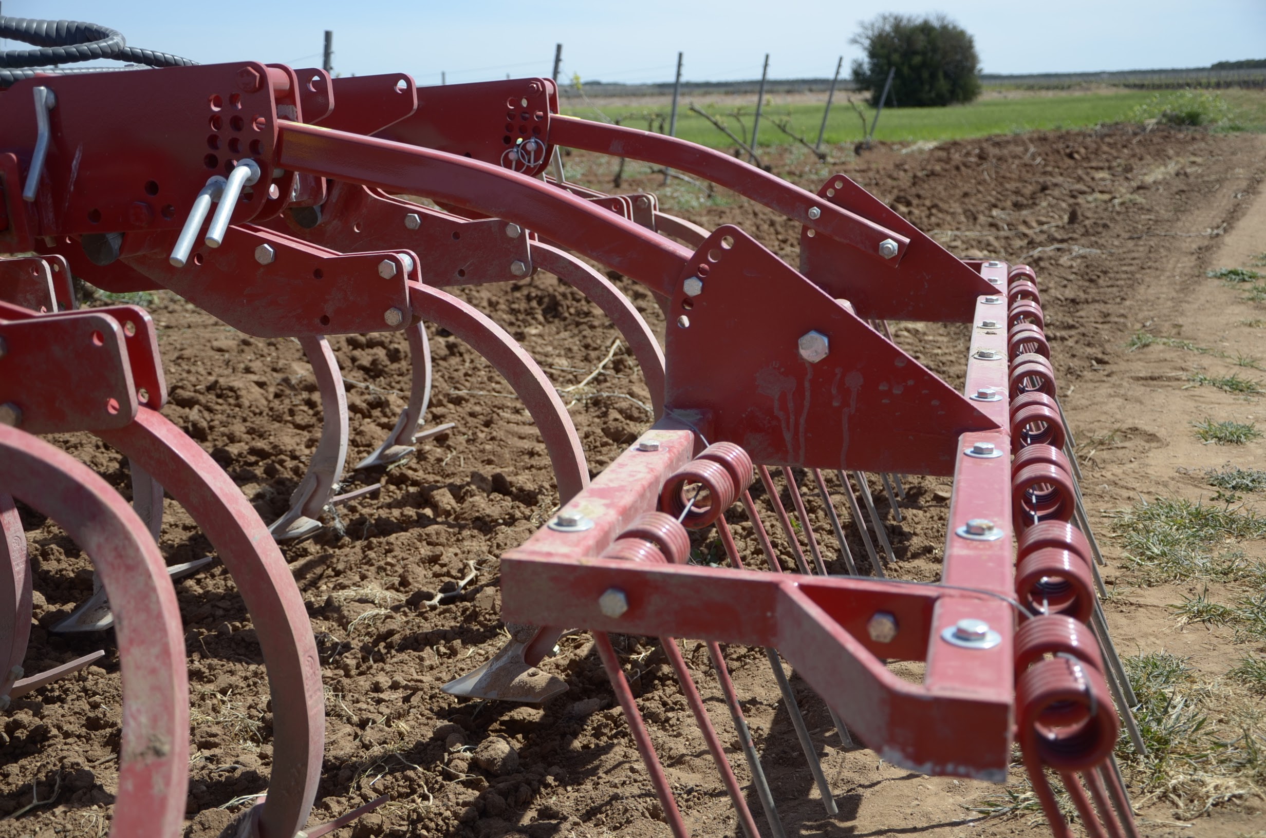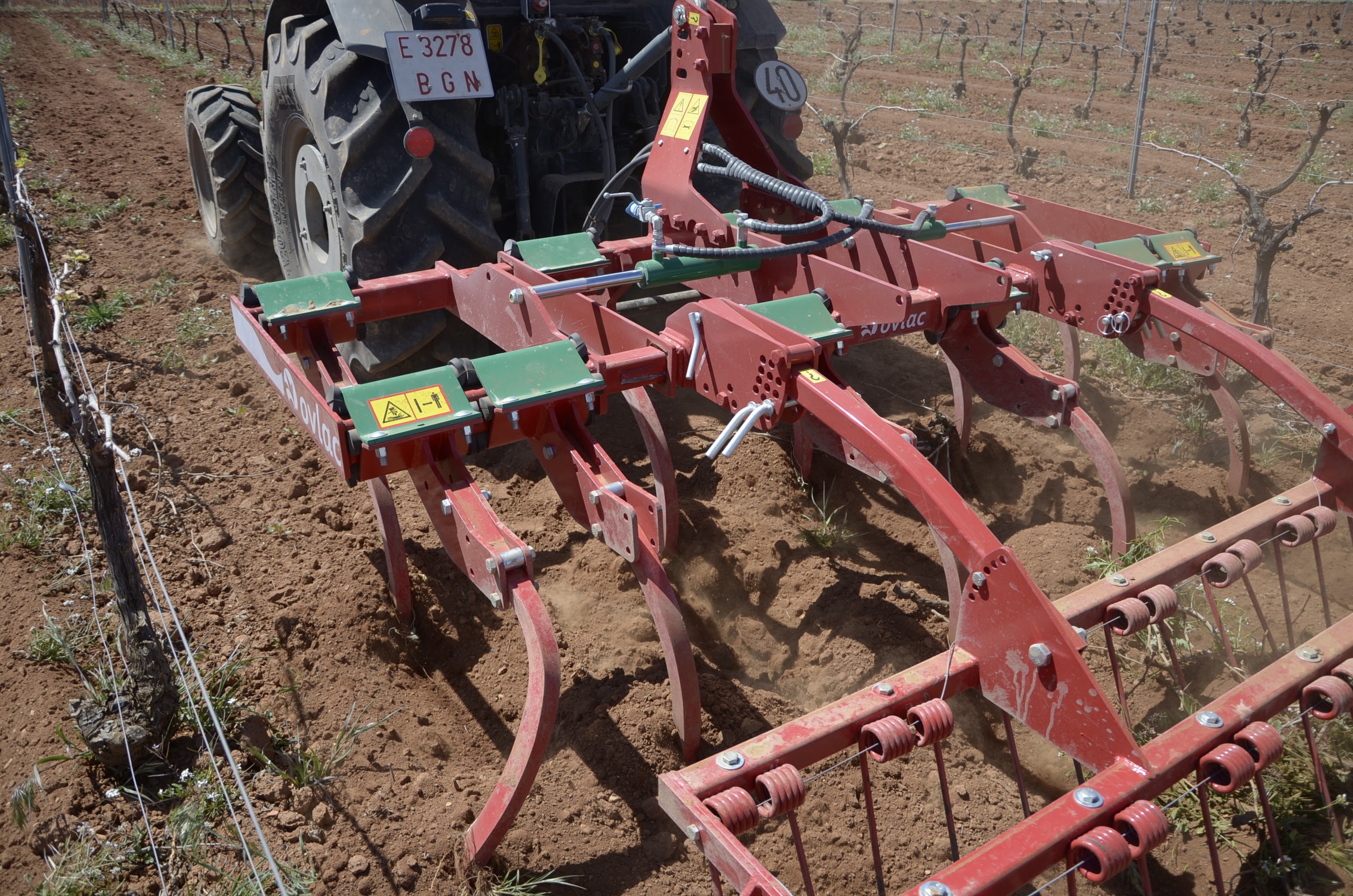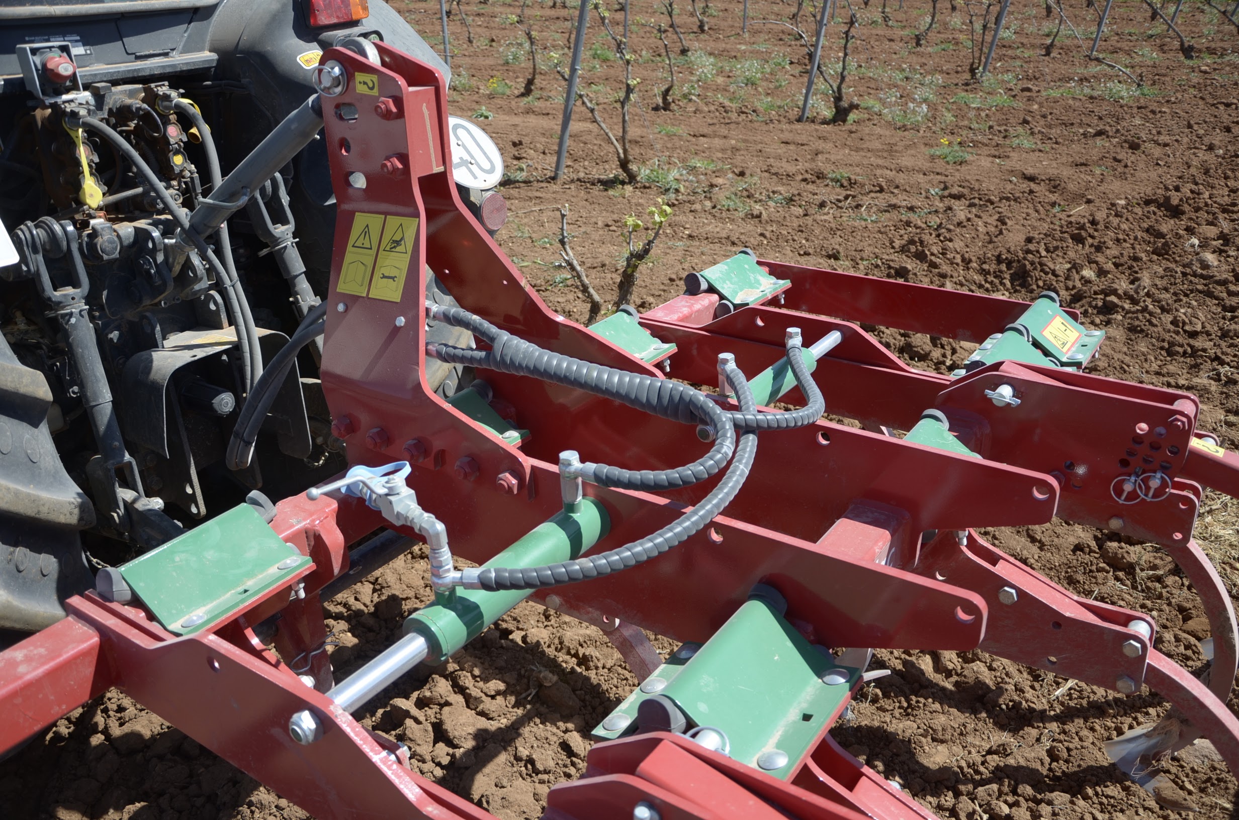 El viticultor puede elegir este apero con 7, 9 ó 11 brazos, teniendo una anchura de trabajo desde 1,65m hasta 2,95m. En cada uno de los extremos lleva un brazo curvo que ayuda a trabajar entre las vides. Este también se puede cambiar por un intercepas hidráulico o mecánico. En la demostración, pudimos comprobar que una mayor separación de ese arado curvo sería ideal para cuando hay mucho residuo.