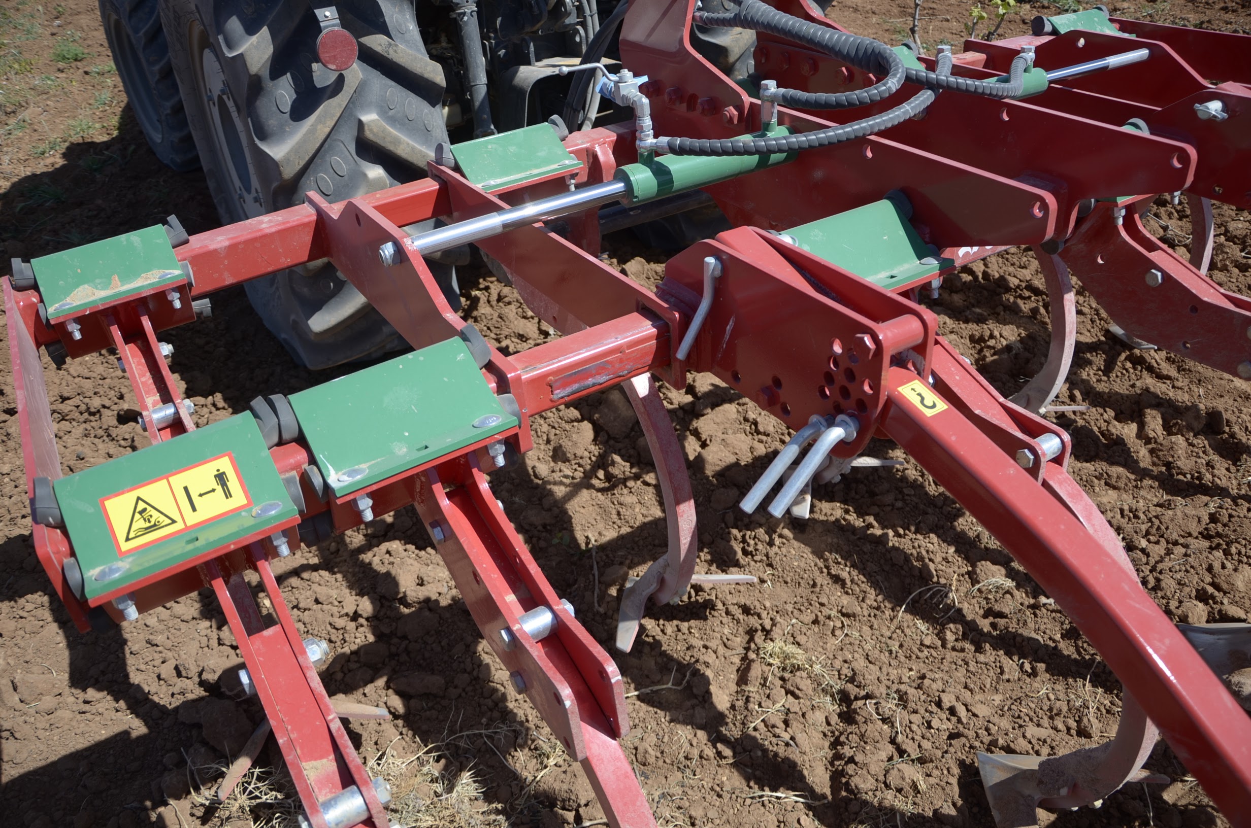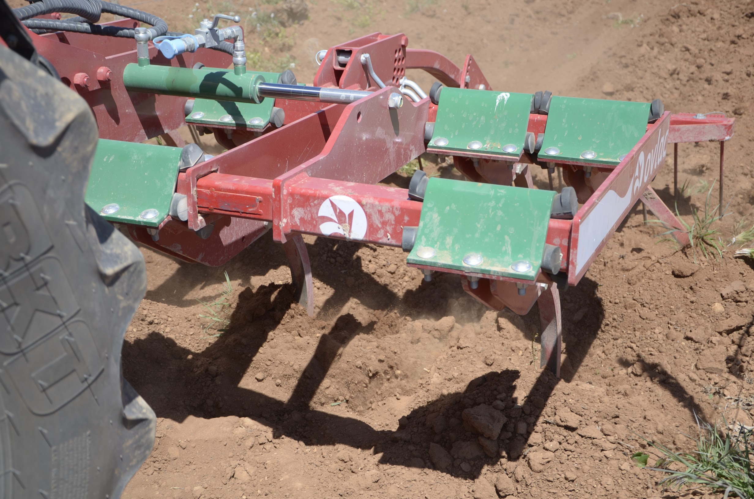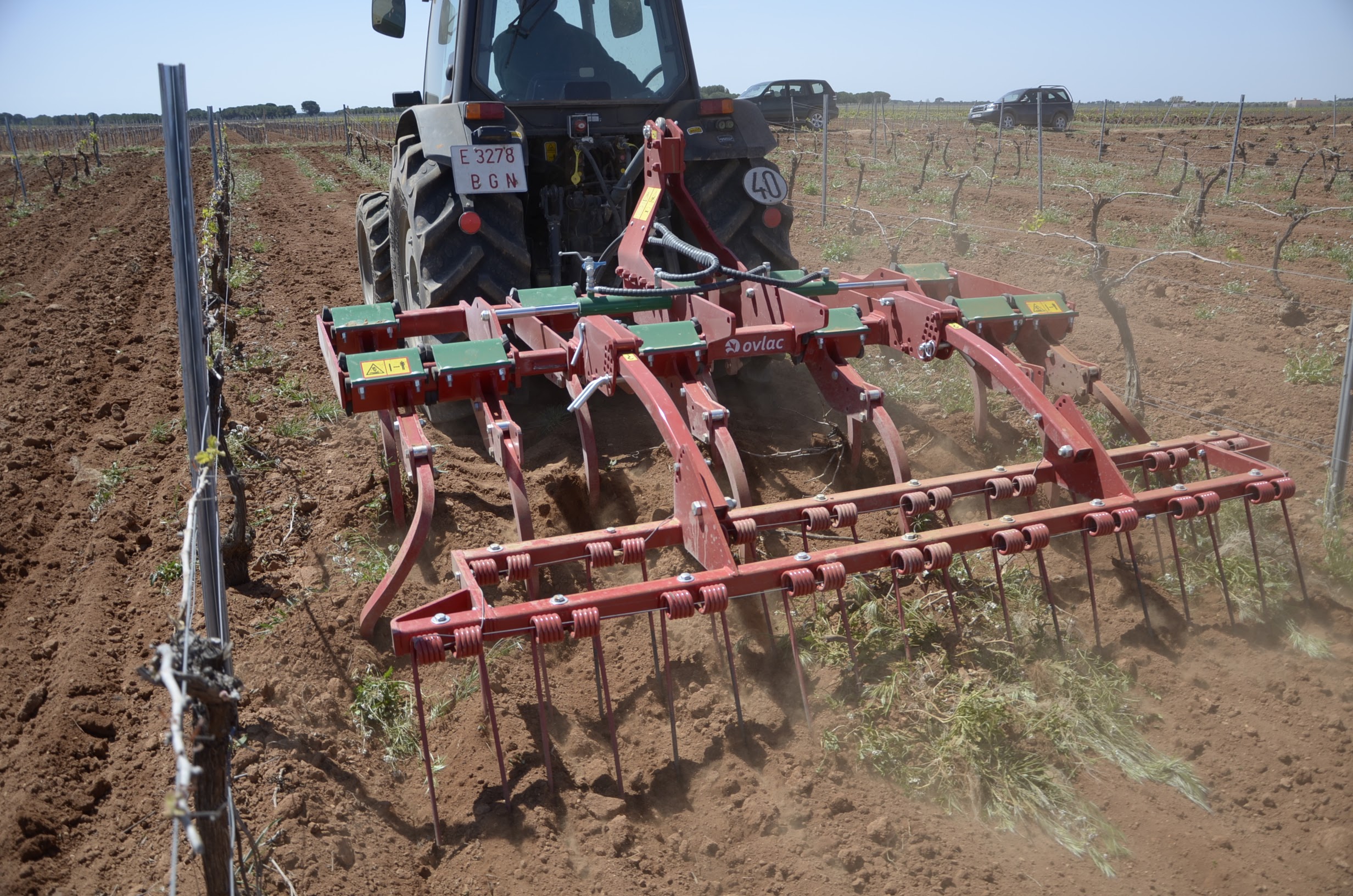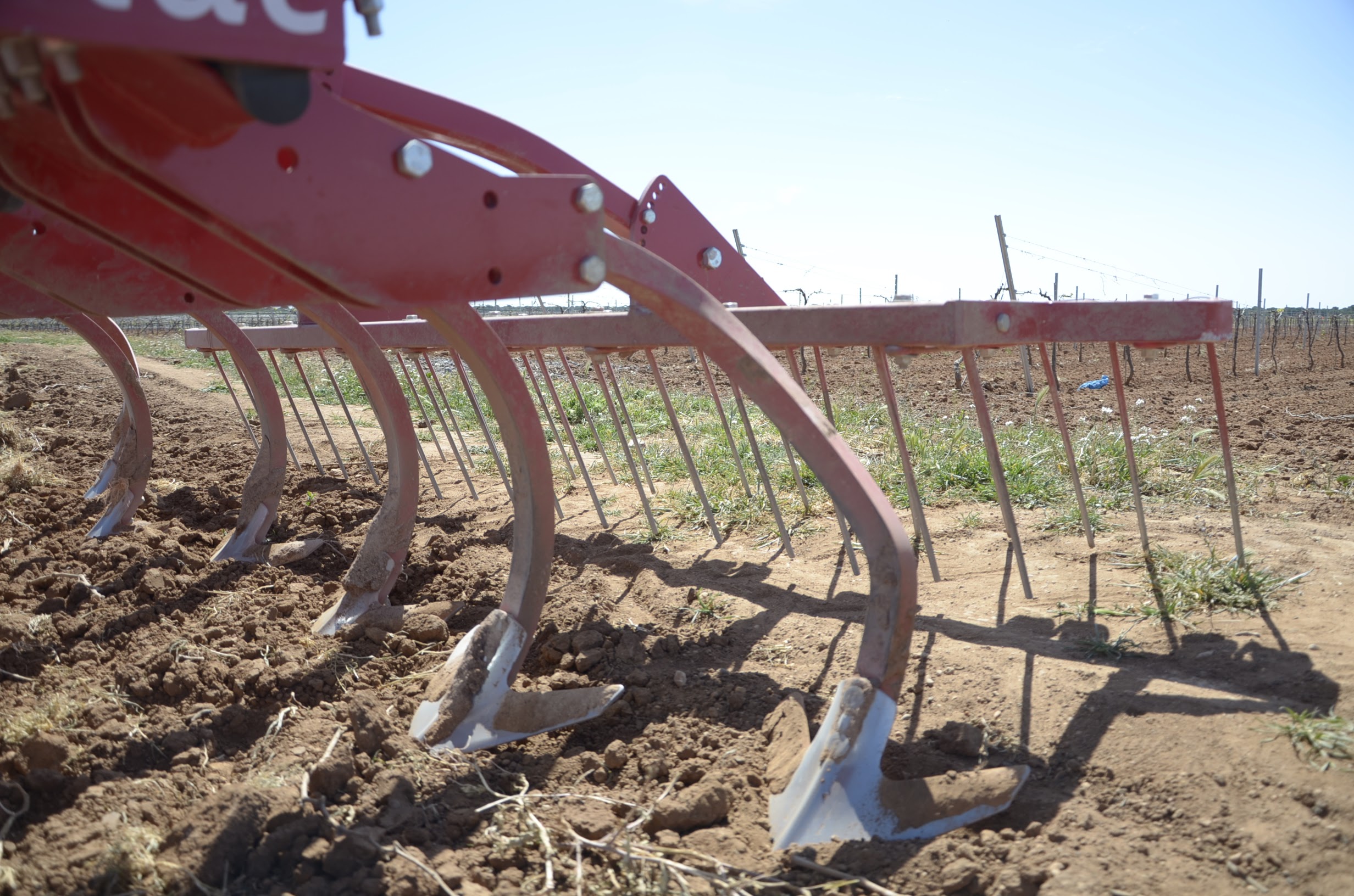El viticultor puede elegir este apero con 7, 9 ó 11 brazos, teniendo una anchura de trabajo desde 1,65m hasta 2,95m. En cada uno de los extremos lleva un brazo curvo que ayuda a trabajar entre las vides. Este también se puede cambiar por un intercepas hidráulico o mecánico. En la demostración, pudimos comprobar que una mayor separación de ese arado curvo sería ideal para cuando hay mucho residuo.