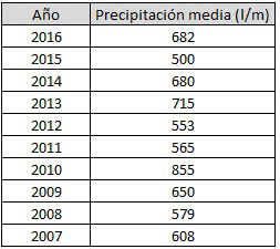Estos son datos generales de España muy poco tienen que ver con la zona centro en la que nos encontramos nosotros (La Mancha). En esta zona, vemos que la media entre el 2000 y el 2010 es de 520 mm (tenéis la información de todas las estaciones aquí) e incluso si nos movemos a años más recientes, este dato continúa bajando a una media de unos 450 mm.