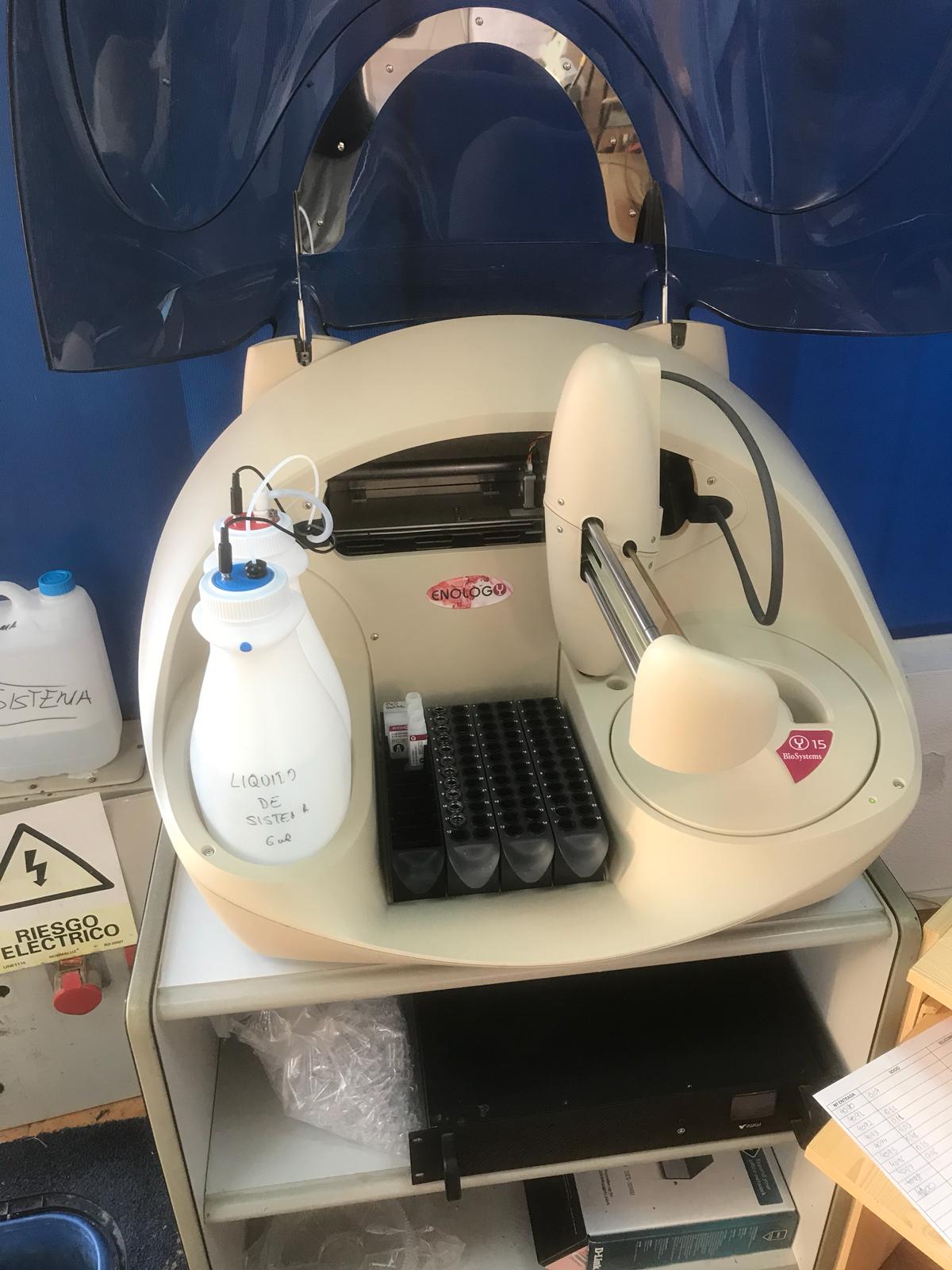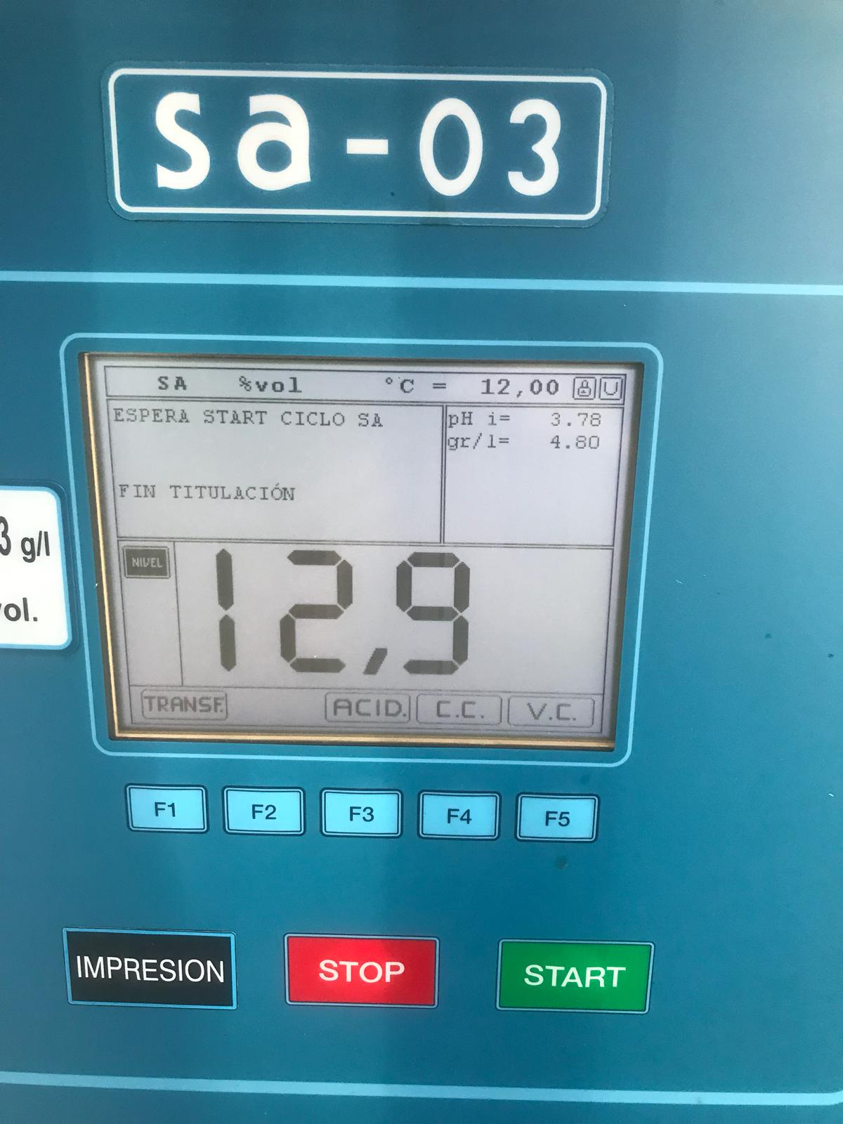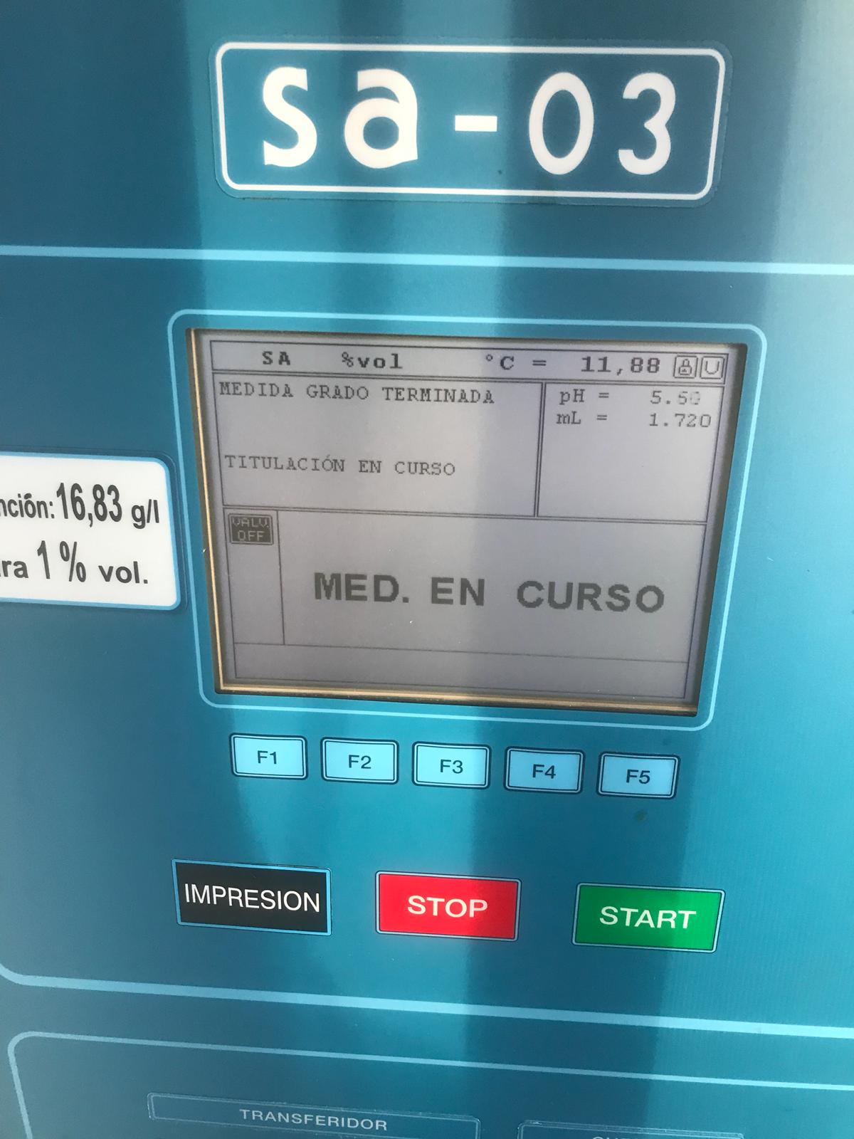 Oscar lleva toda su producción de uva a la Bodega Campos Reales, situada en El Provencio. Allí analizan la uva antes de entrar a la bodega (tienen 6 descargaderos para así poder organizar todas las entradas de diferentes variedades). La máquina que utilizan es mucho más precisa que el refractómetro de mano que hemos comentado anteriormente. Esta máquina saca multitud de parámetros durante los 7 minutos que tarde en analizar la muestra. Algunos de estos parámetros (como podéis ver en las fotos) son pH, acidez, potasio, podredumbre, grado alcohólico probable, … Sin duda alguna una de las mejores bodegas de Castilla-La Mancha que hace unos vinos extraordinarios.