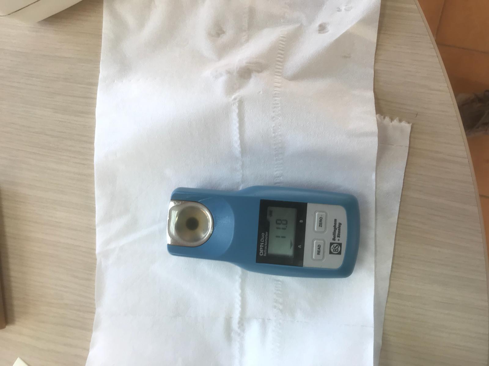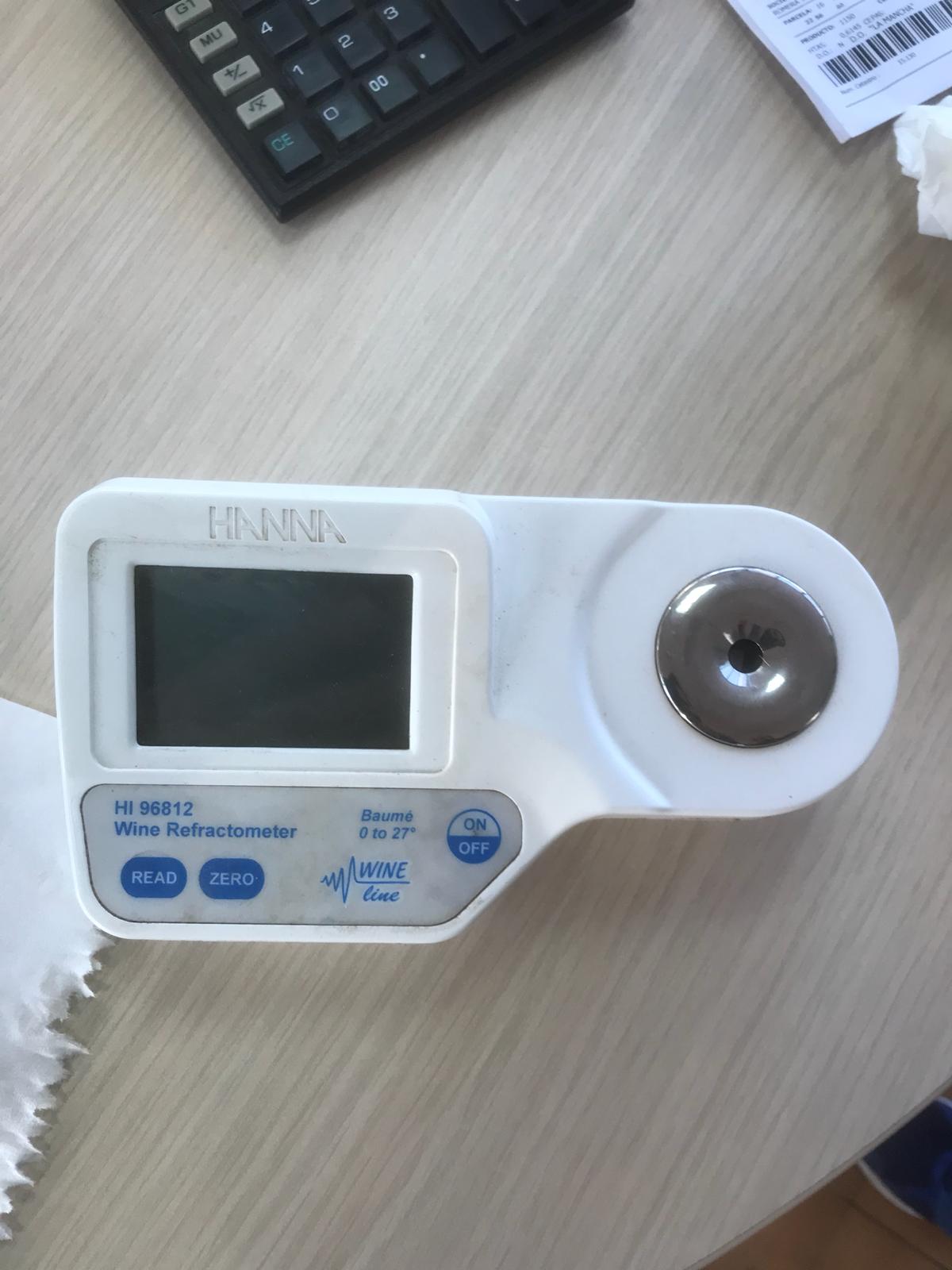 Para saber cuando el viticultor debe vendimiar, normalmente se utiliza un refractómetro de campo o de mano que ayuda a conocer el grado de azúcar aproximado del mosto de nuestras uvas. Para ello, es importante coger unas muestras representativas de la viña (como podéis ver en las fotos), recorriendo la parcela y seleccionando tanto uvas que están al sol (tal vez un 60% de la muestra) como uvas que no están expuestas al sol (un 40% de la muestra). También hay que tener en cuenta que el grado varía a lo largo del día y por la mañana el grado es menor que en las horas centrales del día. Una vez seleccionadas las uvas para la muestra, estas se tienen que exprimir al máximo para tener un mosto representativo. Una vez se tiene este mosto, se utiliza el refractómetro para ver el grado. Un refractómetro contiene en su interior un prisma que nos permite medir el índice de refracción del mosto de la uva. Para ello, la luz pasa a través de una fina capa de fluido y entra en el prisma de refracción, donde a través del ángulo de refracción producido, podemos evaluar o identificar una muestra de líquido. En nuestro caso, a partir del índice de refracción podemos conocer la concentración de azúcar (medida en grados Baume) de nuestra muestra. El refractómetro lleva en su interior una escala convertida directa a grados Baume para evitar el uso de tablas de conversión (podéis ver fotos del refractrómetro de mano de Oscar). El viticultor que no tiene refractómetro puede llevar una muestra a la bodega donde se la analizan gratuitamente, como podéis ver en las fotos. En algunas variedades como Verdejo, Moscatel, Cabernet, Sauvignon Blanc,… son los técnicos de la bodega quien hacen el seguimiento y fijan la fecha de vendimia.