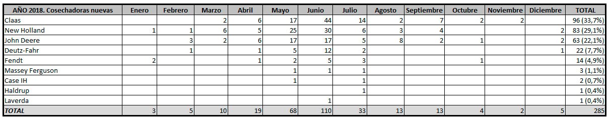 Por contra, tenemos que dar mención especial a las cosechadoras de cereal nuevas vendidas en España que en este 2018 han sido 285 unidades frente a las 304 unidades en 2017, 2016, 310 unidades en 2015 y 360 unidades en 2014, siendo el líder de nuevo Claas con 96 unidades. Este sector está completamente monopolizado por Claas (96 unidades), New Holland (83 unidades) y John Deere (63 unidades). El resto de fabricantes están a gran distancia destacando Deutz-Fahr con 22 unidades y Fendt con 14 unidades.