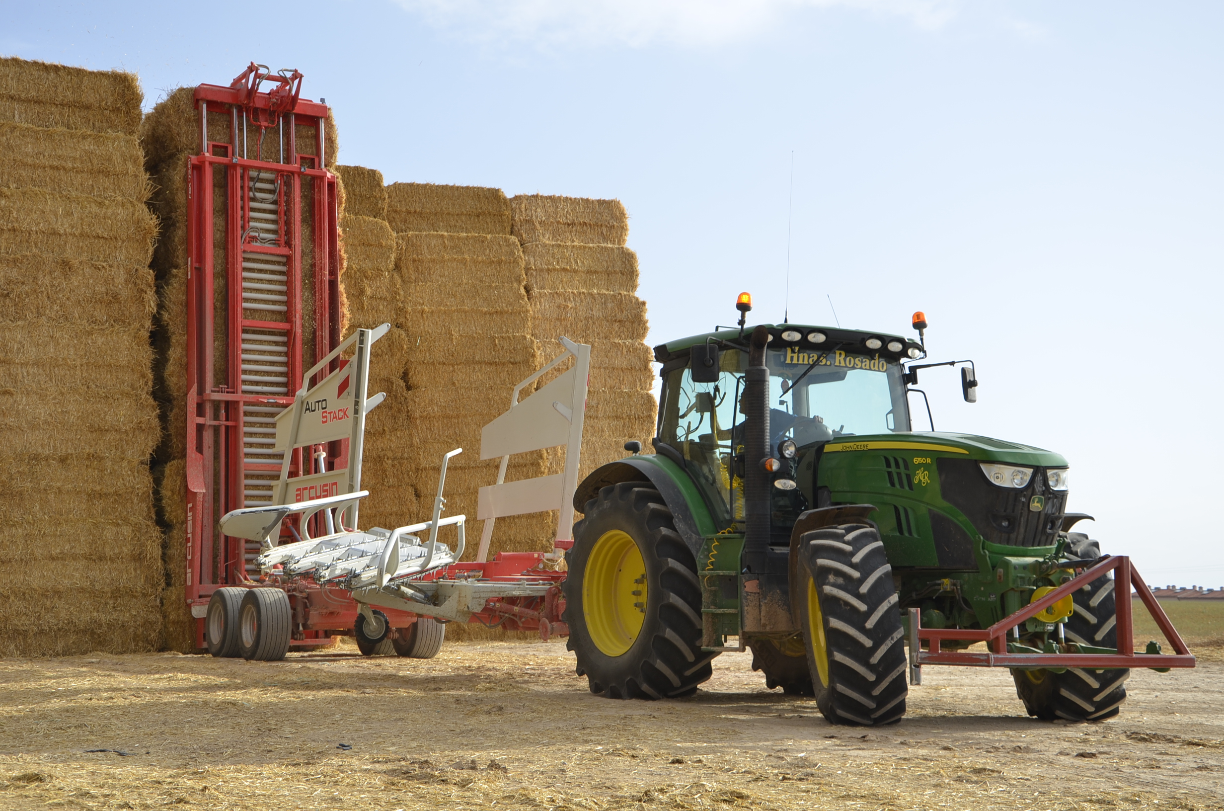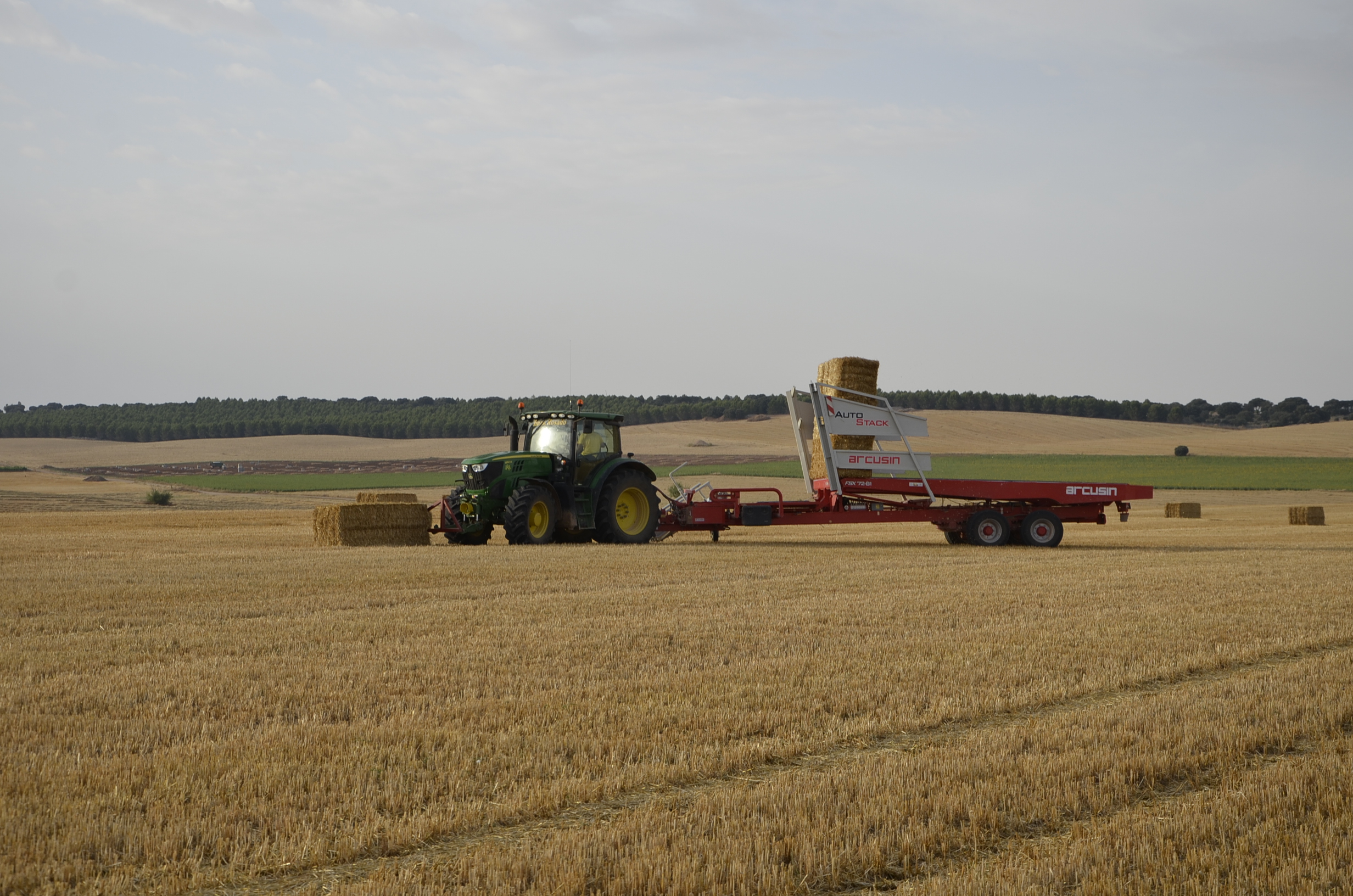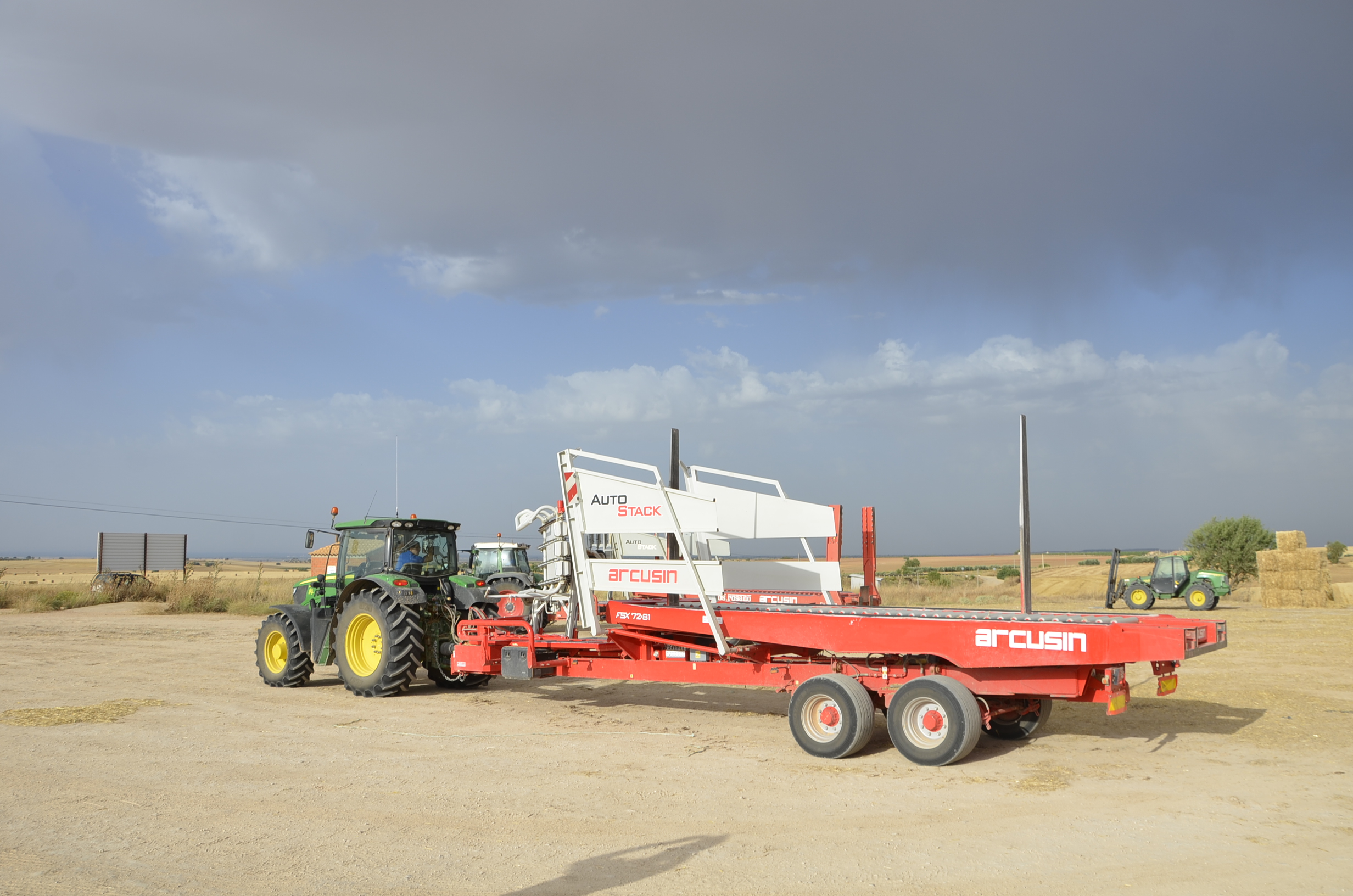 Las empresas de empacado que trabajan en nuestro pueblo disponen de tres remolques Arcusin y uno Plegamatic; para trabajar en todo el término esta maquinaria se queda bastante corta ya que además hay que recoger todas las pacas en pocas semanas… aún así hacen un buen trabajo. En esta ocasión visitamos a la empresa “Hnos. Rosado” que este año han comprado otro remolque Arcusin AutoStack FSX (ya disponían de uno) como podéis ver en nuestro vídeo y fotos. El trabajo con estos remolques es muy sencillo y sobre todo rápido (el remolque está completamente robotizado). Disponen de varios sitios donde dejar las pacas para así no tener que hacer muchos kilómetros de transporte. El remolque se carga muy rápidamente, en unos 6 minutos se puede tener cargado con las 27 pacas (90x80cm) o con las 18 pacas (90x120cm), por lo que si la descarga se hace en una zona cercana a la parcela de trabajo, esta queda sin pacas en muy pocos minutos.