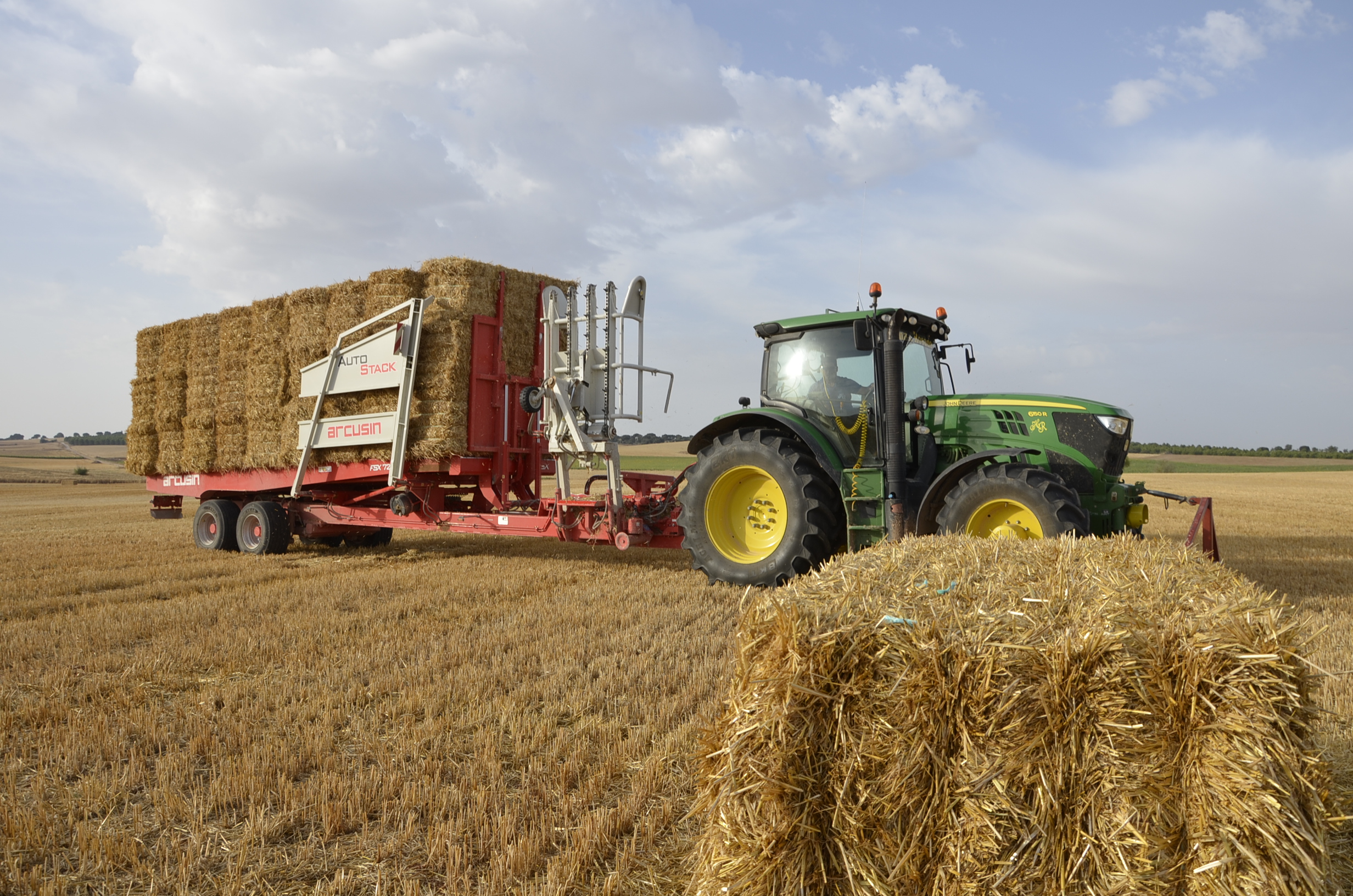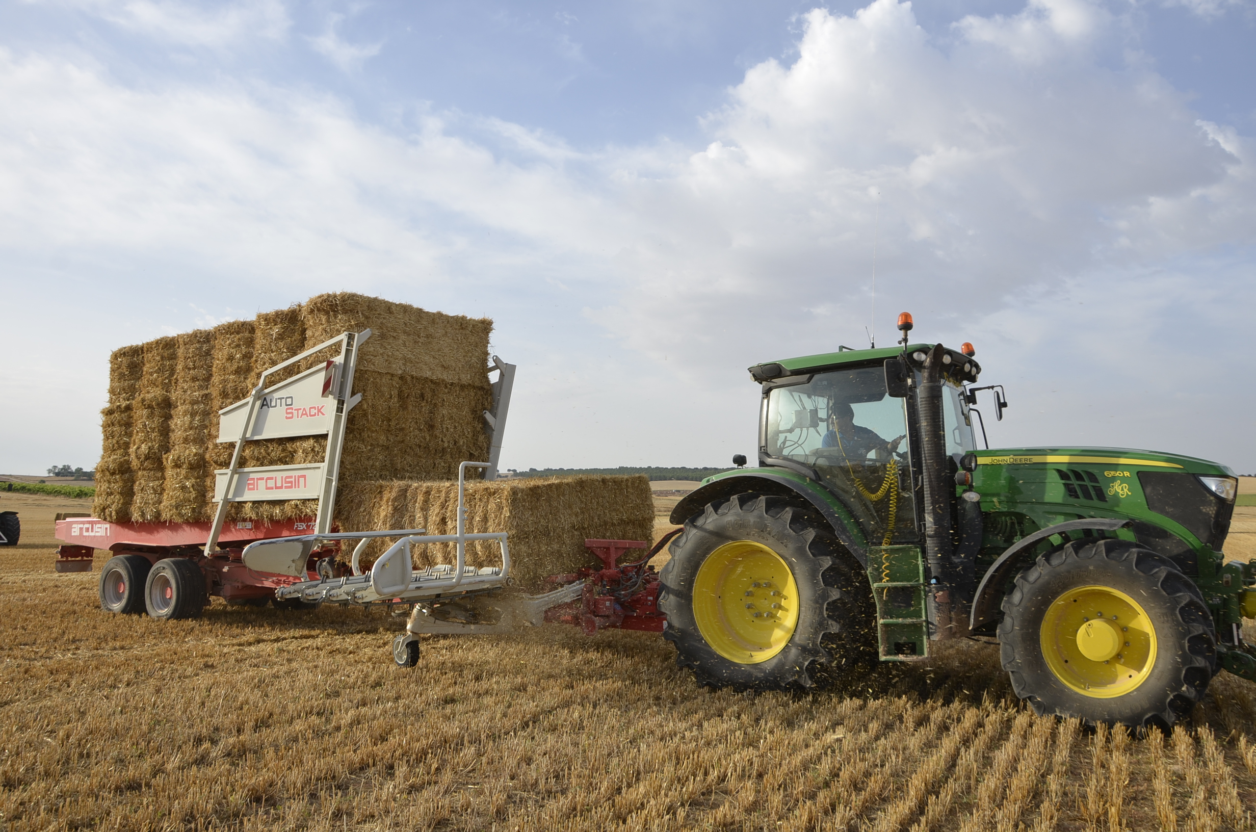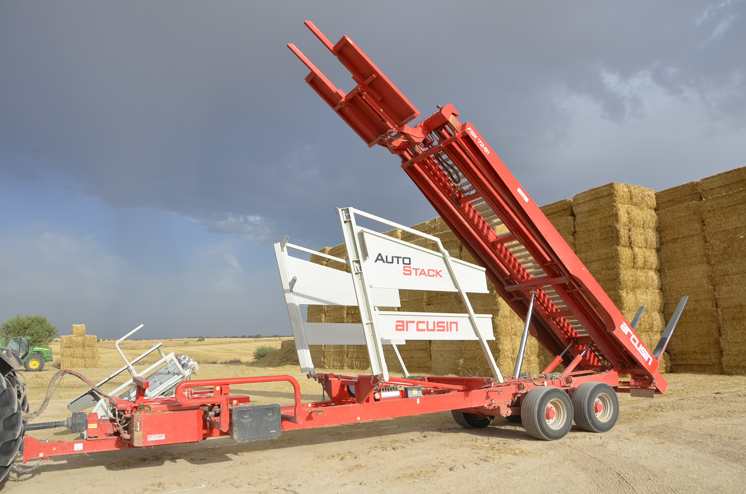 Las empresas de empacado que trabajan en nuestro pueblo disponen de tres remolques Arcusin y uno Plegamatic; para trabajar en todo el término esta maquinaria se queda bastante corta ya que además hay que recoger todas las pacas en pocas semanas… aún así hacen un buen trabajo. En esta ocasión visitamos a la empresa “Hnos. Rosado” que este año han comprado otro remolque Arcusin AutoStack FSX (ya disponían de uno) como podéis ver en nuestro vídeo y fotos. El trabajo con estos remolques es muy sencillo y sobre todo rápido (el remolque está completamente robotizado). Disponen de varios sitios donde dejar las pacas para así no tener que hacer muchos kilómetros de transporte. El remolque se carga muy rápidamente, en unos 6 minutos se puede tener cargado con las 27 pacas (90x80cm) o con las 18 pacas (90x120cm), por lo que si la descarga se hace en una zona cercana a la parcela de trabajo, esta queda sin pacas en muy pocos minutos.