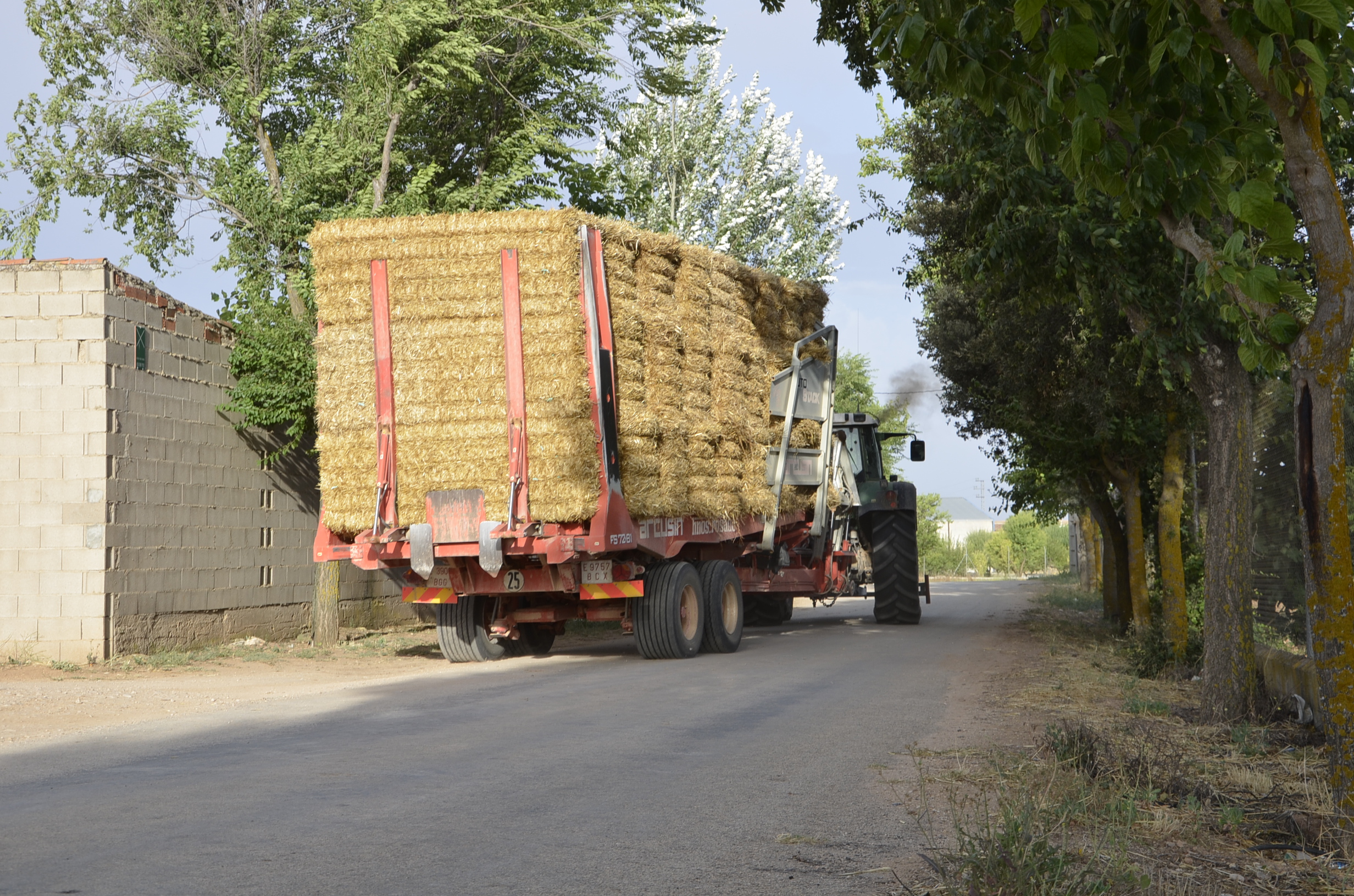 Como os comentamos, tres empresas dedicadas al empacado son las que se encargan de trabajar en el término de nuestro pueblo (La Alberca de Záncara – Cuenca). El término tiene unas 10.000 hectáreas y hay que recoger las pacas en un tiempo breve ya que tenemos la costumbre de comenzar a levantar los rastrojos en el mes de agosto para así poder destruir los restos de paja durante los días de calor en los que esta tarea es más sencilla que en los días de septiembre cuando el clima comienza a ser más fresco y húmedo. Prácticamente todas las pacas se recogen con los carros autocargadores, aunque en alguna ocasión son los camiones los que se trasladan al campo para ser allí cargados… pero es mínimo en comparación con el trabajo que realizan los remolques autocargadores.