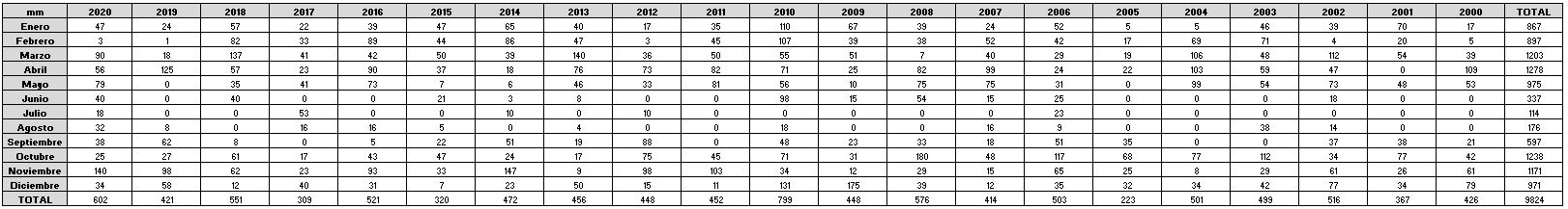 Como ya es habitual, os mostramos datos anuales de lluvia de nuestra zona. Son datos muy localizados (La Alberca de Záncara – Cuenca), pero pensamos que el patrón de lluvias que comentaremos a continuación podrían ser aplicables, sobre todo, a la zona centro de España (la zona norte y la zona sur tienen bastantes más precipitaciones a lo largo del año).