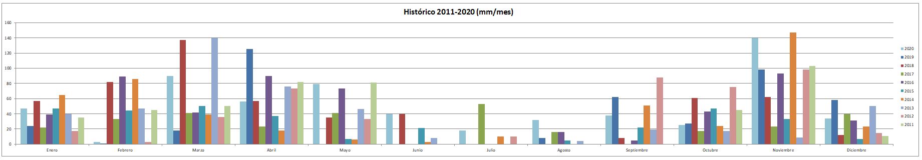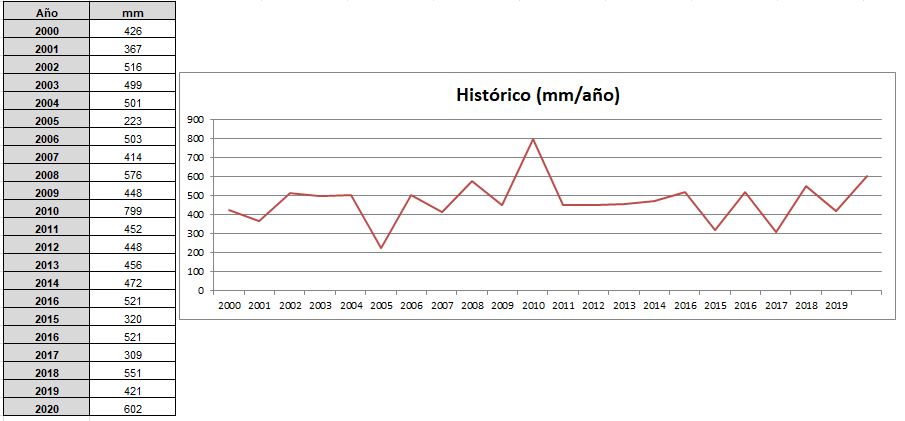 Como resumen, el año 2020 lo podemos considerar como un año muy bueno en cuanto a lluvias. El mes de marzo (90 mm) del pasado año comenzó a llover y prácticamente no paró hasta terminar el año. Con un total de 602 mm, sólo el año 2010 lo supera como podéis ver en el histórico de los últimos 21 años. La media de precipitaciones de los últimos años sube a 470 mm. El mes de noviembre fue muy lluvioso (140 mm) y pudimos sembrar con un tempero perfecto. Durante los meses abril y mayo se generó una muy buena cosecha de cereal aunque en algunos casos la roya perjudicó a algunas parcelas debido a la humedad por tanta lluvia… hay que estar atentos y hacer un tratamiento con fungicidas si es posible para evitar ese tipo de enfermedades.