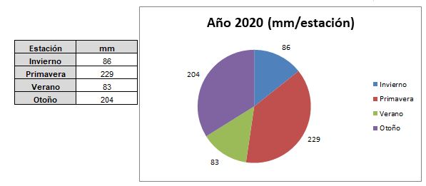 Si nos centramos en las lluvias por estaciones del año, vemos que en esta ocasión la más lluviosa ha sido primavera (normalmente suele ser otoño o invierno). Como hemos comentado antes, la primavera fue bastante lluviosa y hubo muy buena cosecha (parcelas de cebada Planet de hasta 7.000 kg/ha… lo podéis ver en este vídeo).
