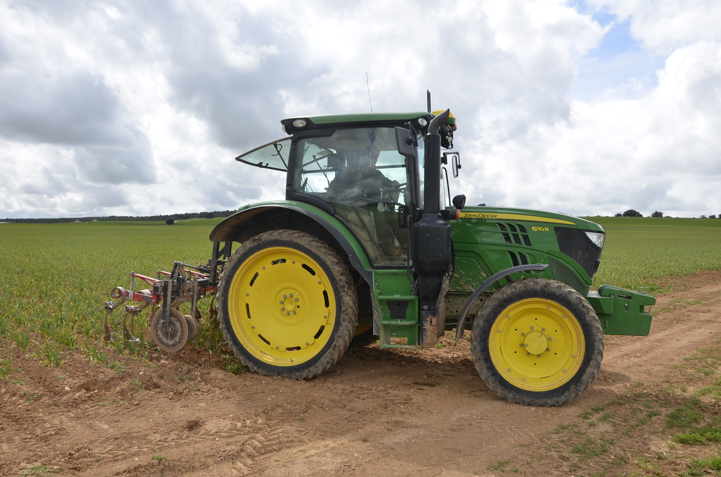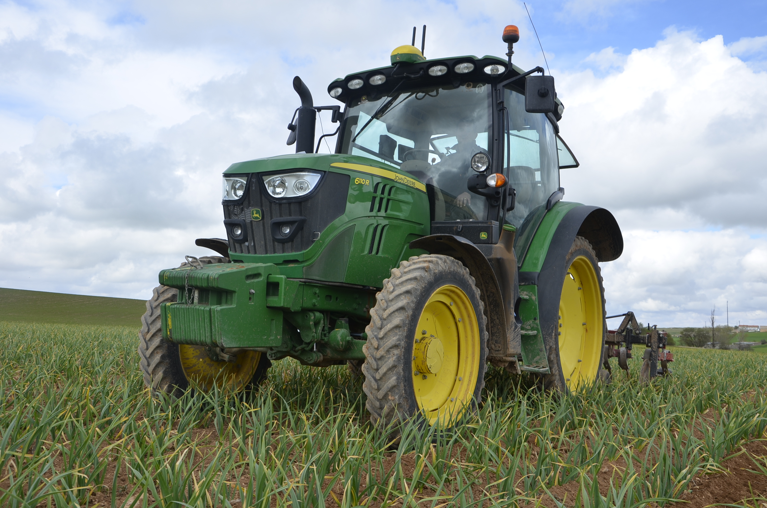 Nos interesaba ver a Julián trabajando en plena faena ya que estaba utilizando el auto guiado John Deere con señal RTK y el surcador del fabricante local J. Quílez… Amén del 6110R que siempre es un tractor con el que se te van los ojos. Trabajar con el auto guiado metido entre surcos de ajos a 45cm es siempre muy curioso de ver trabajar. Por otra parte, ver el surcador J. Quiléz también es interesante ya que está diseñado con tres vibro cultivadores por surcos y sobre todo porque el chasis tiene un sistema que se puede desplazar según vas trabajando. Este chasis se desplaza mediante un sistema hidráulico para así poder corregir posibles errores sobre todo en laderas donde el tractor, debido a las ruedas tan estrechas que tiene, puede sufrir deslizamientos.