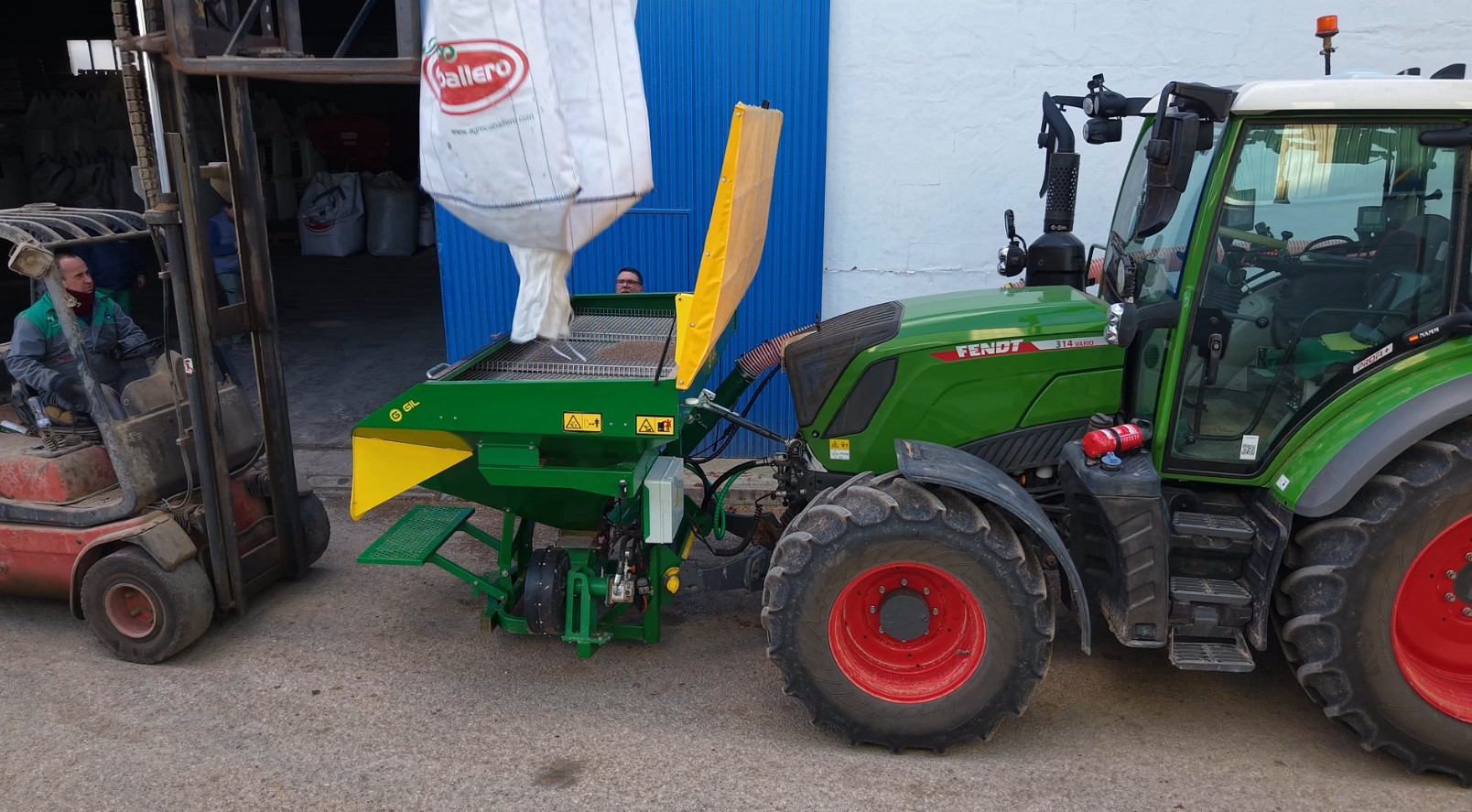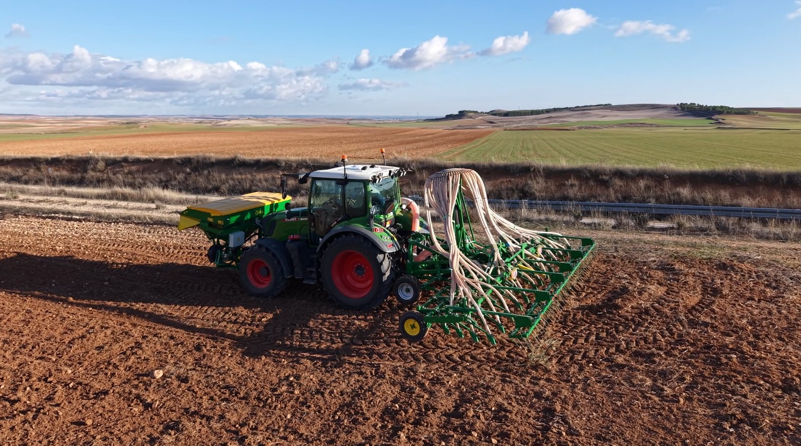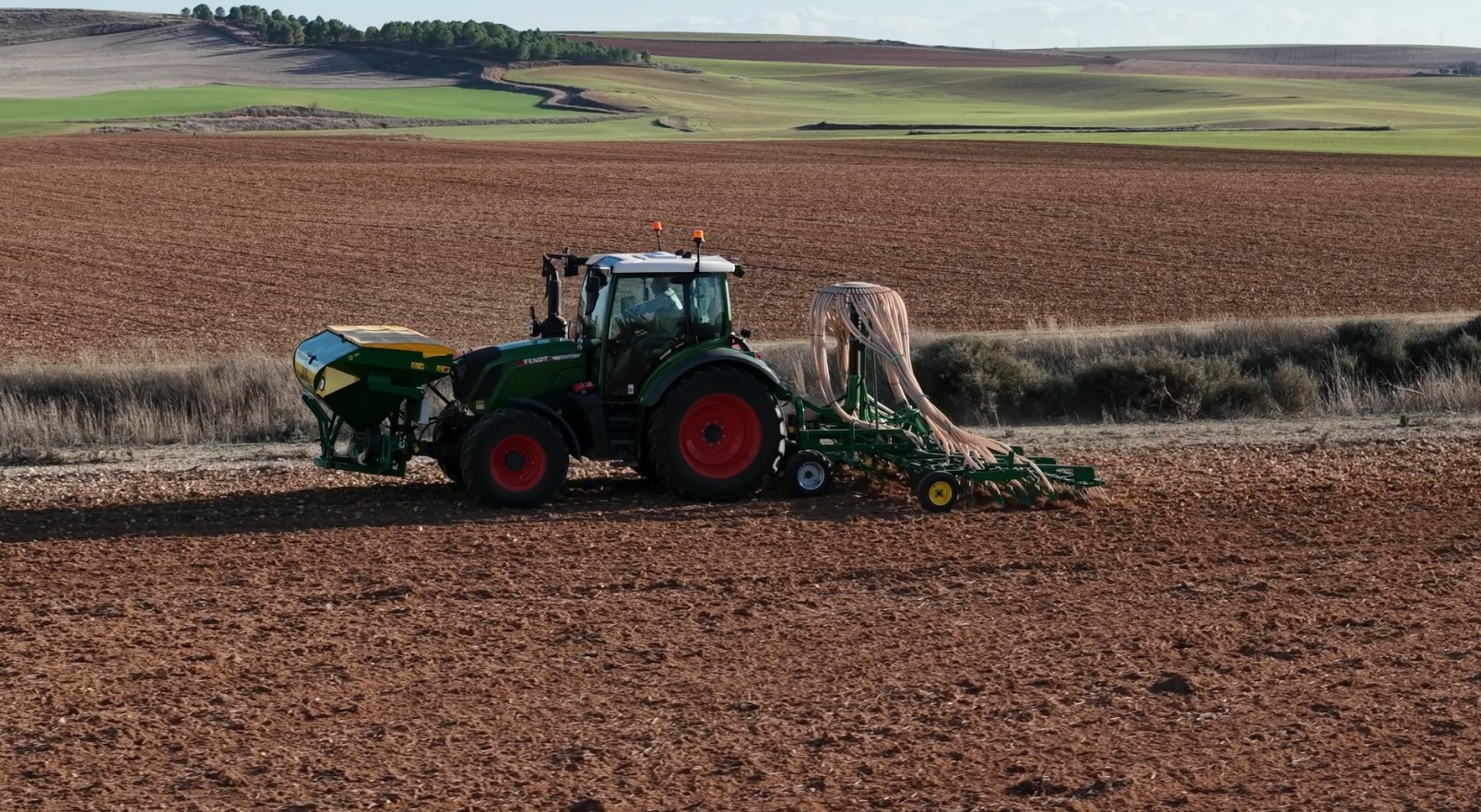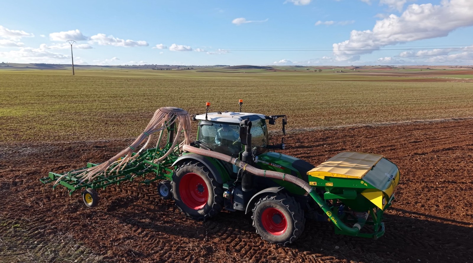 Aprovechamos también esta entrada dedicada a la sementera para presentaros la sembradora Gil de nuestro amigo Nemesio. ¿Qué tiene de especial? Como podéis ver, la tolva va situada en la parte delantera del tractor y en la parte trasera solo lleva el tren de siembra. Esto tiene una ventaja principal: permite utilizar una sembradora de gran capacidad con un tractor pequeño (Nemesio tiene el Fendt 314 Vario Profi+). Como sabéis, las sembradoras (los “pulpos”, como coloquialmente las llamamos) suelen requerir tractores de alta potencia para trabajar sin problemas, sobre todo durante el transporte y en las maniobras en cabeceras con pendiente. Con este tipo de sembradora, un tractor de potencia media trabaja sin dificultad, ya que el peso de la máquina está mejor repartido.