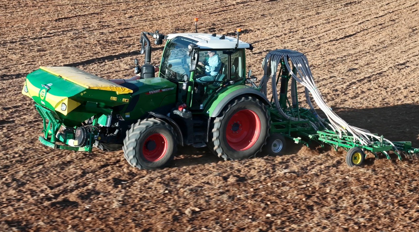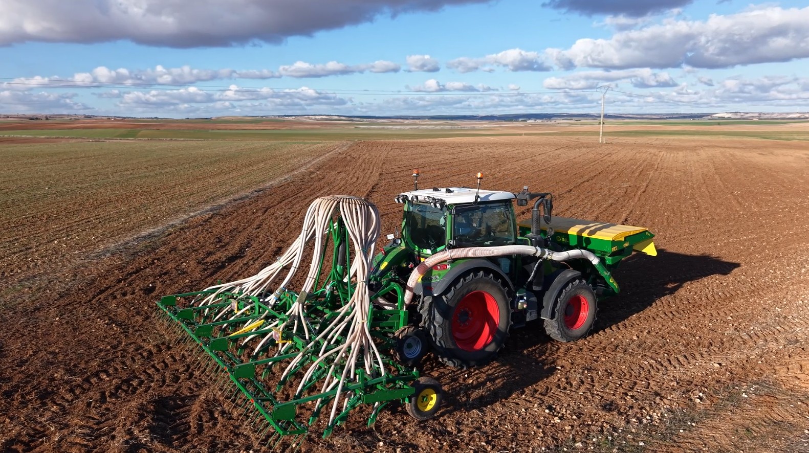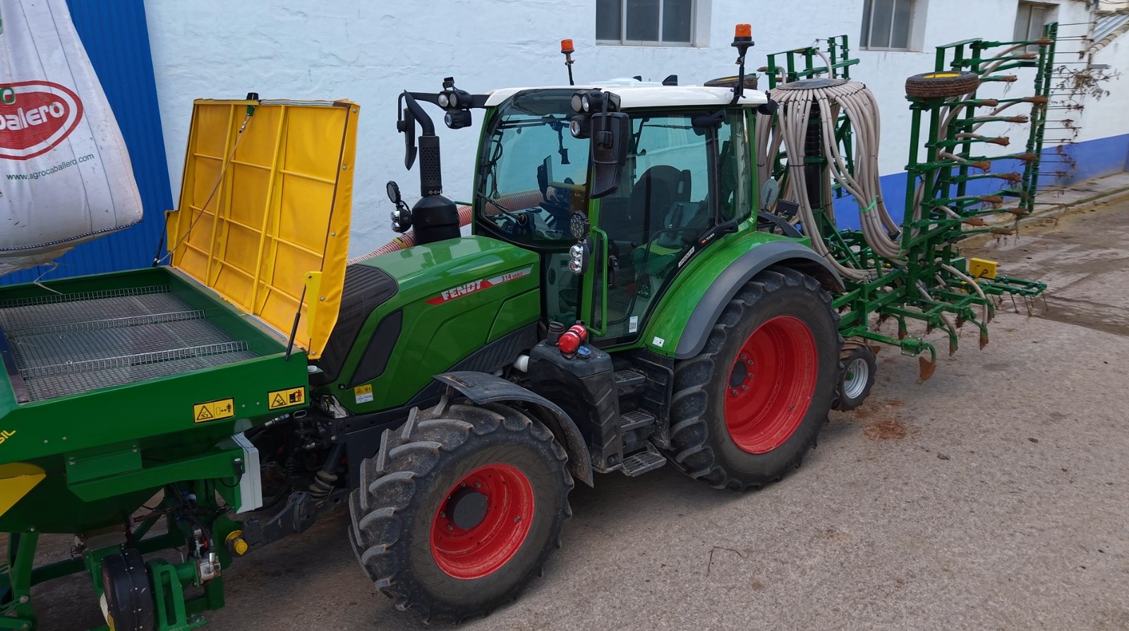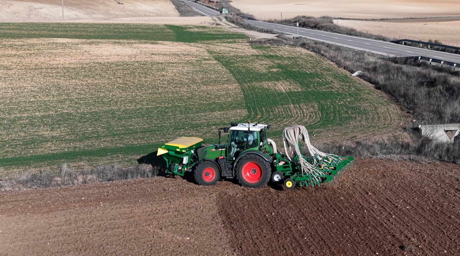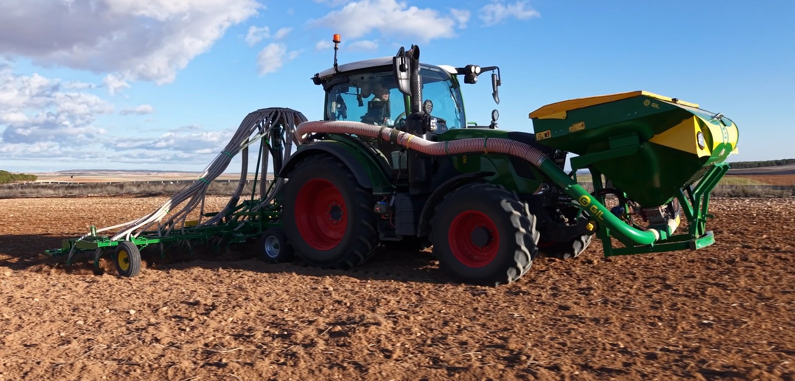 Aprovechamos también esta entrada dedicada a la sementera para presentaros la sembradora Gil de nuestro amigo Nemesio. ¿Qué tiene de especial? Como podéis ver, la tolva va situada en la parte delantera del tractor y en la parte trasera solo lleva el tren de siembra. Esto tiene una ventaja principal: permite utilizar una sembradora de gran capacidad con un tractor pequeño (Nemesio tiene el Fendt 314 Vario Profi+). Como sabéis, las sembradoras (los “pulpos”, como coloquialmente las llamamos) suelen requerir tractores de alta potencia para trabajar sin problemas, sobre todo durante el transporte y en las maniobras en cabeceras con pendiente. Con este tipo de sembradora, un tractor de potencia media trabaja sin dificultad, ya que el peso de la máquina está mejor repartido.