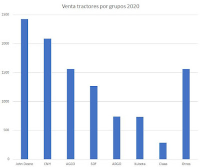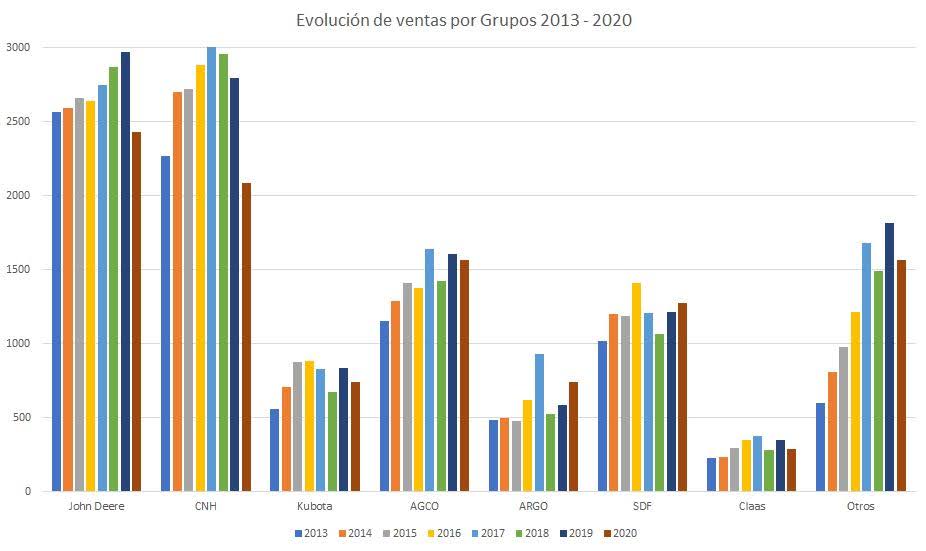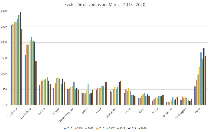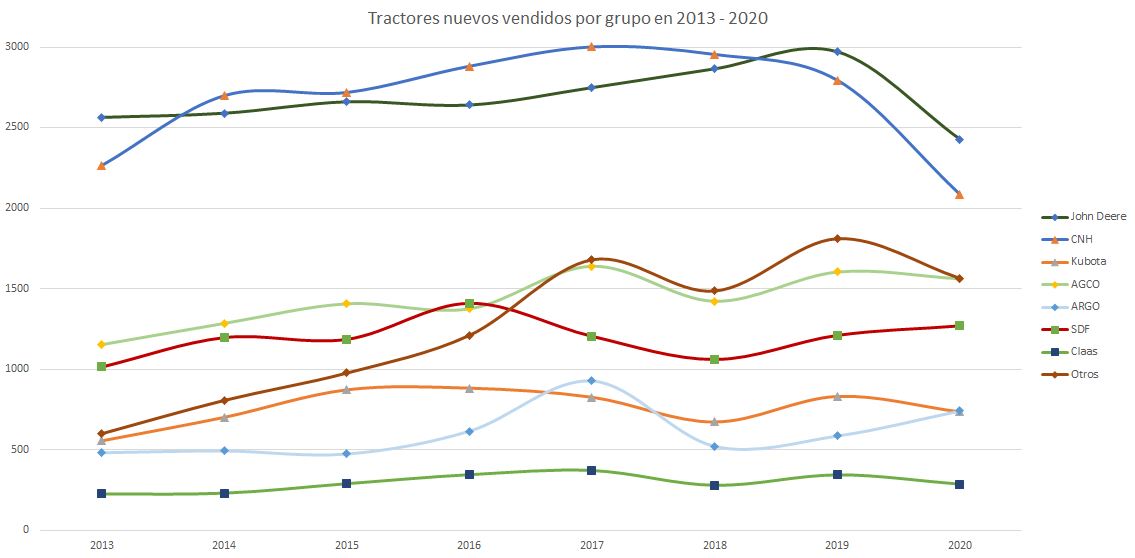 Las ventas de tractores nuevos por marcas siguen lideradas por John Deere (2.429 unidades en 2020, 2.972 unidades en 2019 y  2.866 unidades en 2018) y New Holland (1.403 unidades en 2020, 2.021 unidades en 2019 y 2.059 unidades en 2018). Este año John Deere mantiene el liderato en las ventas por grupo comercial. Nos gustaría destacar las subidas de Deutz-Fahr y Fendt en la venta de tractores nuevos por marcas que han llegado a las posiciones tercera y cuarta del ranking, posiciones que el año pasado ocupaban Kubota y CaseIH. A continuación podéis ver en la gráfica las ventas por marca: