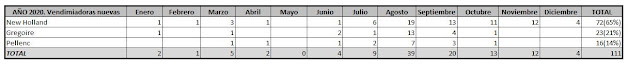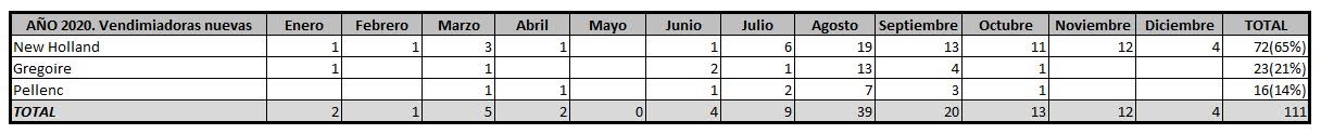 Siguiendo con maquinaria de recolección autopropulsada, nos queda hablar de las ventas de vendimiadoras autopropulsadas nuevas que este año siguen aumentando respecto a años anteriores, llegando a la cifra de 111 unidades (107 unidades en 2019 y 100 unidades en 2018). Vuelve a liderar el mercado, un año más, New Holland con un 65% de las ventas. Podemos concluir, que el mercado lleva varios años con una cifra bastante estable que ronda las 100 unidades vendidas nuevas. Pensamos que es una buena cantidad que hace pensar que el sector vitivinícola y del olivar son sectores con gran potencial.
