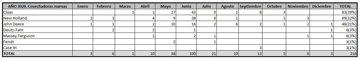 La caída de ventas de maquinaria nueva se salva gracias a la venta de cosechadoras de cereal, destacando en este 2020 las 216 unidades vendidas frente a las 201 unidades en el 2019 (285 unidades en 2018 y 304 unidades en 2017), De nuevo, el líder sigue siendo Claas. La barrera de las 300 unidades vendidas queda lejos año tras año. Este sector está completamente monopolizado por Claas (83 unidades), New Holland (69 unidades) y John Deere (46 unidades). Cabe comentar también que el resto de fabricantes, que hace años parecía que tendrían una fuerte importancia en el mercado, se van diluyendo cada año, teniendo cifras de ventas prácticamente insignificantes: Deutz-Fahr (6 unidades), Massey Ferguson (6 unidades), Fendt (3 unidades) y Case IH (3 unidades).