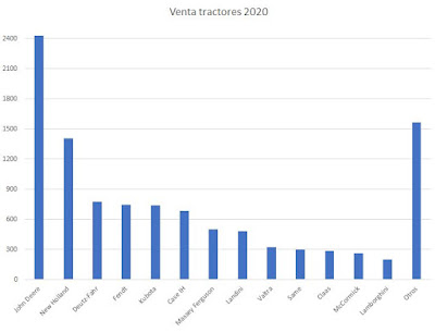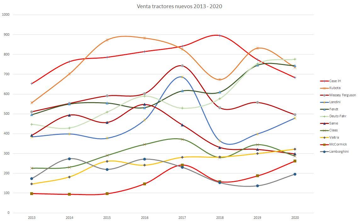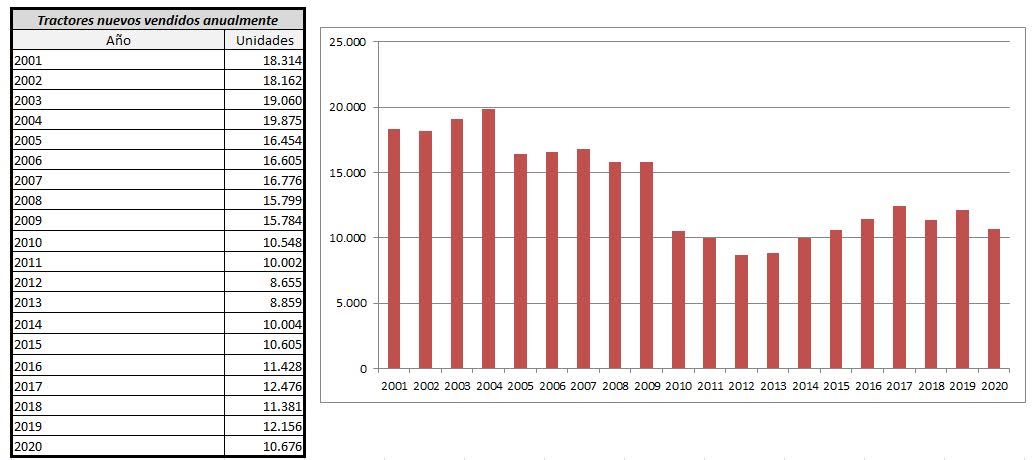 La cifra de tractores nuevos vendidos ha disminuido a los 10.676 (en 2019 fue de 12.156). Una cifra que está en la línea de los 10.000 tractores nuevos vendidos anualmente que es la cifra de referencia desde hace 10 años. Nuestra apuesta (durante este verano) sería una cifra en torno a los 9.000 por lo que se ha superado con creces, por tanto se puede decir que no ha sido un mal año en cuanto a la venta de tractores nuevos se refiere.