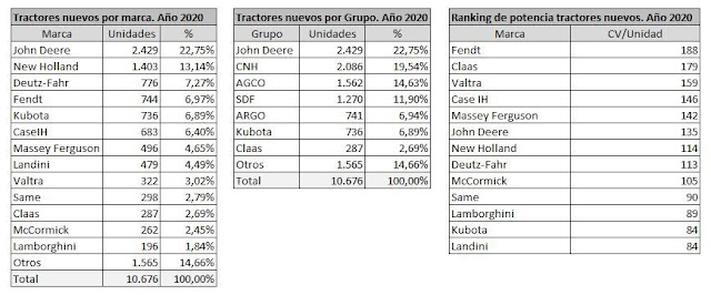 Por otro lado, un dato interesante a analizar es la marca más vendida por potencia media en la que Fendt continúa siendo líder un año más con 188 CV/tractor, (178 CV/tractor en 2019 y 176 CV/tractor  en 2018). Tenéis más información en las siguientes tablas: