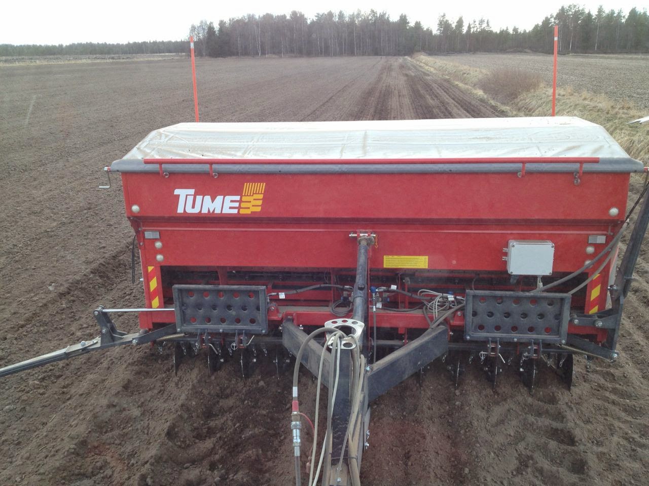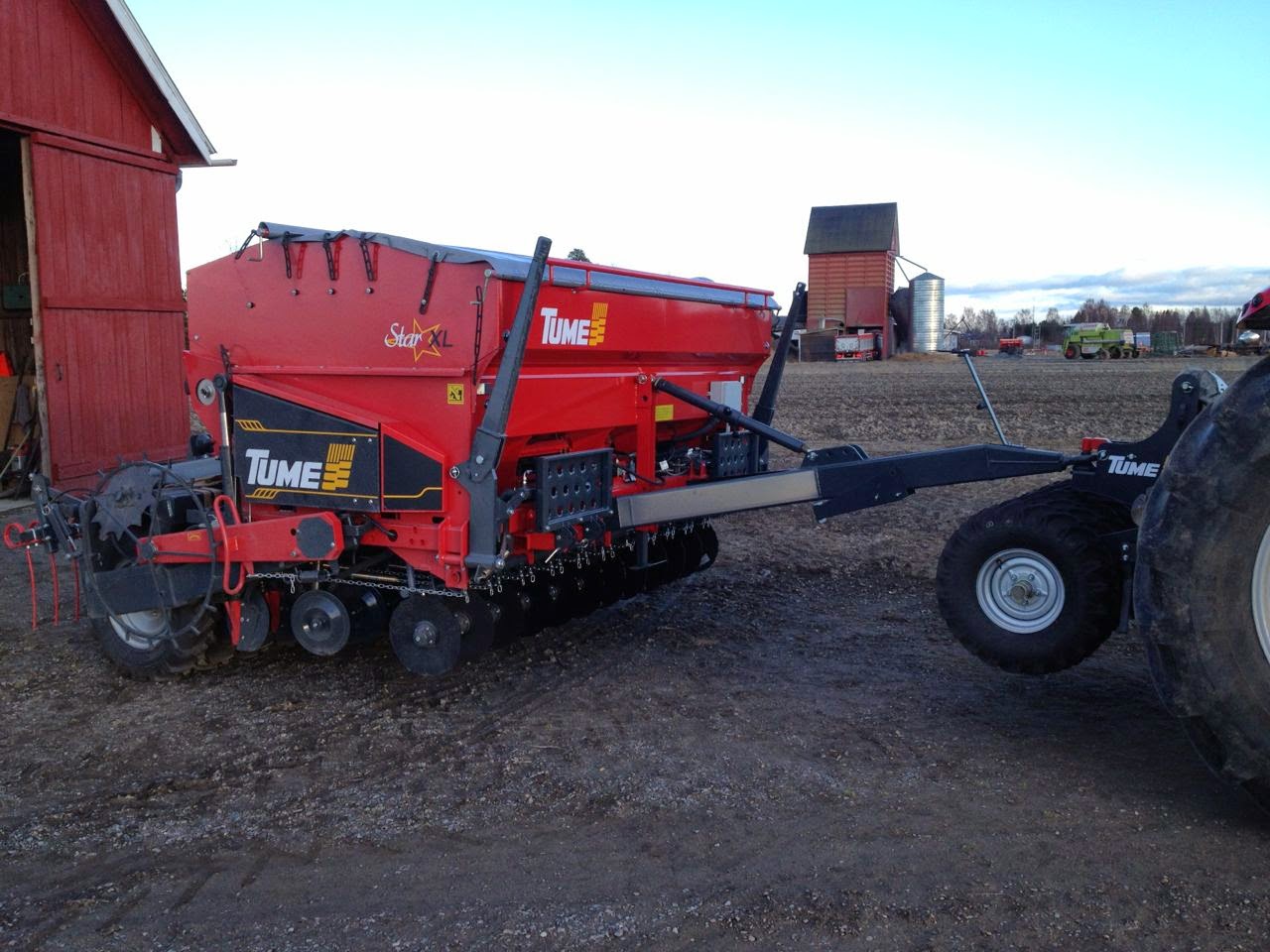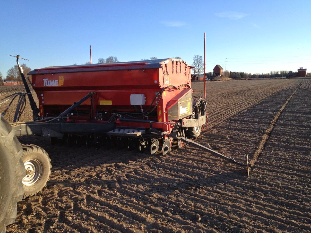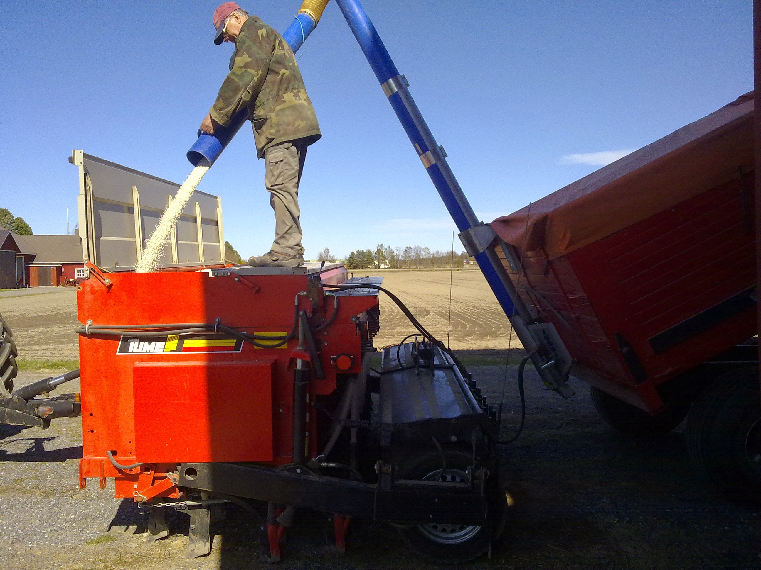 Su nueva sembrador es la Tume JC Star XL 3000 (fabricada en Finlandia). Es básicamente muy similar a su antigua sembradora la cual ha estado trabajando sin problemas durante los últimos 17 años. Esta tiene una tolva para semilla y otra para abono (el cual es puesto a unos 2-3cm por debajo de la semilla). Además tiene otra pequeña tolva para abono que es puesto al mismo nivel que la semilla. La capacidad total de la tolva es de 3.700 litros y esta se puede configurar para semilla y abono según las cantidades que se utilicen. La sembradora está diseñada para sembrar tanto en laboreo tradicional como en mínimo laboreo. Como el verano allí es muy corto (el tiempo para que se desarrolle el cultivo es de unos 3-4 meses) el mejor método de siembra es poner el abono debajo de la semilla. La pequeña cantidad de abono que se pone al mismo nivel es para ayudar a la planta a nacer (esto no es muy obligatorio). Muchos agricultores de su zona, tampoco hacen esta técnica de sembrado, pero a él le da muy buenos resultados.