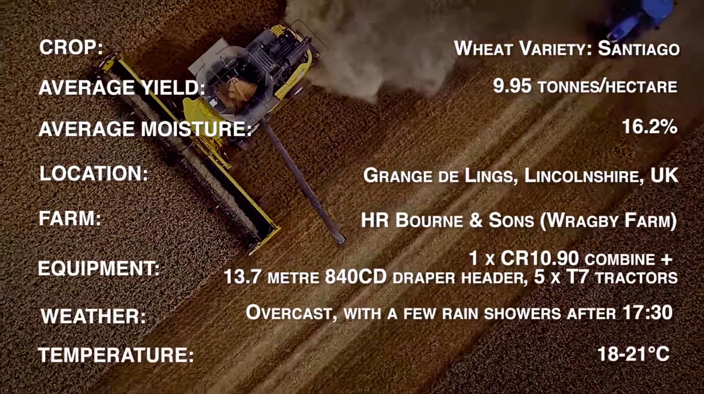 La cosecha del día de la consecución del récord, que se inició a las 11:17 horas, se llevó a cabo con una meteorología variable, una temperatura ambiente de entre 18 y 21 °C y ligeros chubascos a partir de las 17:30 horas. La producción media de la CR10.90 fue de 99,7 toneladas por hora, con un máximo de 135 toneladas/hora, un rendimiento medio de 9,95 toneladas por hectárea y un contenido de humedad medio del 16,2%. El récord se consiguió con un consumo de apenas 1,12 litros de combustible por tonelada de grano cosechado y el picador de paja accionado a lo largo de todo el día.