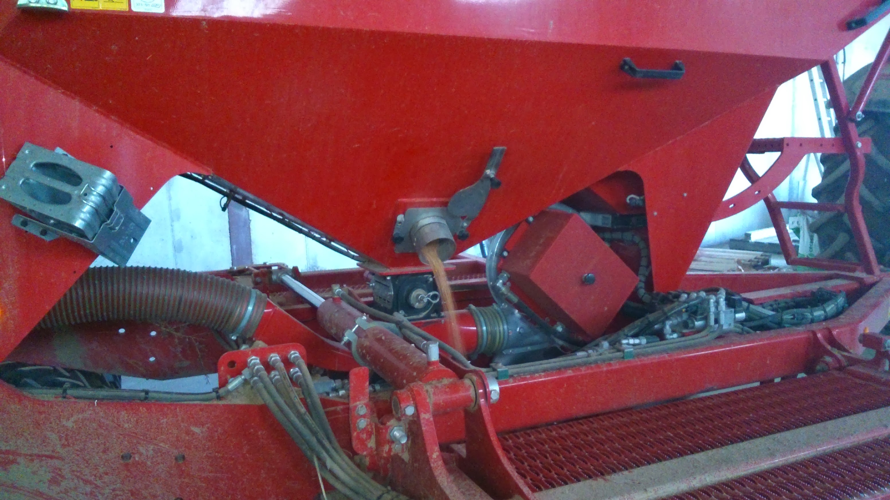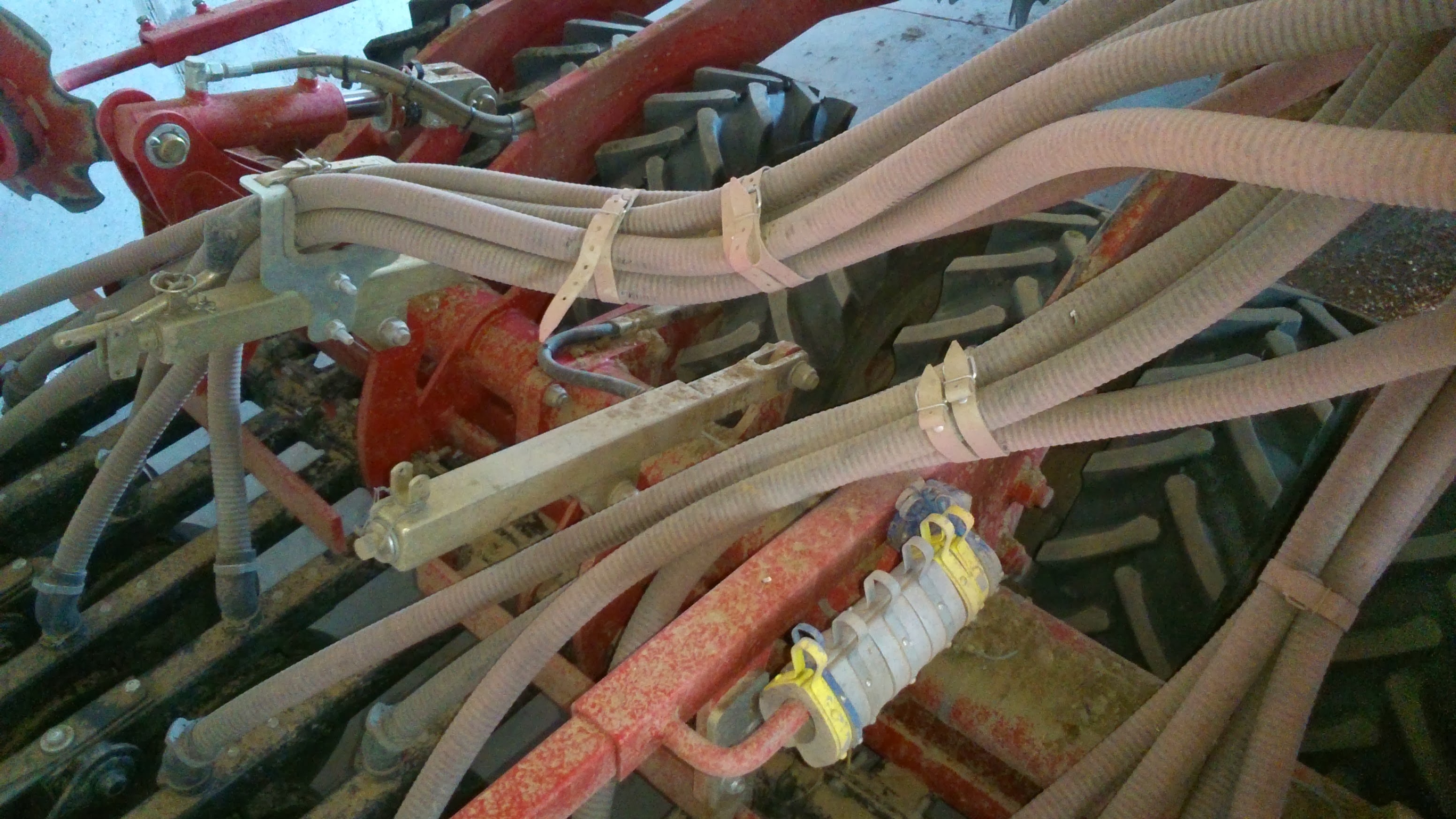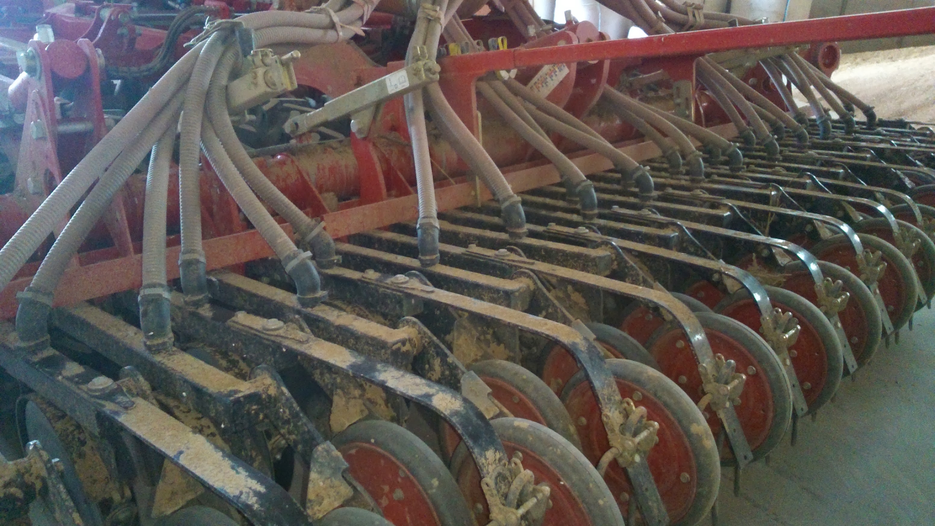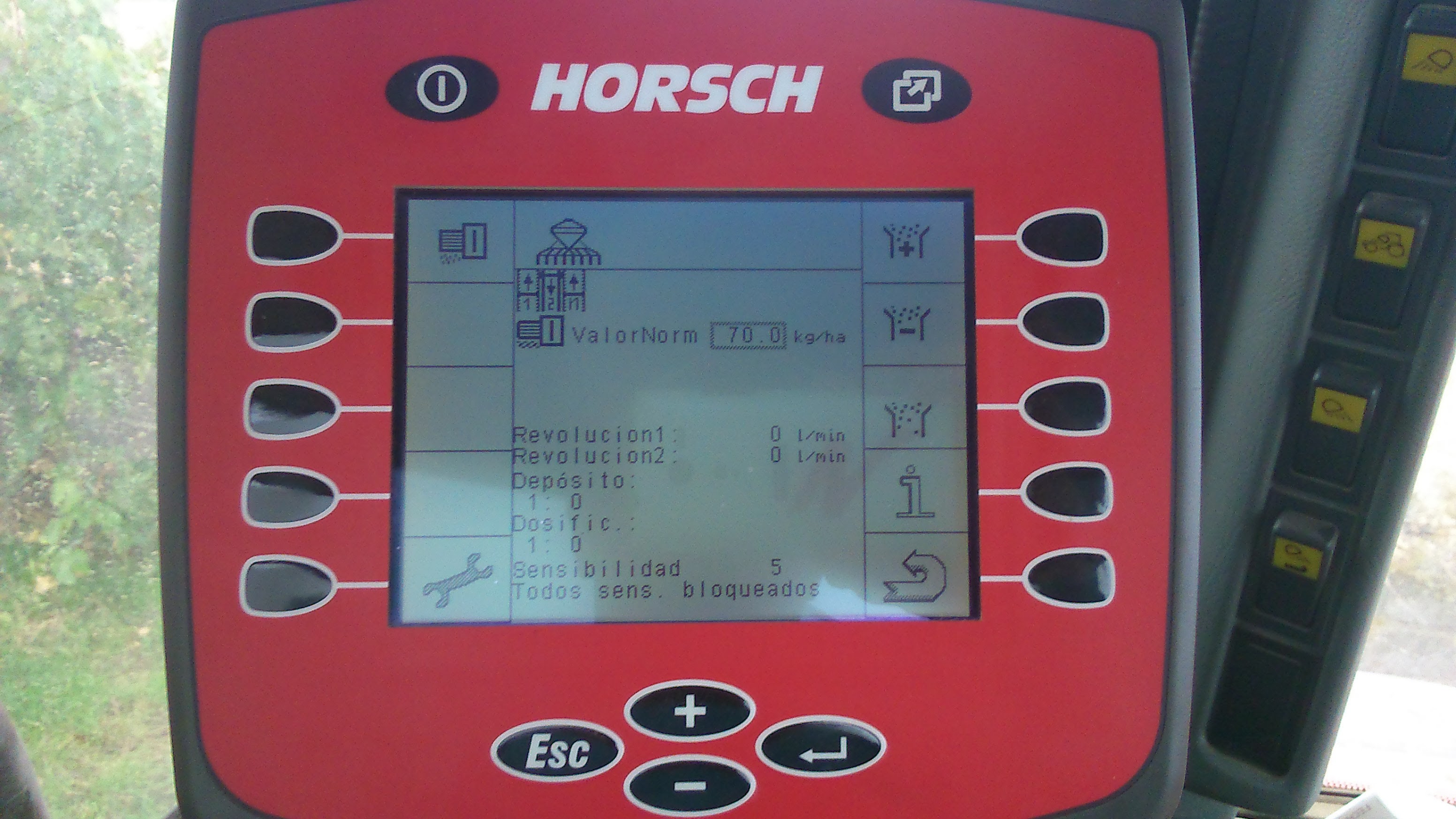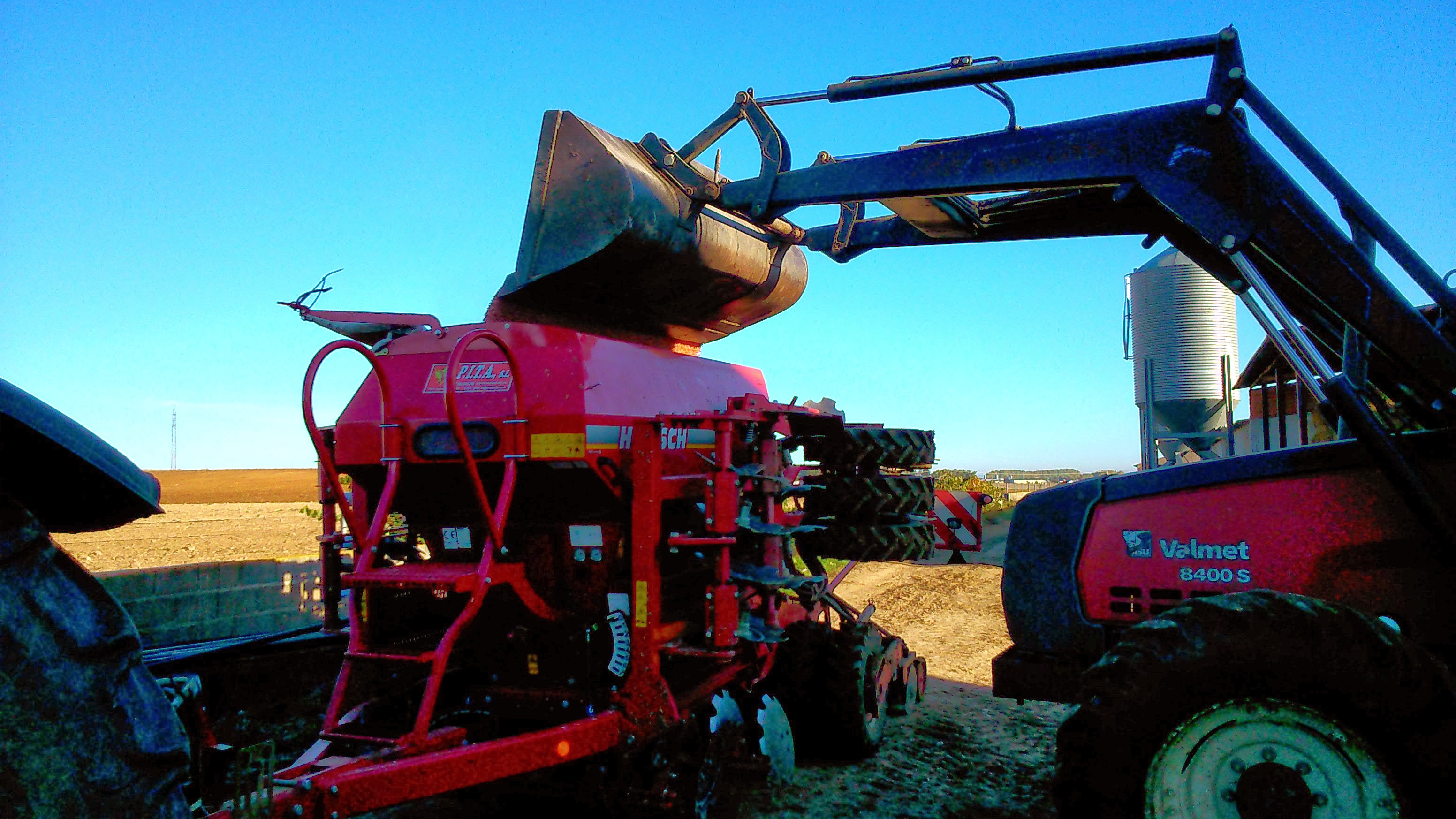 La sembradora tiene 4m de ancho de trabajo (es de 28 surcos con un espacio entre surco de 14,3cm) y una tolva de 2.800 litros, por lo que le permite sembrar unas 14ha de cebada sin parar (la dosis que está utilizando es de 150kg/ha de triticale, 180kg/ha de trigo o 170kg/ha de cebada). La velocidad de trabajo varía según el terreno, estando entre 7km/h y 13km/h. La máquina tiene un peso de 4.600kg y una longitud de 6,9m, por lo que la potencia mínima necesaria del tractor ronda los 160CV (el tiene un Valtra T161 y un Valtra T190). El ordenador que gestiona la máquina le permite seleccionar la dosis a sembrar (nos indica que es sumamente preciso en este punto) según el rodillo de distribución puesto, así como una infinidad de funciones y alarmas (que indican si un surco está obstruido, presión de los discos en el suelo, cerrar los sursos que se desee,…).